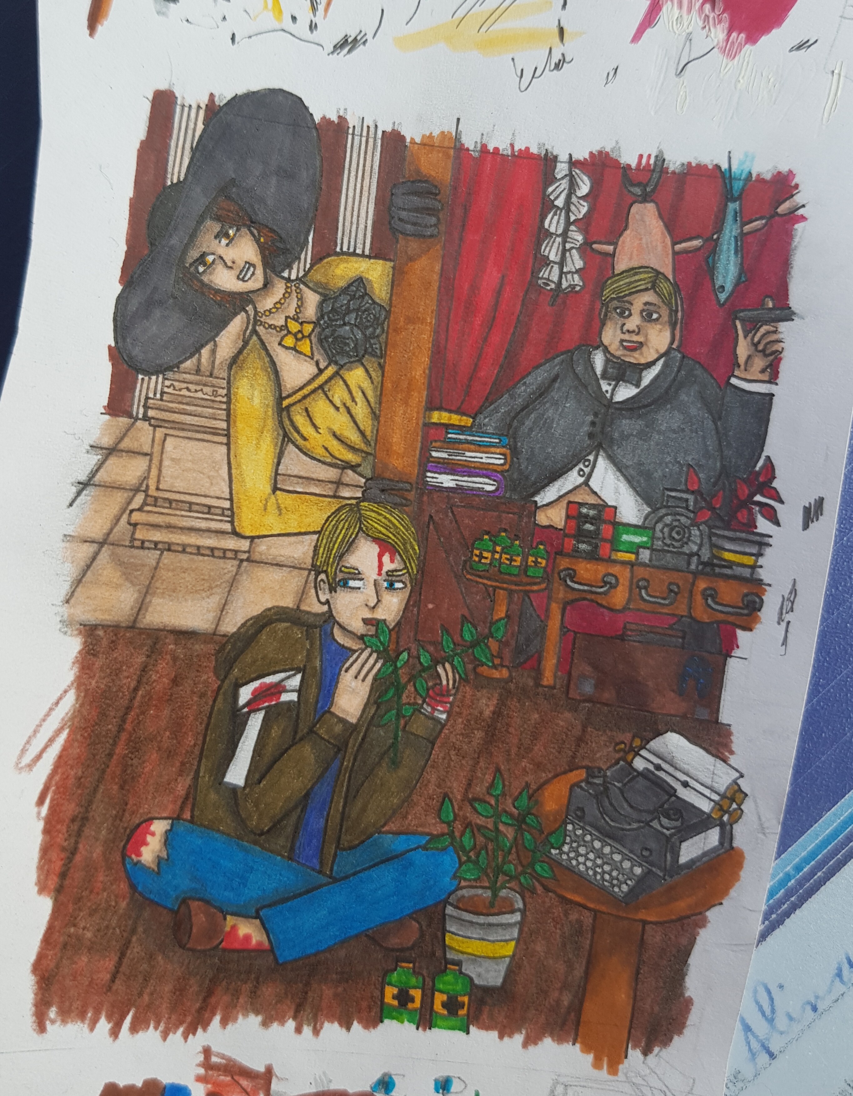 Meine erste Karte ist fertig. Ich habe erstmal meine zweite Skizze ausgearbeitet und hoffe euch gefällt das Ergebnis und die Karte ist so zugelassen. Zu sehen ist Ethan im Saferoom beim Duke wie er verletzt am Heilkraut knabbert XD An der Tür steht eine wütende Lady D. , die ja auf Grund der Spielmechanik nicht in den Raum kann.