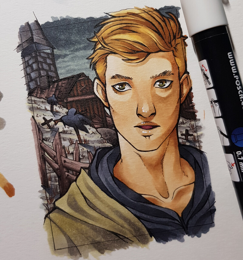 Bei deiner Skizze musst du dir wegen dem Händler keine Gedanken machen. Ich finde nicht, dass seine Pose abgezeichnet wirkt, nur weil du ihn so dargestellt hast, wie er sich im Spiel nunmal verhält :)