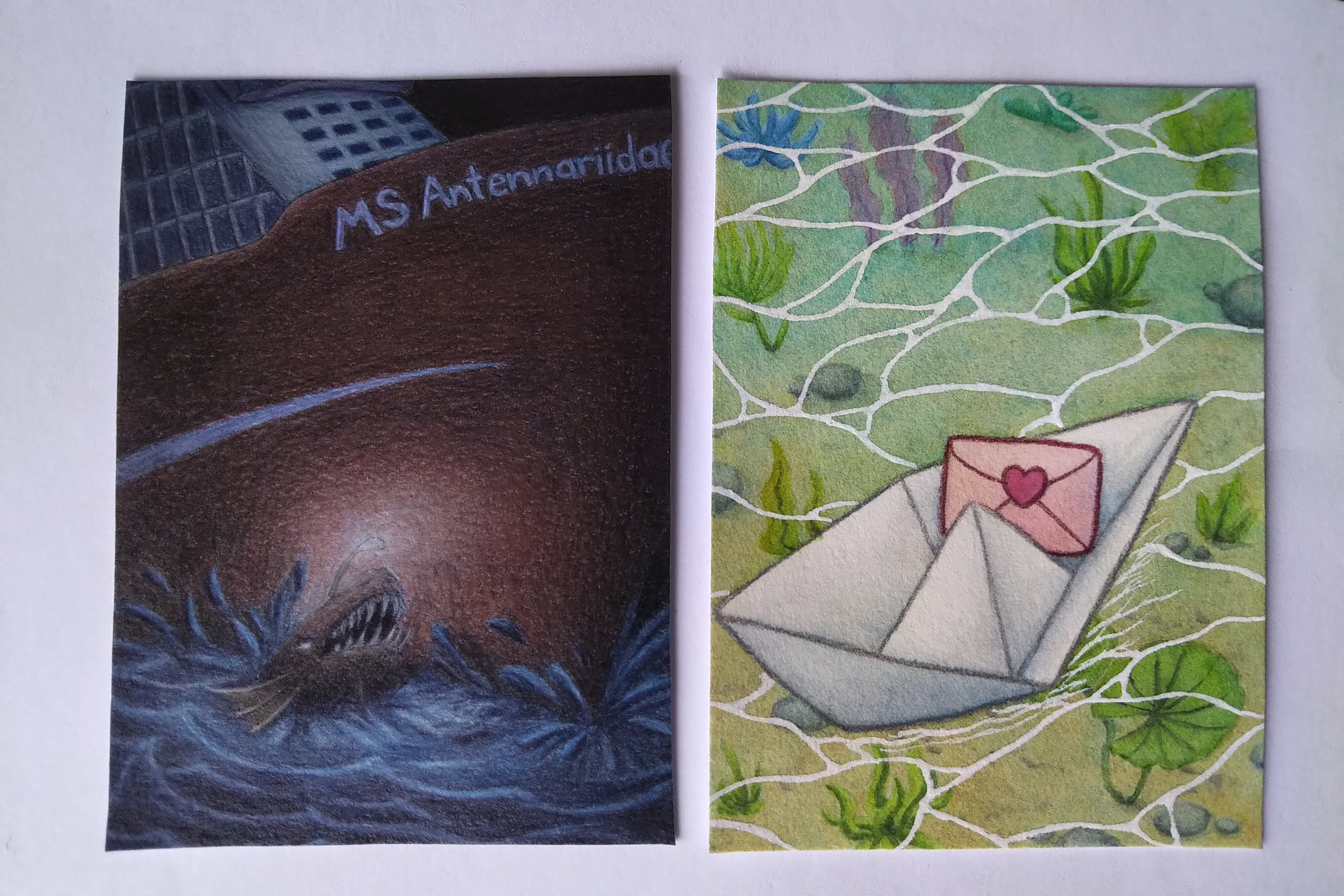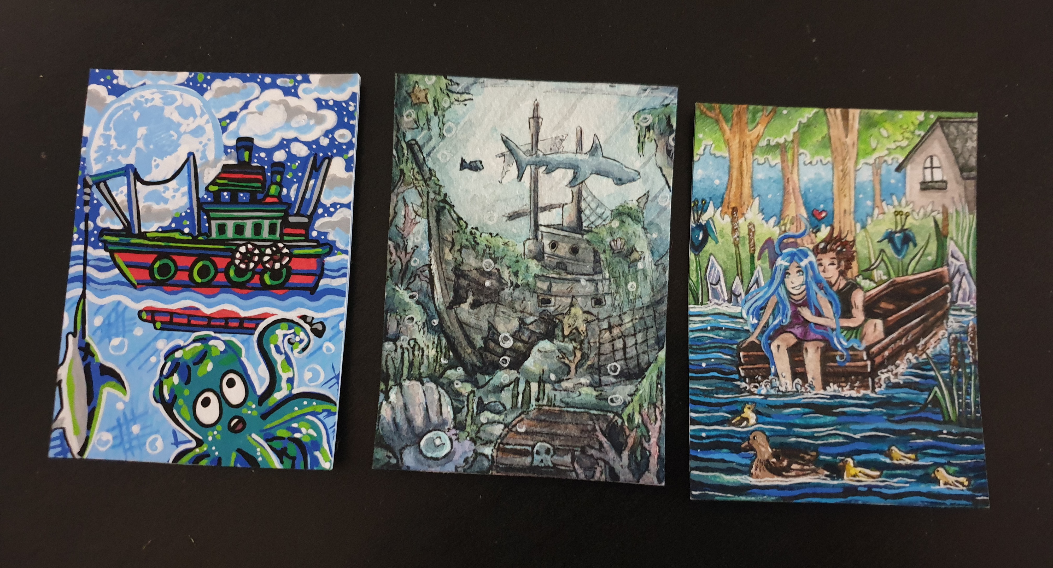 Durch die großzügig verlängerte Zeichenzeit schleiche ich jetzt schon eine Weile um die Aktion herum, Schiffe und Boote sind so ein tolles Motiv. Da ich mich mit geometrischen Dingen aber so schwer tue, hab ich erstmal unverbindlich mit den Karten angefangen: