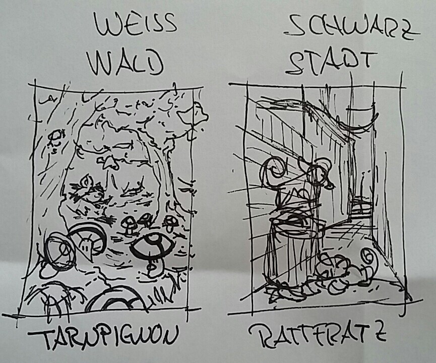 Hier nun meine Ideen als grobe Skizzen umgesetzt. Das Alola Rattfratz in der Stadt ist nur mit Fantasie erkennbar "^^
