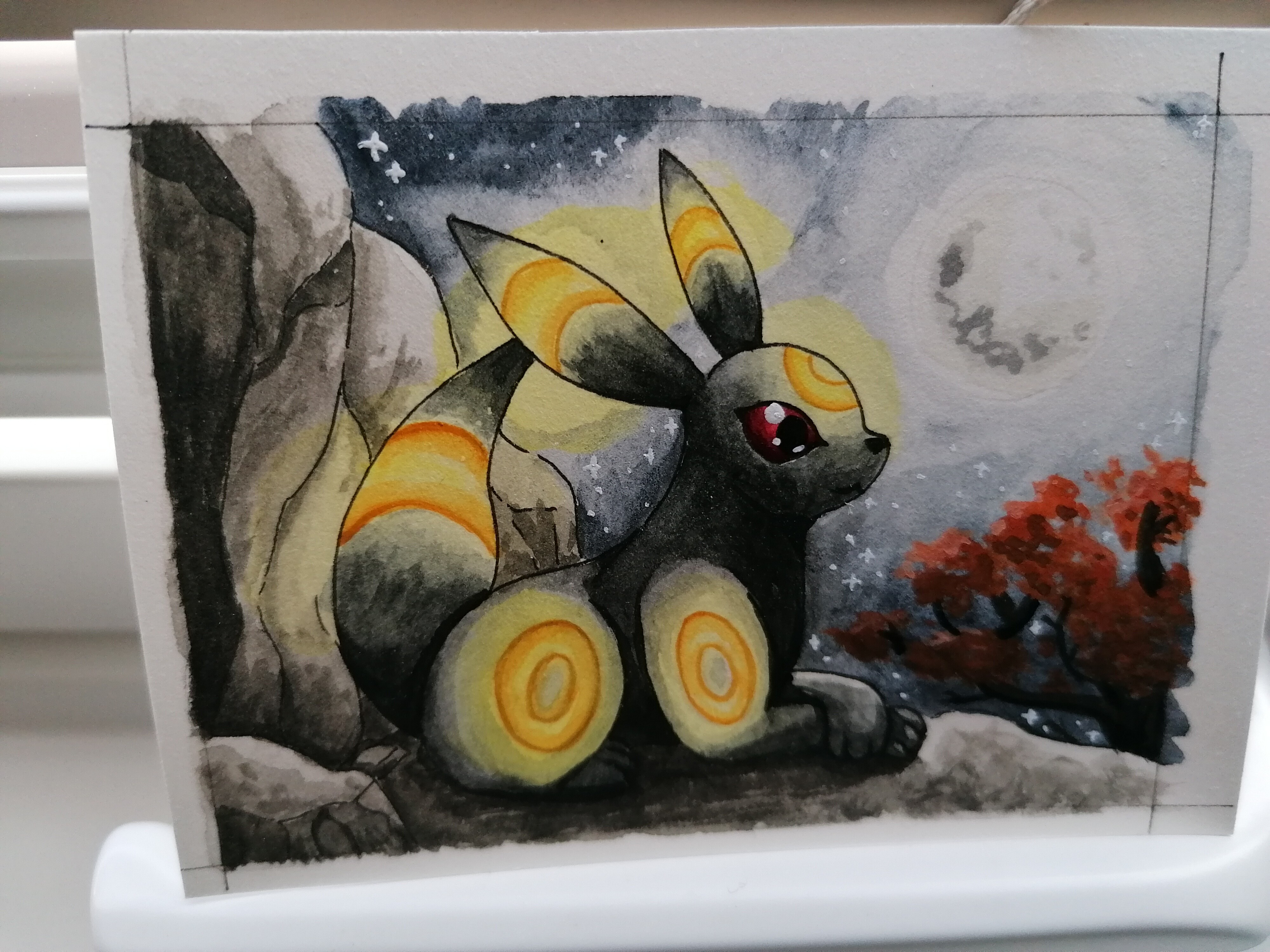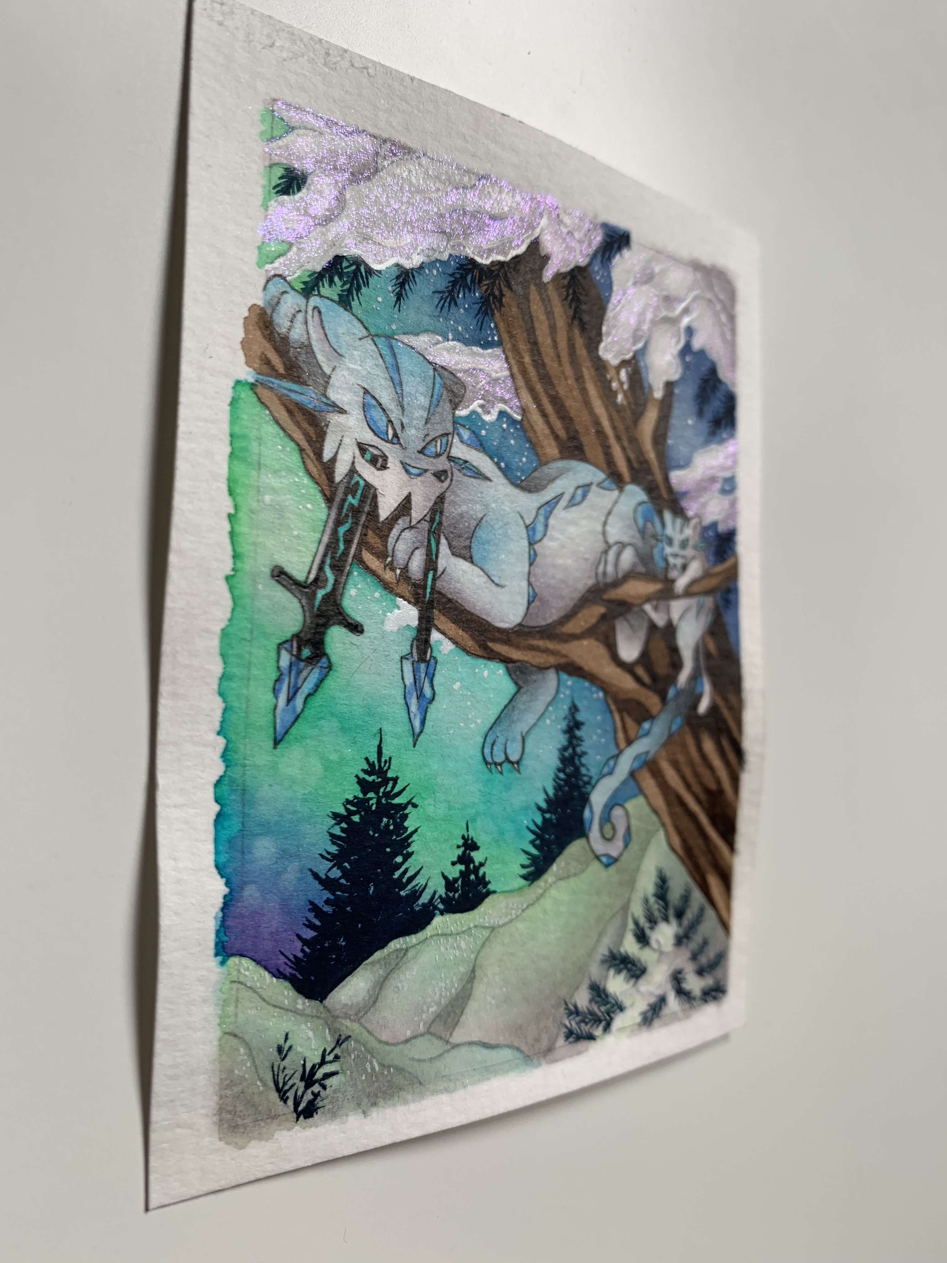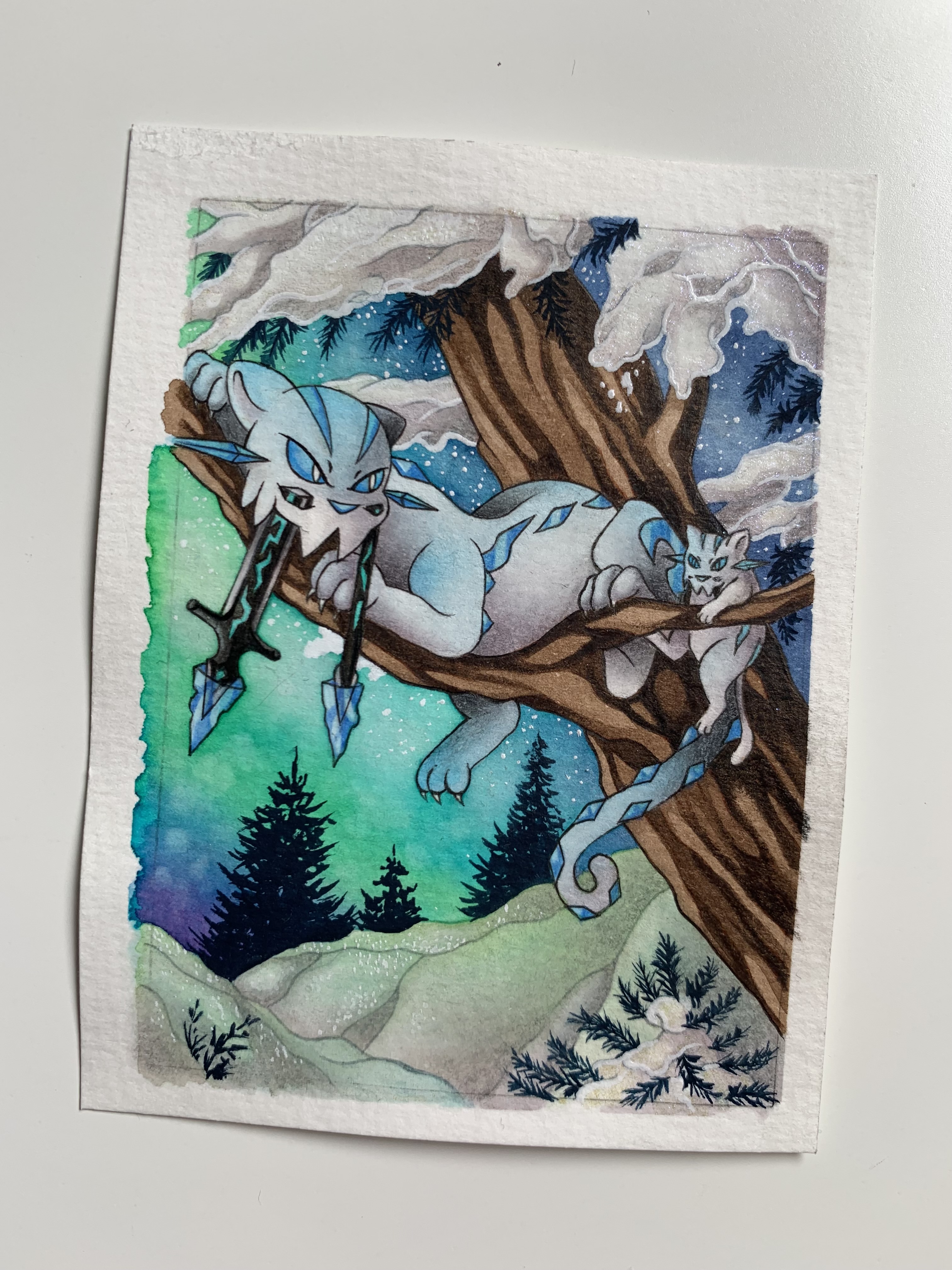 Ich hätte mein erstes Kärtchen auch soweit fertig. :3 Der Schnee auf der Karte hat ein wenig Glitzer Aquarell Farbe bekommen um einen Pulverschnee Effekt zu erzeugen.