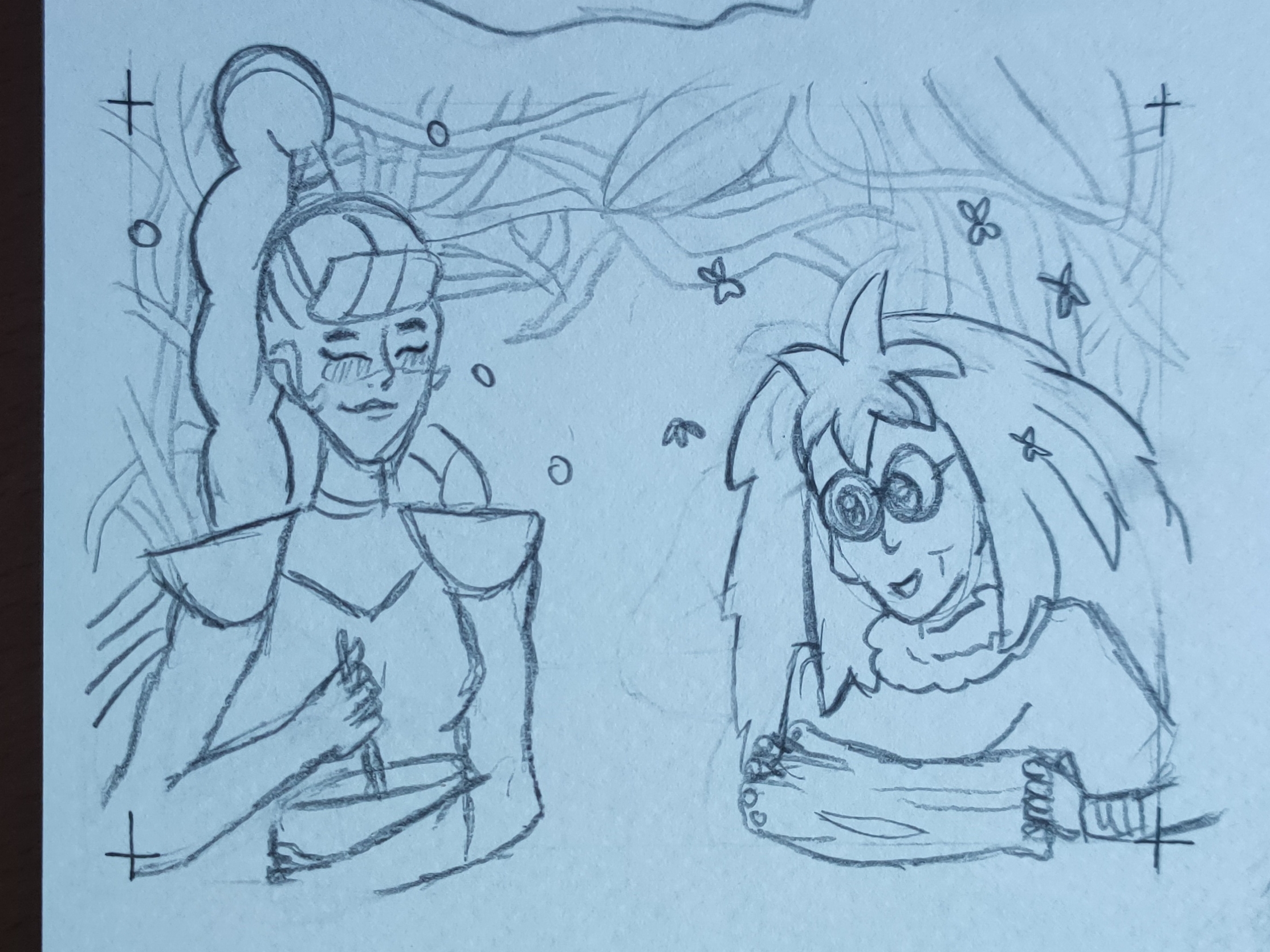 Scorpia und Perfuma. Bin mit den Pflanzen im Vordergrund unzufrieden, ich weiß noch nicht, ob ich eine andere Blume oder einfach Wurzelranken dorthin zeichne… aber die beiden sind wenigstens schon ganz gut zu erkennen. Scorpias Armschere muss ich noch überarbeiten, die Proportion ist nicht ganz richtig (der kleinere Teil ist auf der falschen Seite?