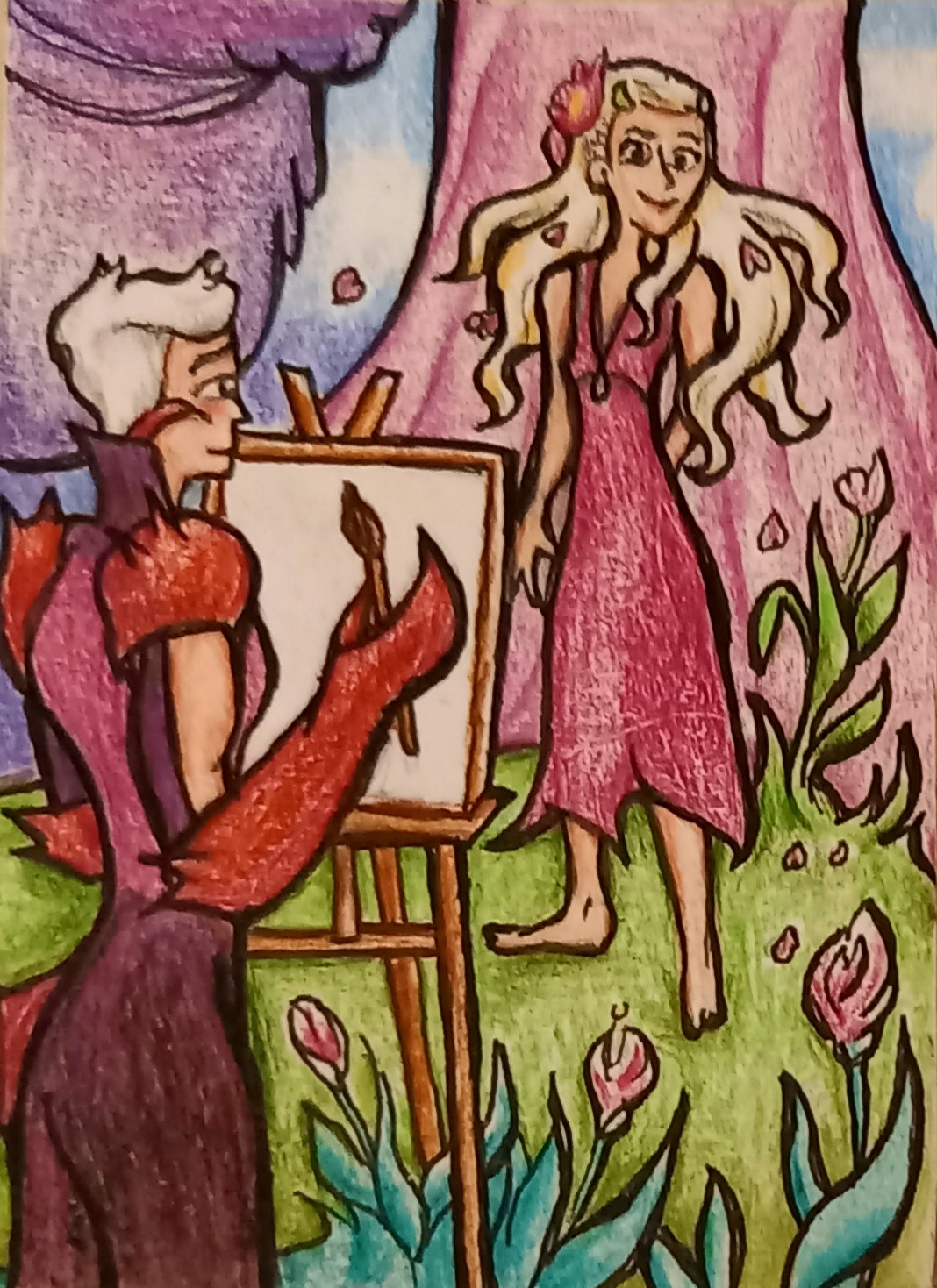 Das sind Buntstifte, das Papier ist dafür leider etwas zu grob (& Fotoquali auch so meh), ich muss mich um geeigneteres Papier kümmern, auch um einen feineren Pen (0.2 oder 0.1), der verwendete ist 0.3, und bei den Augen zB war das schon schwierig. Und naja, ich besitze zwar einen Scanner, aber der war ein Fehlkauf (Epson XP-215) und funktioniert nicht.