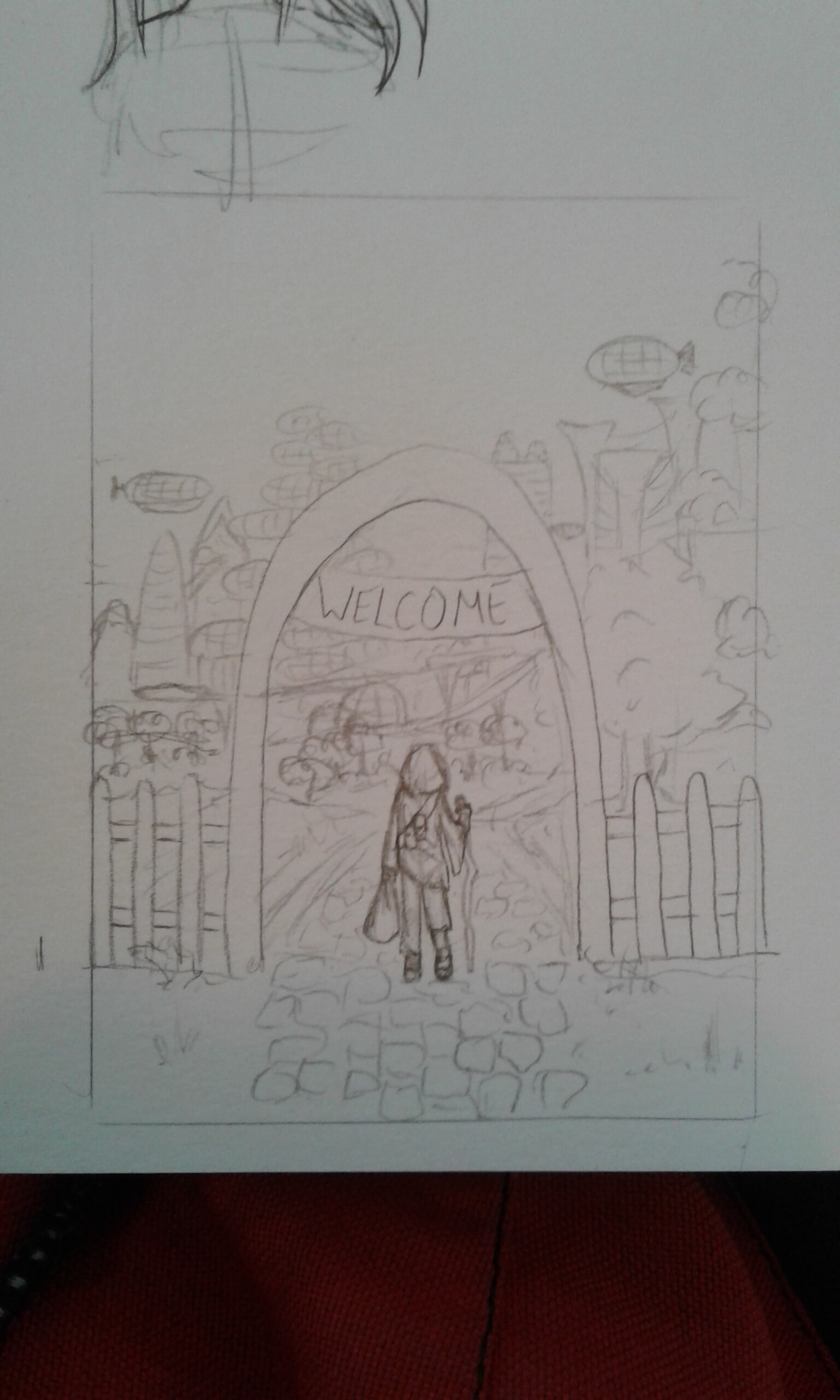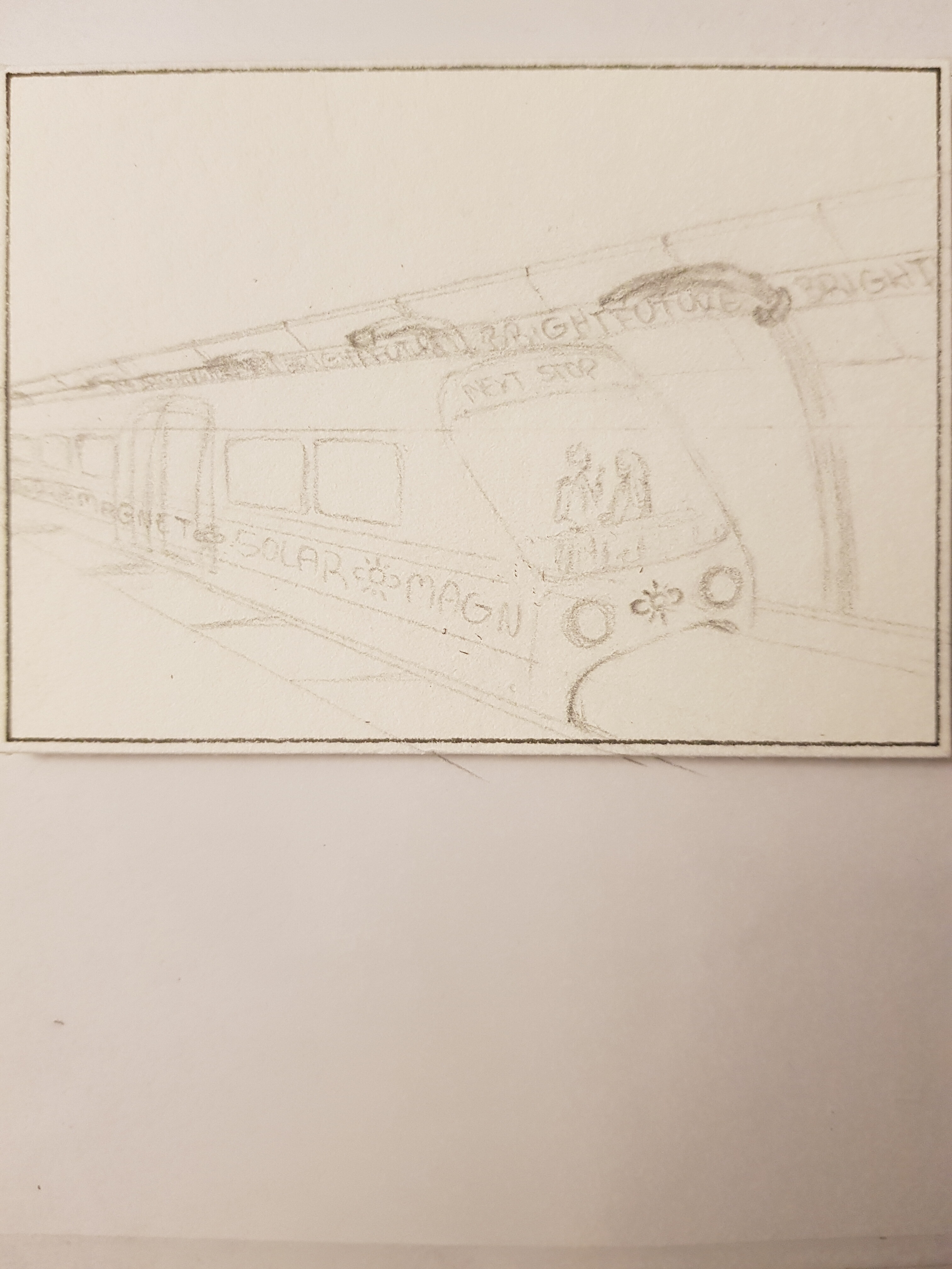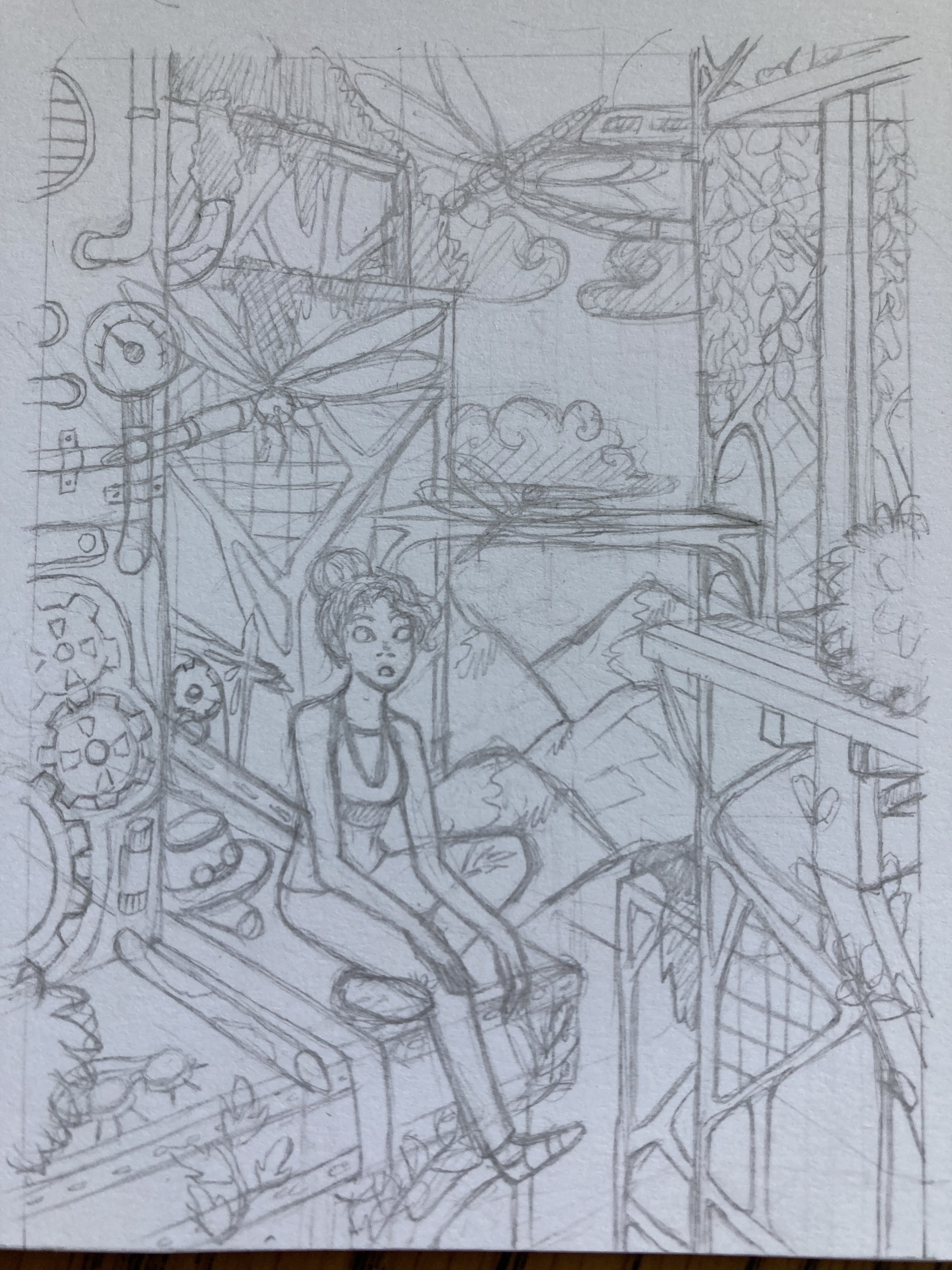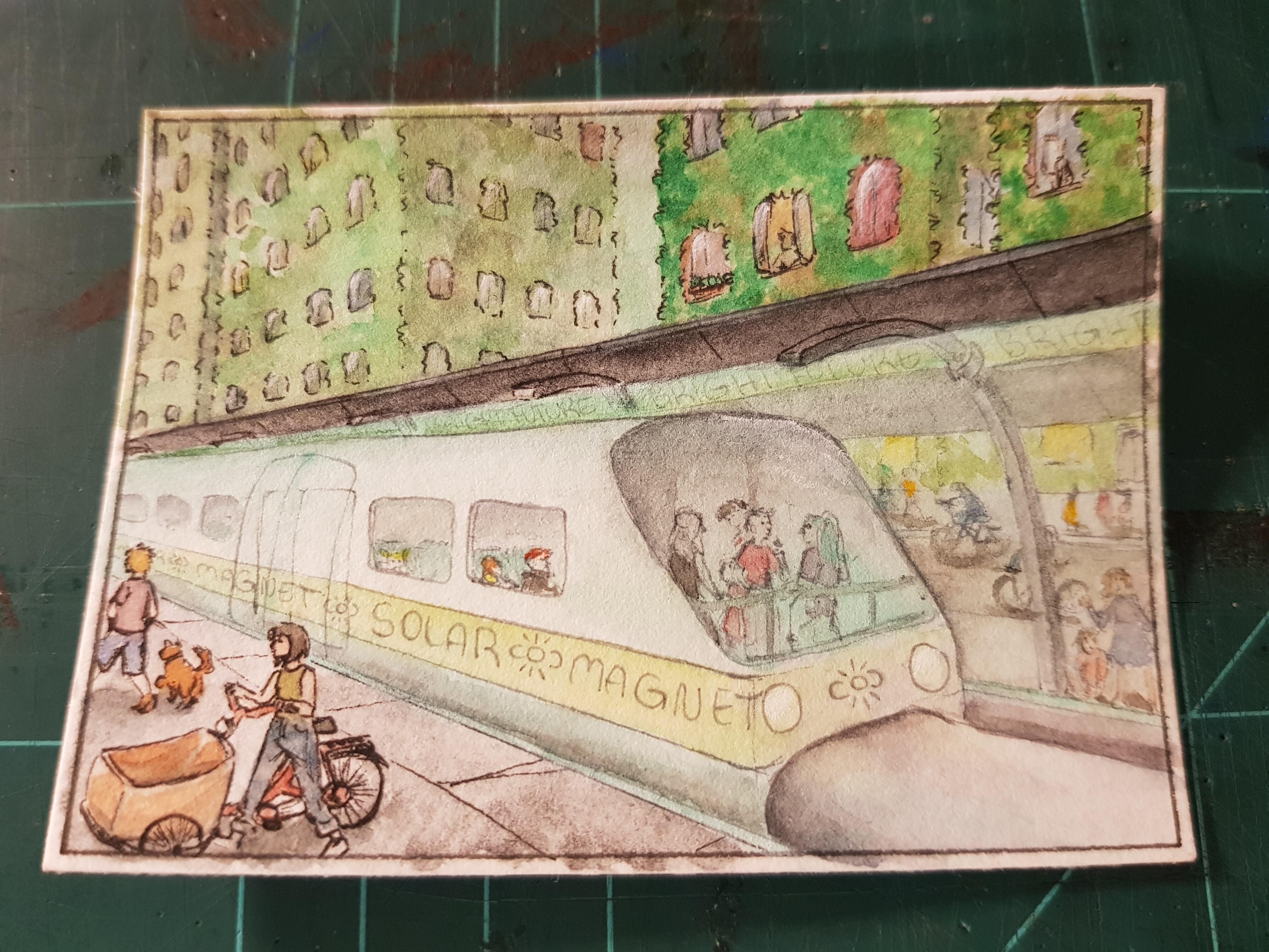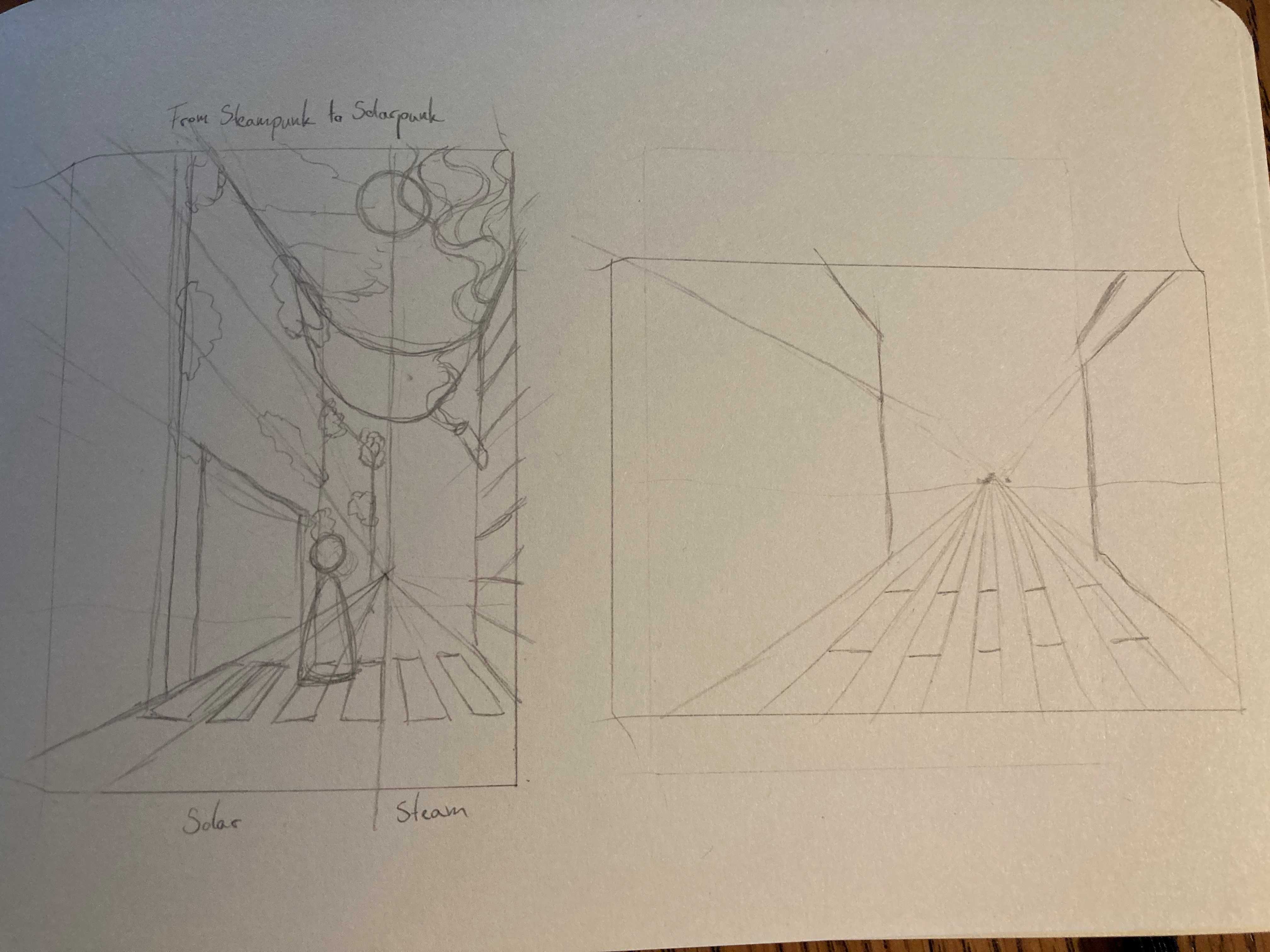 - wie unten zu sehen, jemanden zeigen der quasi von der Steampunk zur Solarpunk Seite läuft.