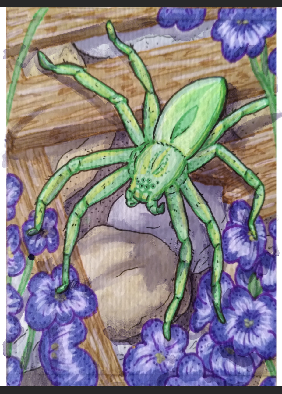 Die Huschspinne ist toll geworden, ich mag vor allem wie vielschichtig der Untergrund ist auf dem sie herumkrabbelt. <3