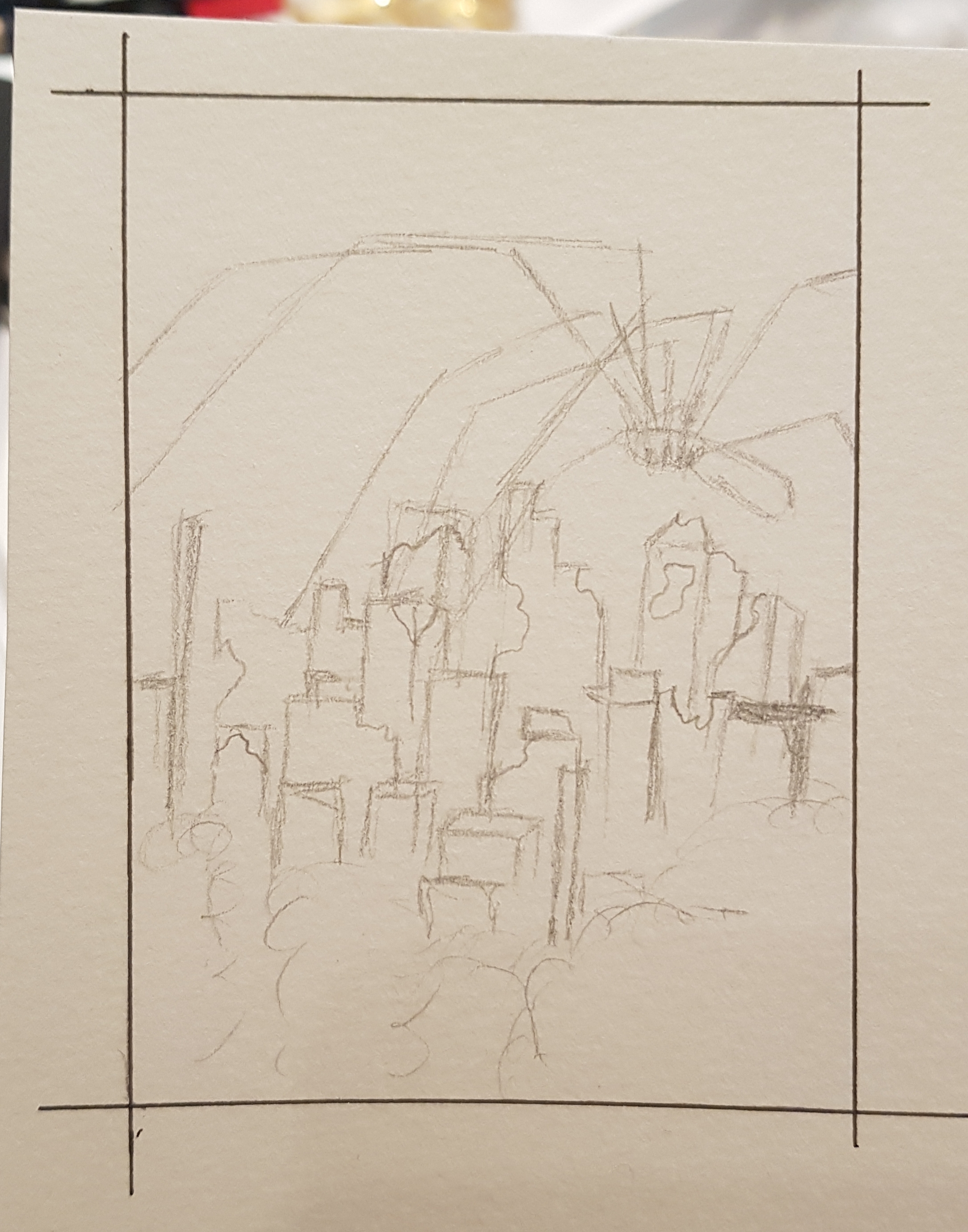 Ich glaub diese Karte könnte noch von bisschen Aquarell im Himmel profitieren, damit die Rauchwolken weicher und wolkiger aussehen, vielleicht sogar mit nem etwas gelb/orangen Grauton, damit es noch apokalyptischer und als würde die Stadt in Flammen stehen wirkt. Oder du könntest versuchen sie mit nem Wattestäbchen oder weißen Buntstift zu verblenden?