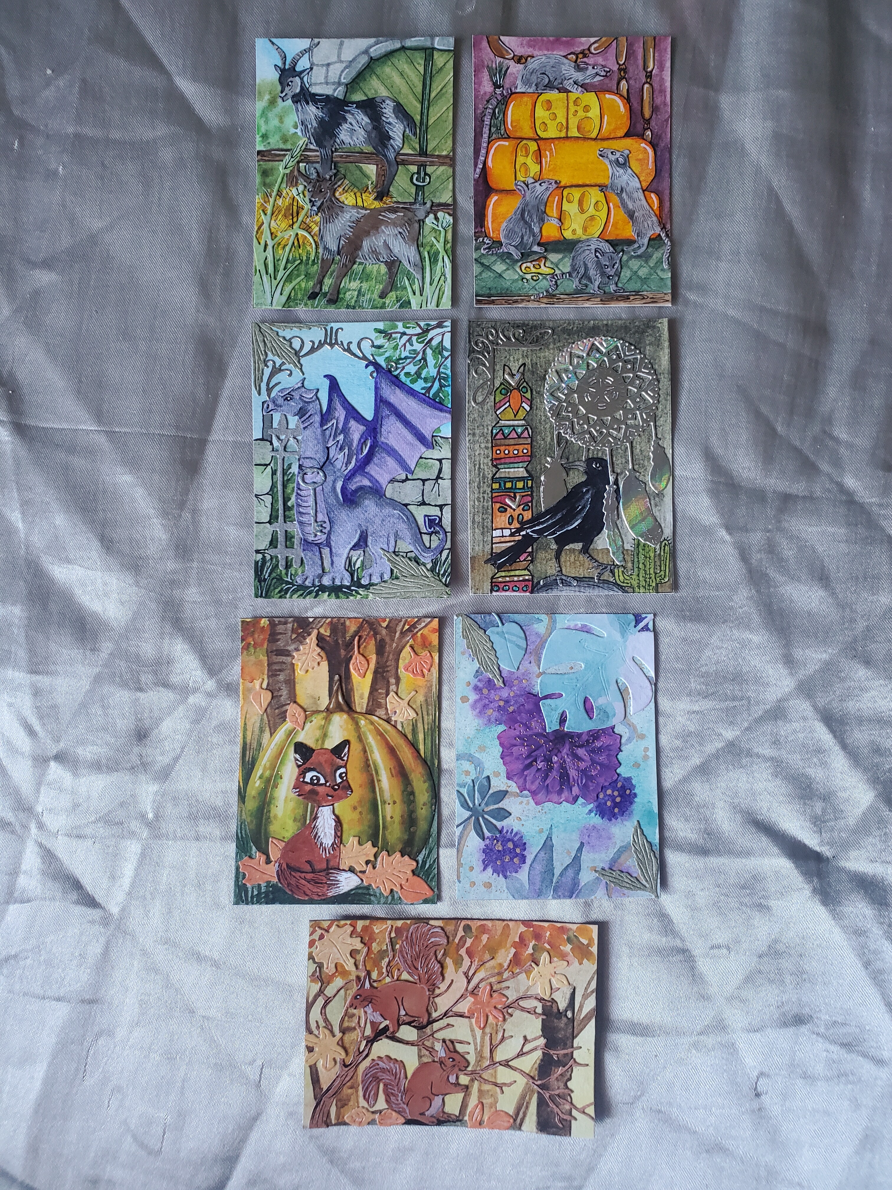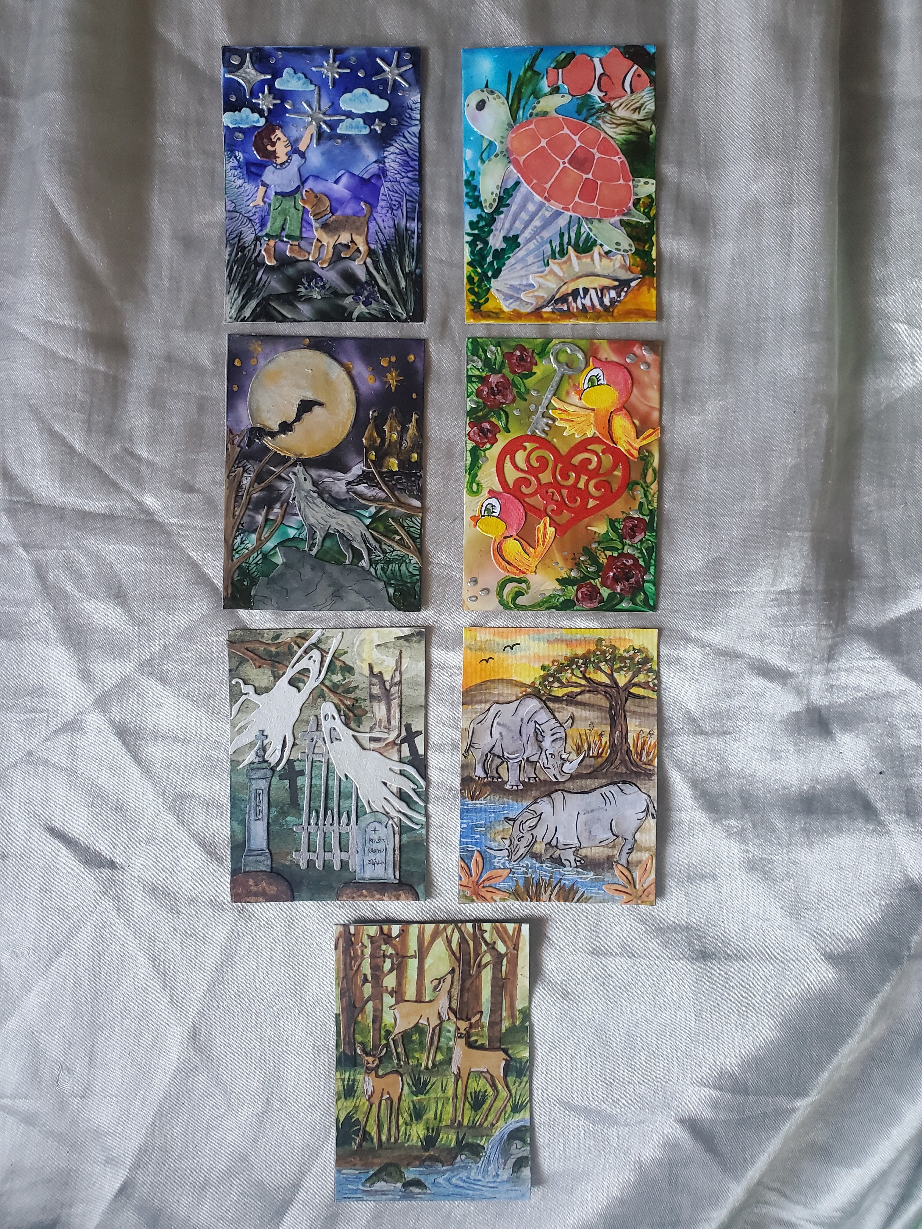Auf den unteren Bild sind die ersten vier Karten mit Enkaustik und daher mit einer dünnen Lackschicht überzogen.