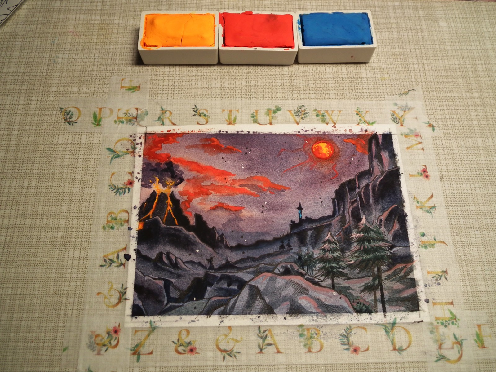 Der Blutmond hat mich auch sehr fasziniert (und beim ersten Mal erschreckt x’D), darum wollte ich dazu auch eine Karte malen, inklusive Todesberg. Wusstet ihr, dass er während Blutmondnächten Asche in die Luft spuckt? Ist ziiiiiemlich creepy.