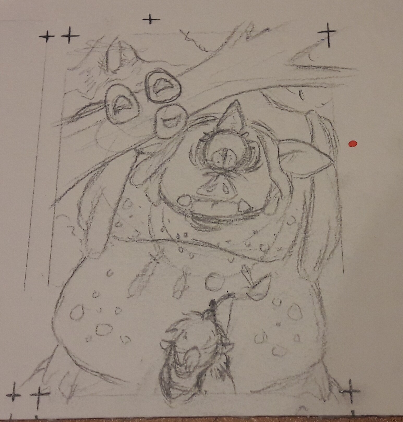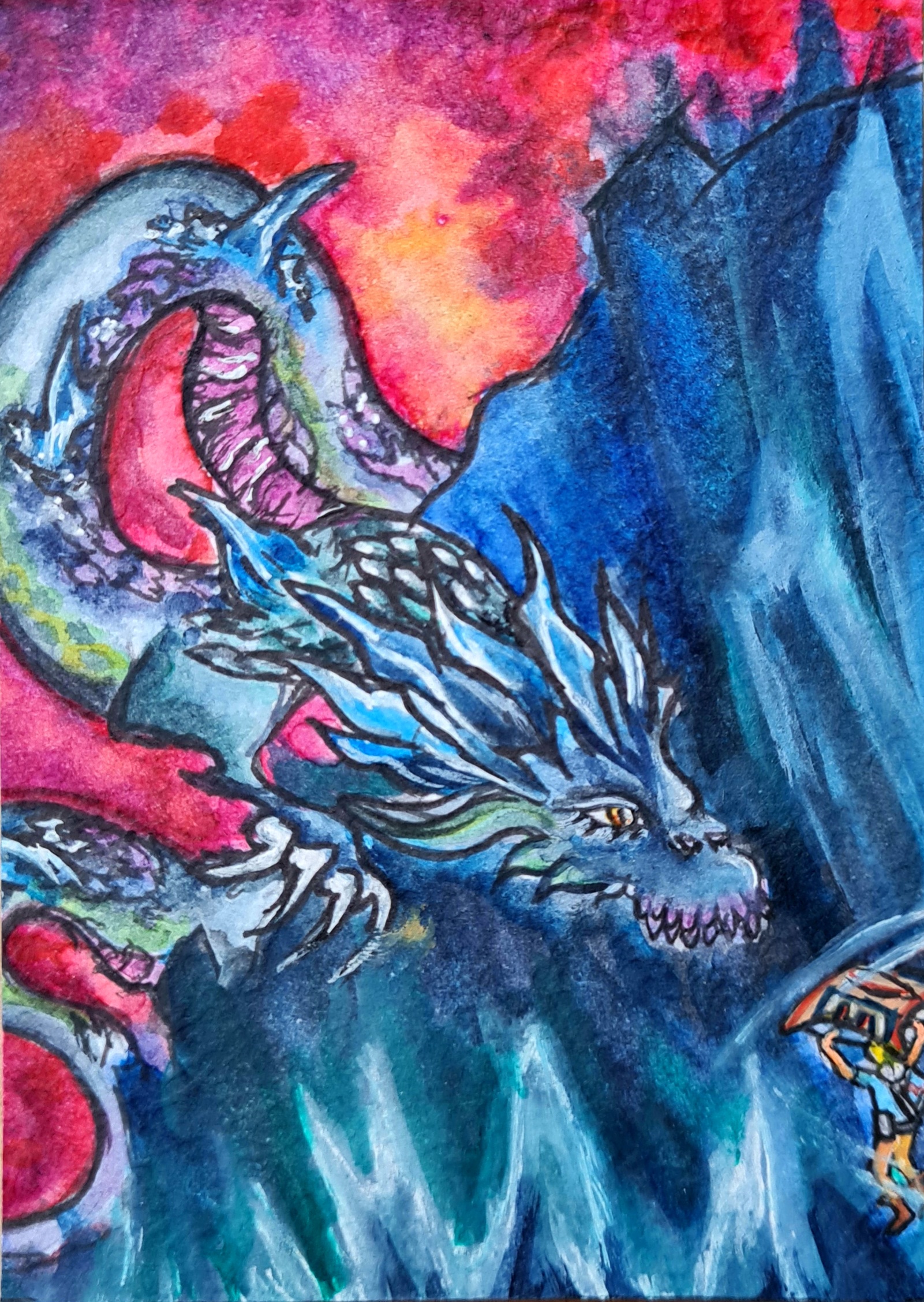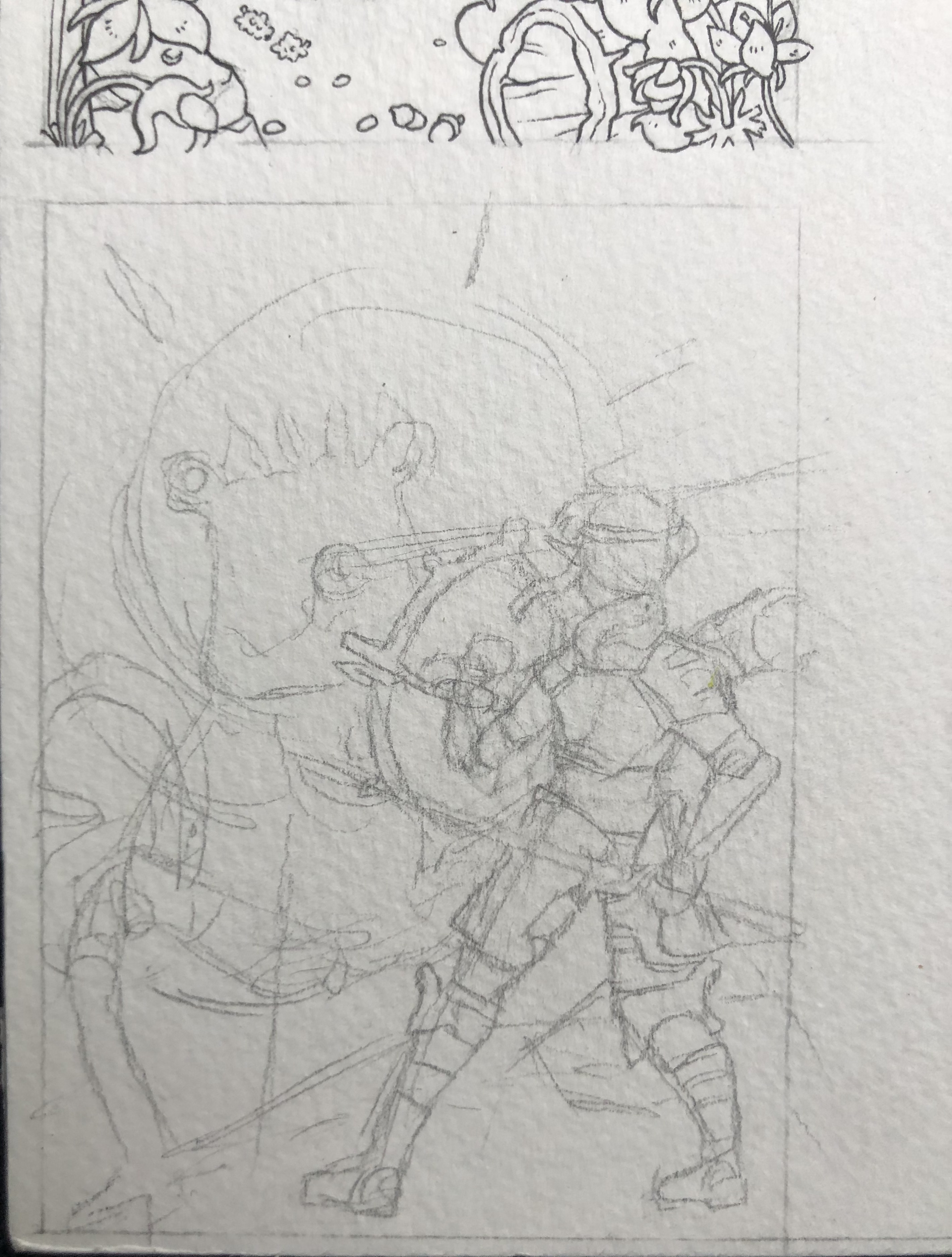 Eine Skizze, yay! Ich hatte die Befürchtung, dass all meine Karten sehr ruhig werden (ich renne im Spiel gern durch die Gegend und erkunde, statt zu kämpfen). Also hab ich mich an einer Kampfszene versucht :D