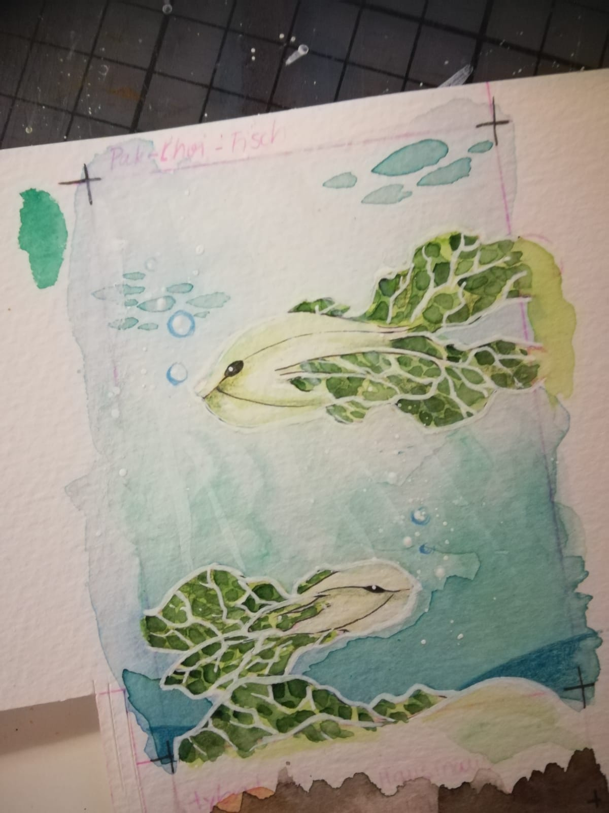 rechts unten: Schwan + Banane. Auf dieser Skizze schwimmt der Schwan noch im Wasser, aber mir kam danach die Idee, den Schwan in eine Bananenkiste zu setzen. Quasi als blinder Passagier