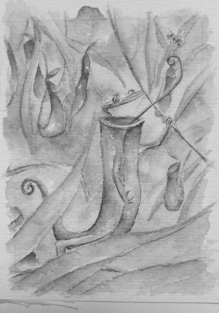 rechts oben: Echse + Kannenpflanze. Ich habe schon beschlossen statt irgendeine Echse besser ein Chamäleon zu nehmen, da die so auffällige Augen und Füße haben. Damit man auch erkennen kann, was genau es sein soll.