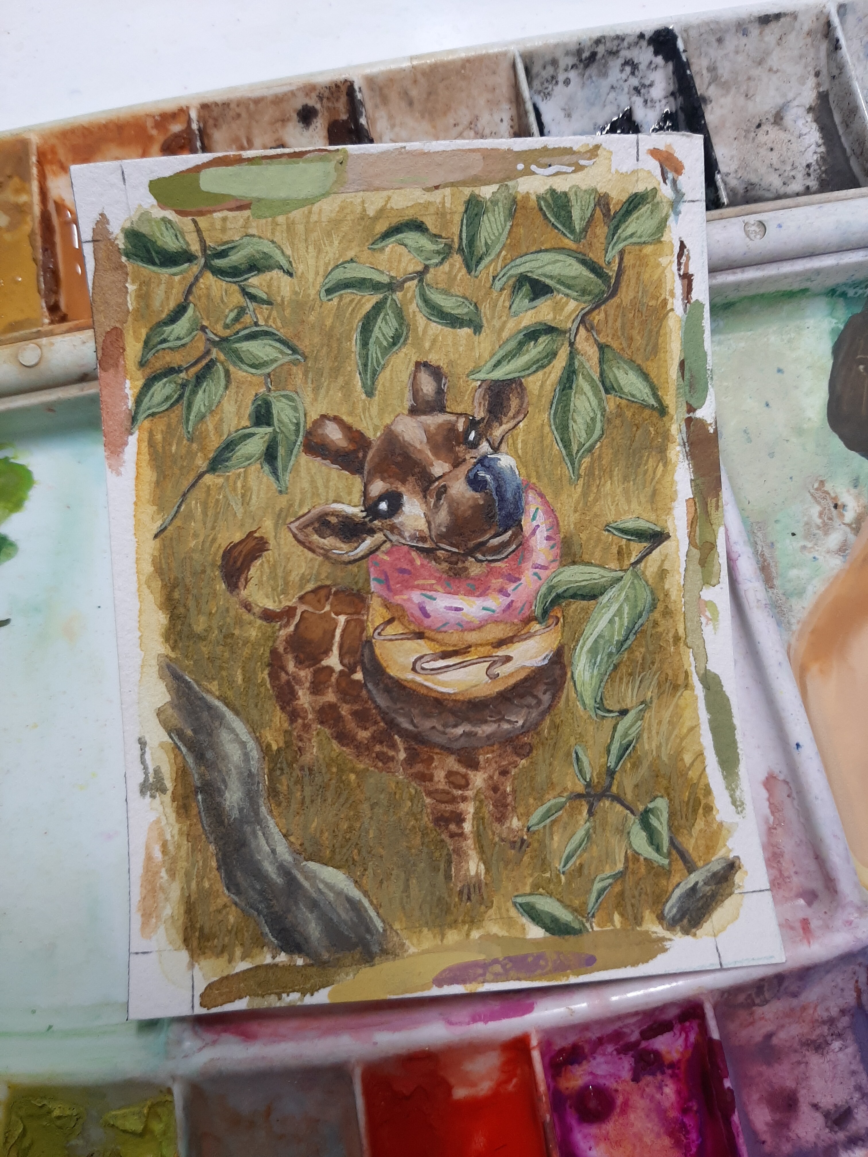 Das einzige was mir auffĂ€llt, vielleicht hebst du bei der Giraffe die BlĂ€tter und den Kopf noch mit ein bisschen stĂ€rkeren Highlights oder ein paar strichen mit Liner hervor? Das war auf den ersten blick fĂŒr mich ein sehr smoother ĂŒbergang zum Hintergrund. Ich denke, ein kleines bisschen stĂ€rkere abgrenzung wĂŒrde die tiefe des Bildes gut unterstĂŒtzen.