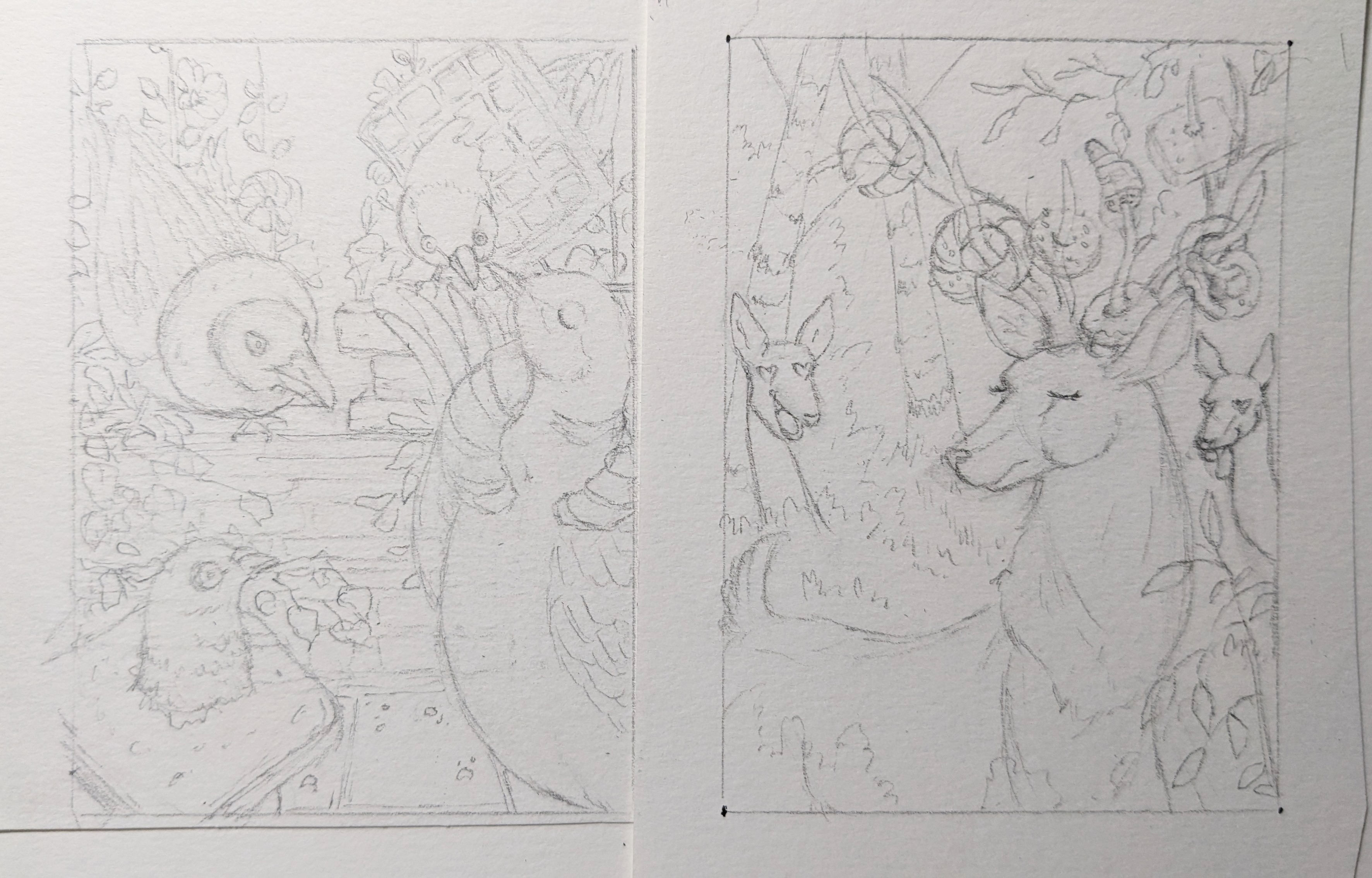 Hier sind übrigens meine Skizzen von zwei der Karten. Die will ich unbedingt fertig machen.