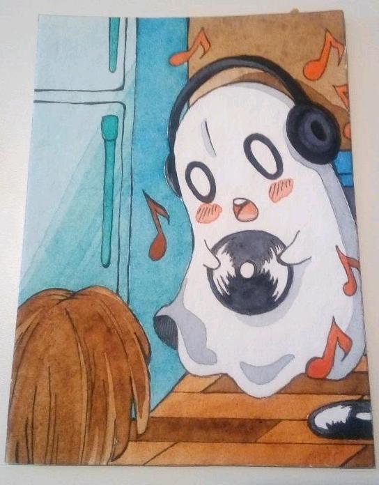 Nabstablook! :D In seinem Haus. Und einen Frisk habe ich auch schon mit draufgemogelt. Es wird von mir aber noch eine Karte mit Frisk als Hauptmotiv geben <3