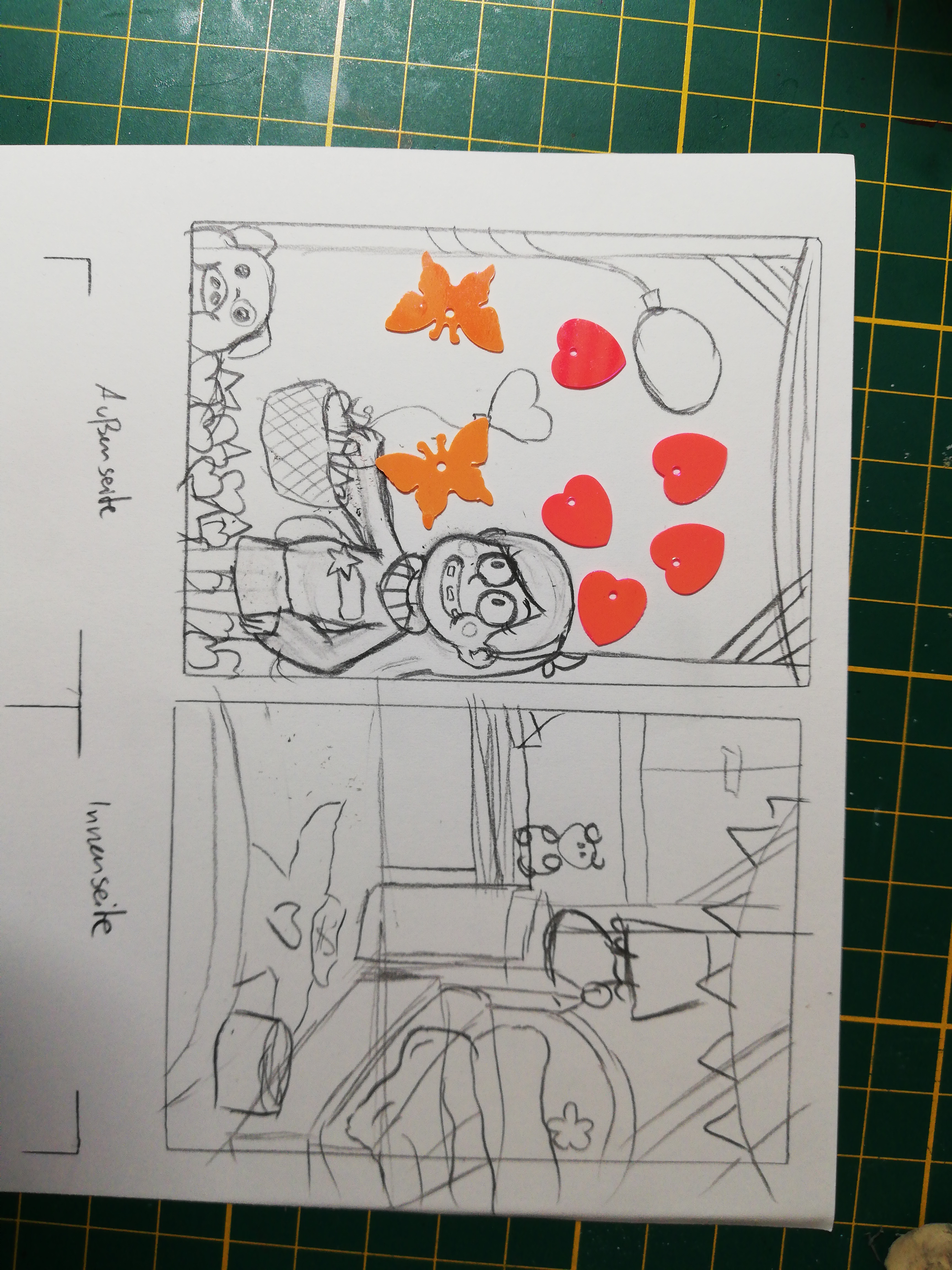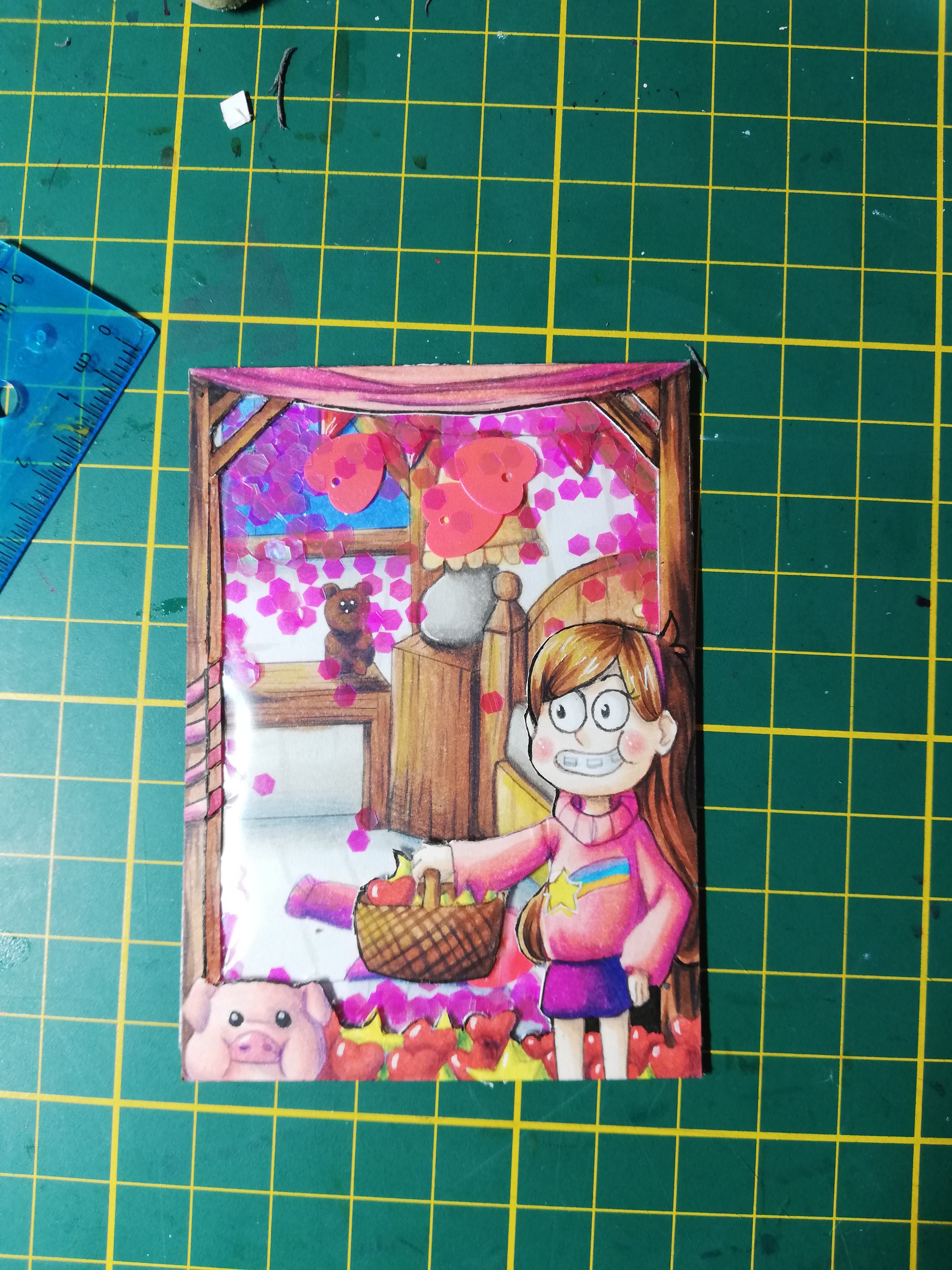 Meine erste Idee endlich mal auf Papier xD es soll eine schuttelkakao werden, bei der Mabel Konfetti im Zimmer für ne Party verteilt xD ich hab momentan leider nur diese pallietten und glitzerpallietten. Ich glaube ich nehme dann lieber das Glitzer :D Rahmen und innenmotiv