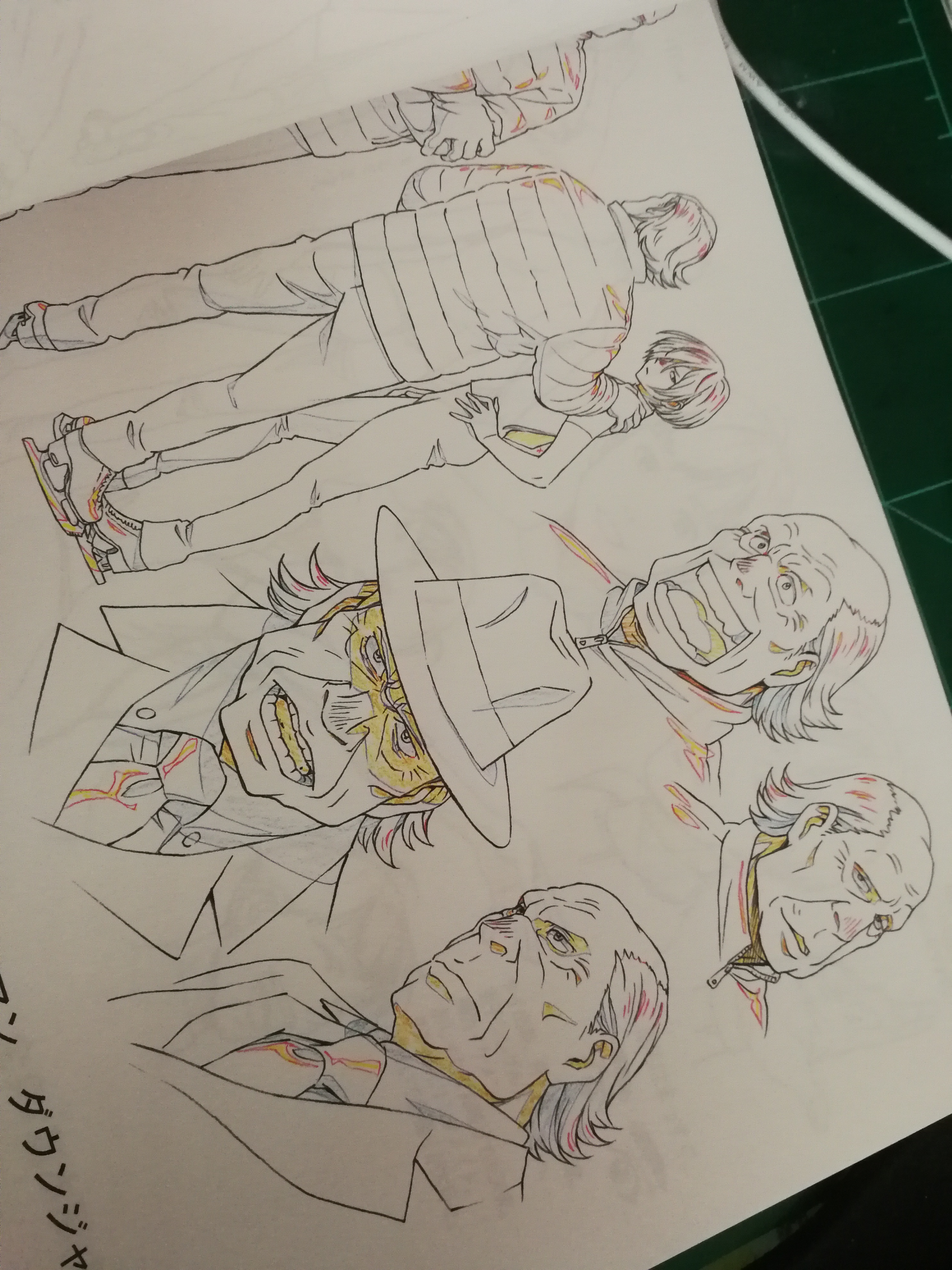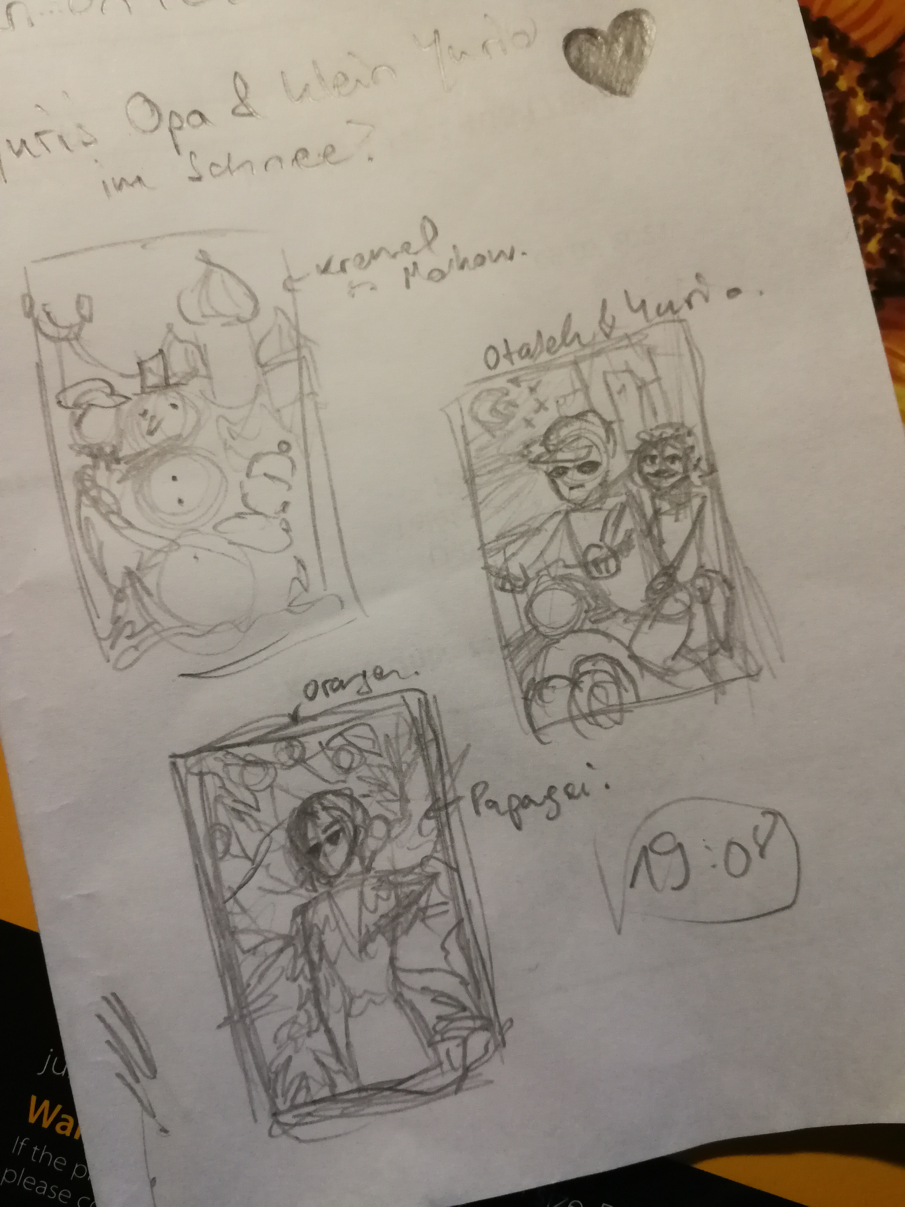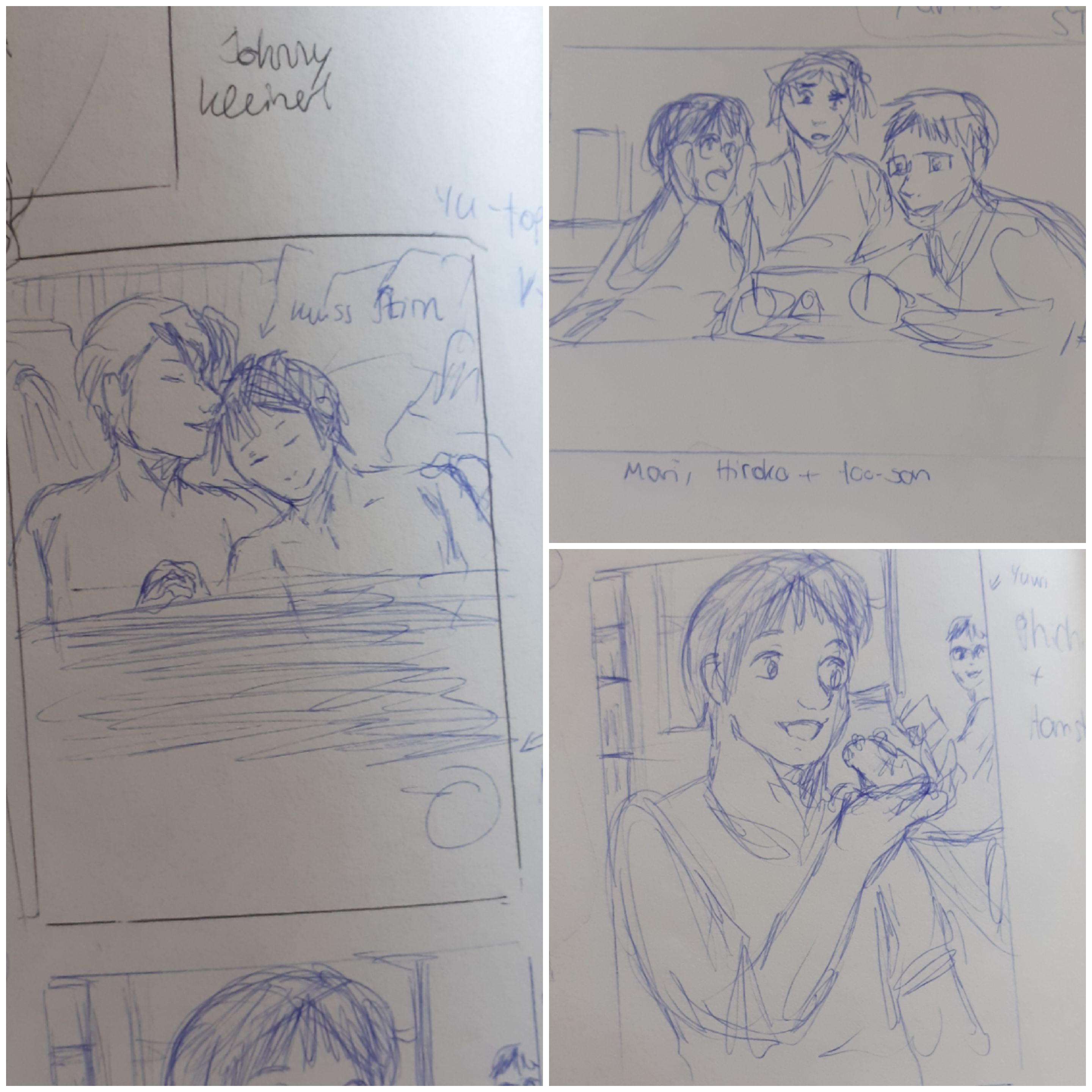 Dritte Skizze ist noch nicht sicher, ich hatte überlegt ne zukünftige Siegerehrung der Podiumsfamilie darzustellen - Selfie vom Podium - bin aber noch unzufrieden. Oder halt freundschaftliche Otayuri Szene… mal gucken…