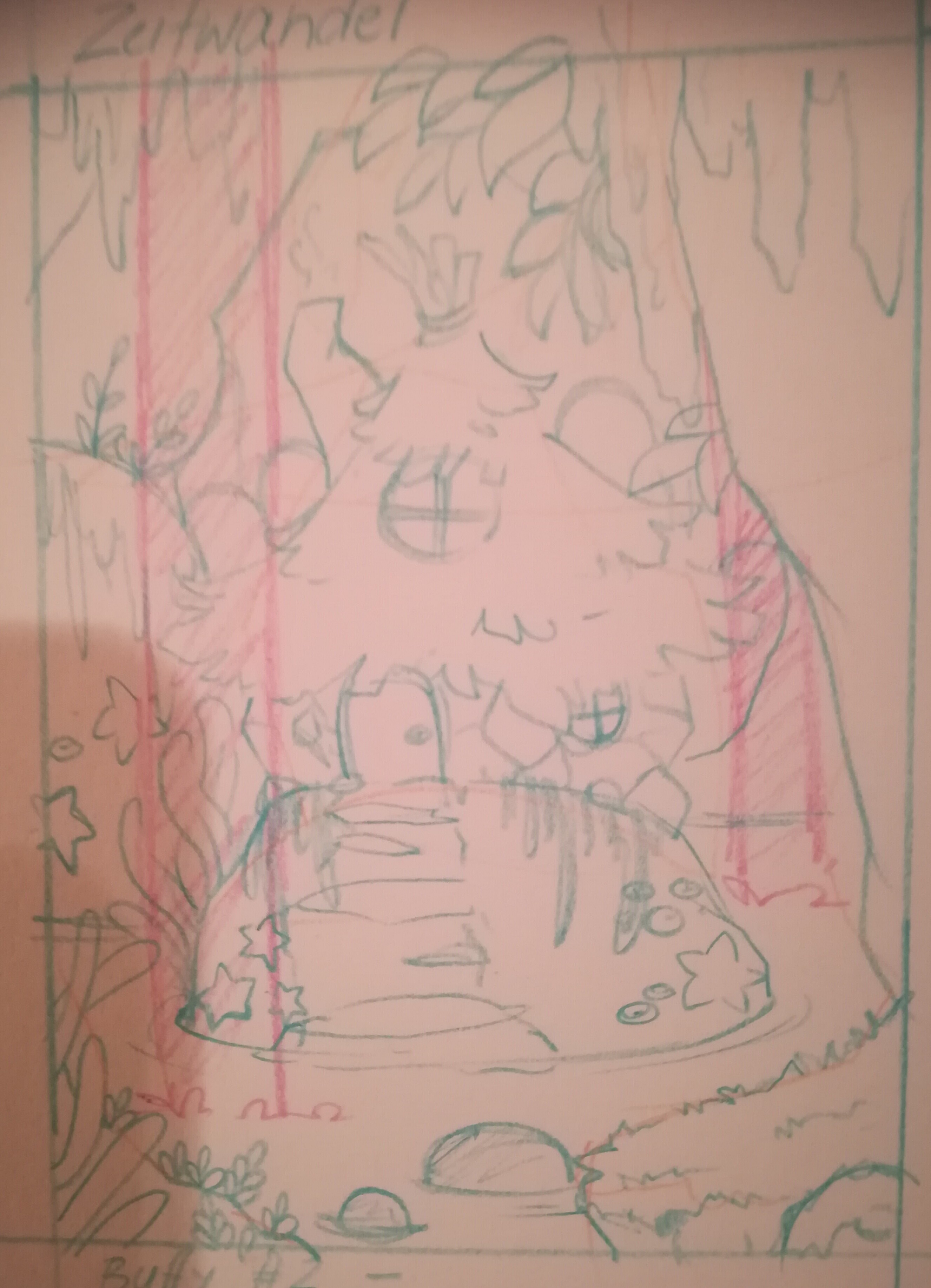 Hätte meine Skizze soweit auch fertig. Für die einzelnen Zeiten werden dann noch ein paar kleine Kreaturen hinzugefügt, aber tendenziell wärs das soweit. Eine kleine schiefe Hütte in einer überwachsenden Höhle