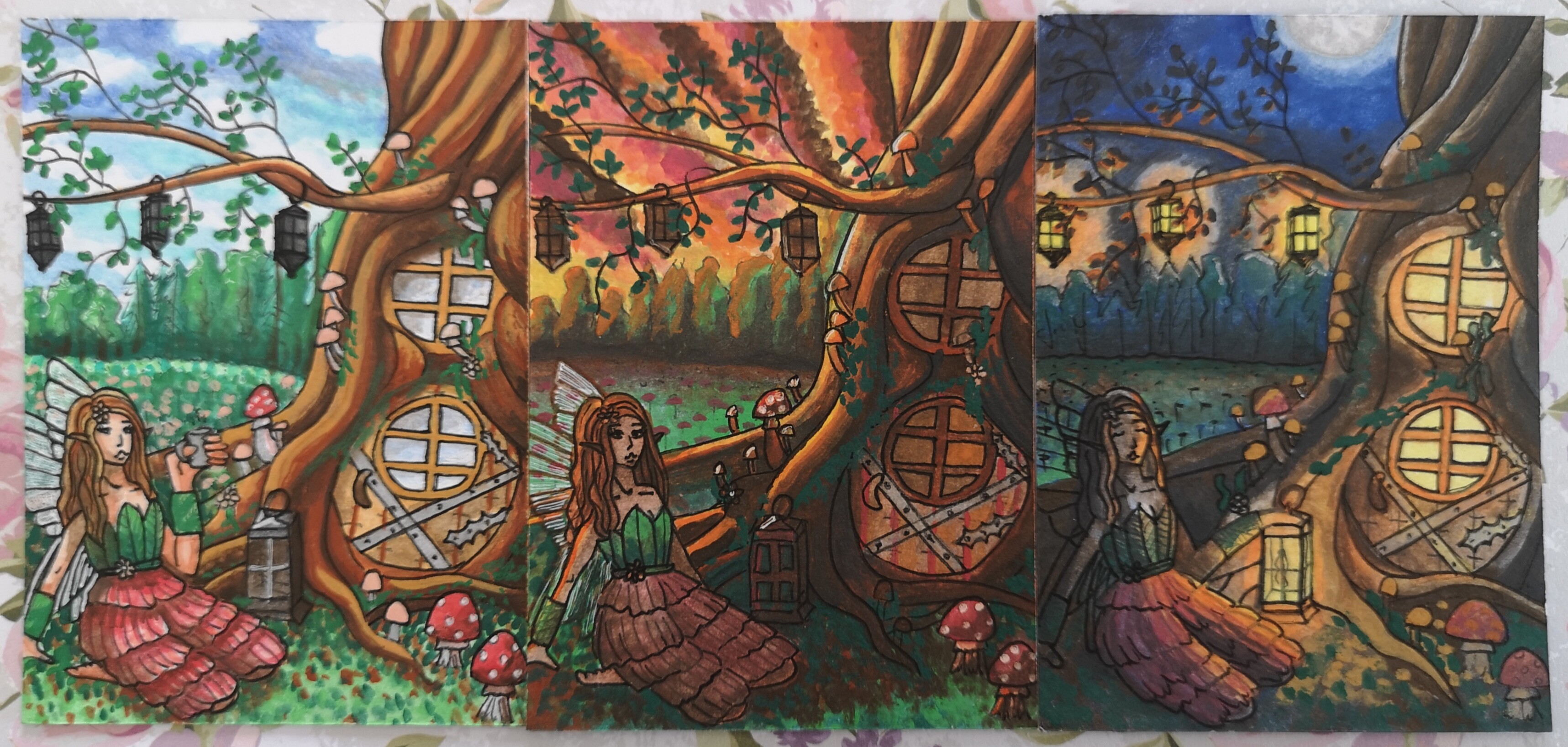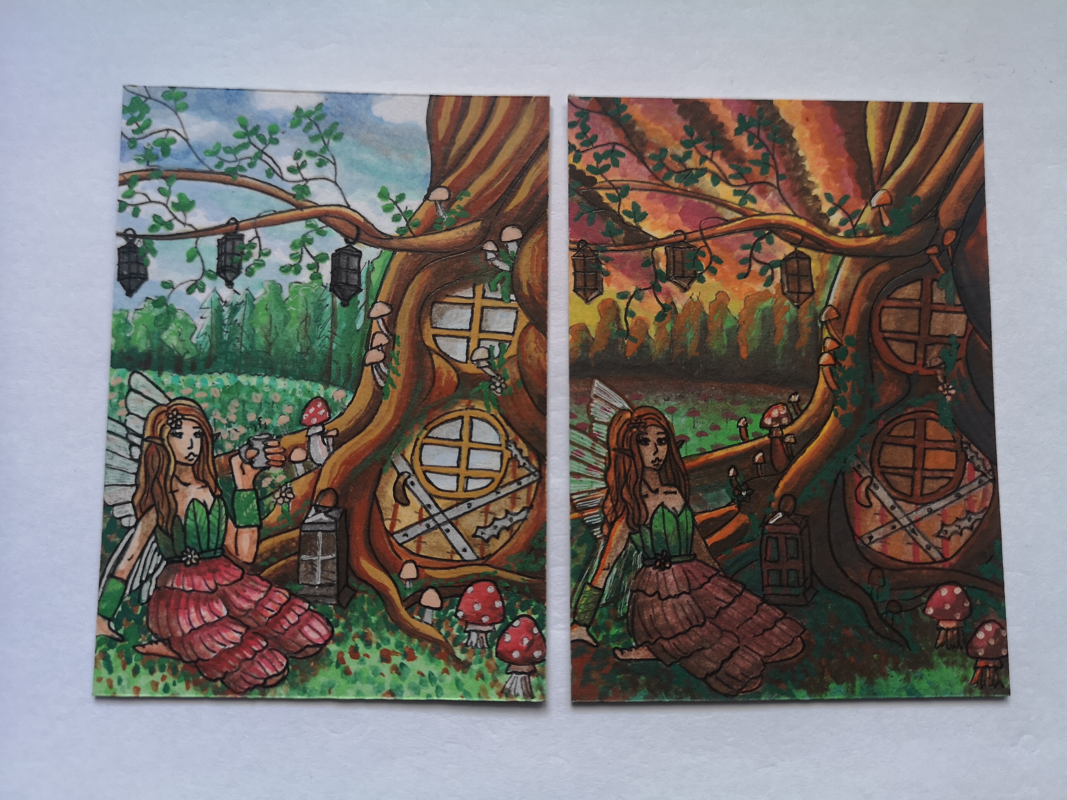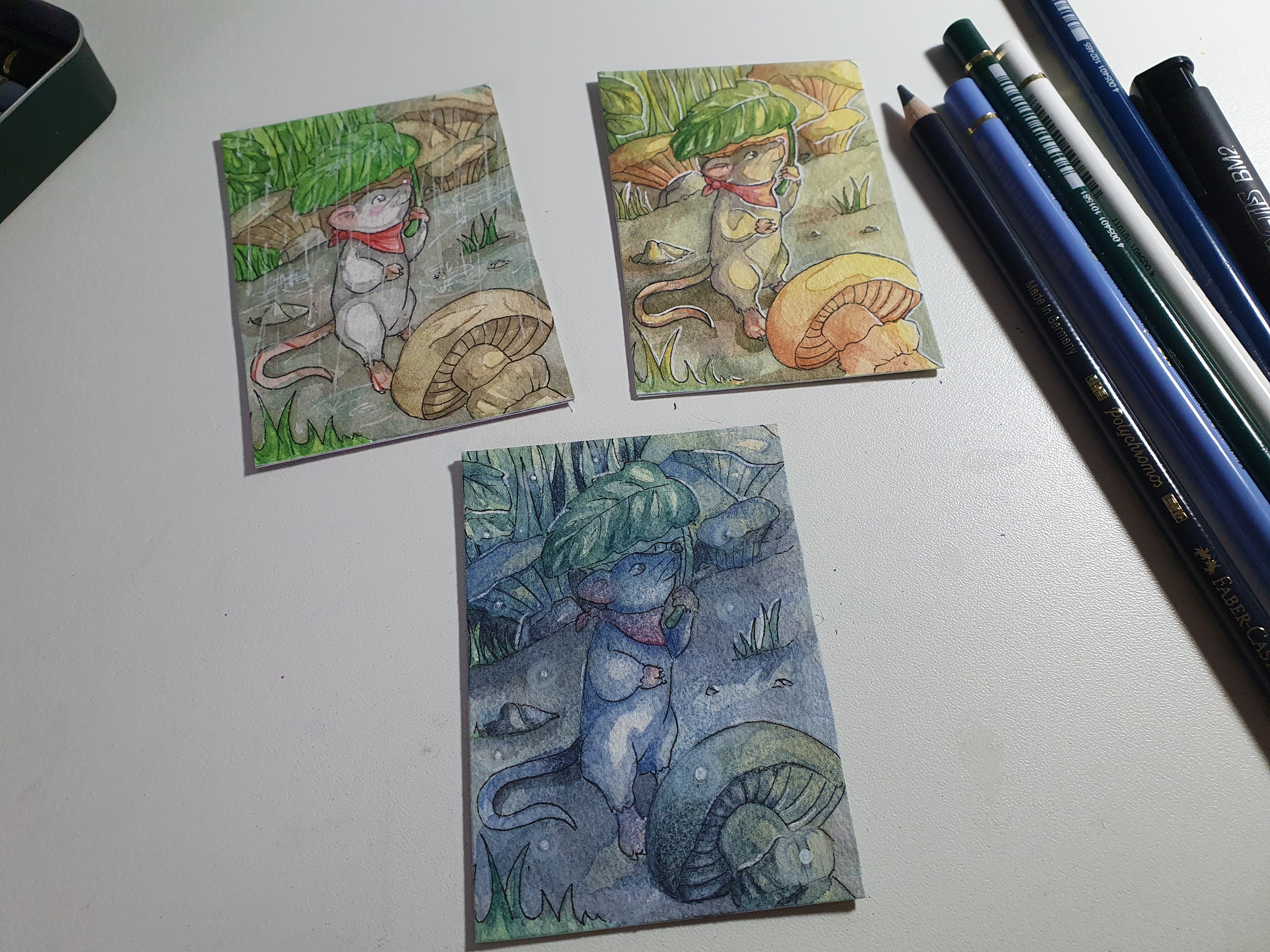 Finde die Bilder total süß und die unterschiedlichen Colos sind echt toll geworden. Ich kenn ja deinen Zeichenstil und weiß, dass du eher von der pastelligeren Fraktion bist. xD Dafür find ich die Farben echt schön und kräftig auf den Fotos. Wirkt ja immer gerne anders zwischen Foto, Scan und letztendlich Original.