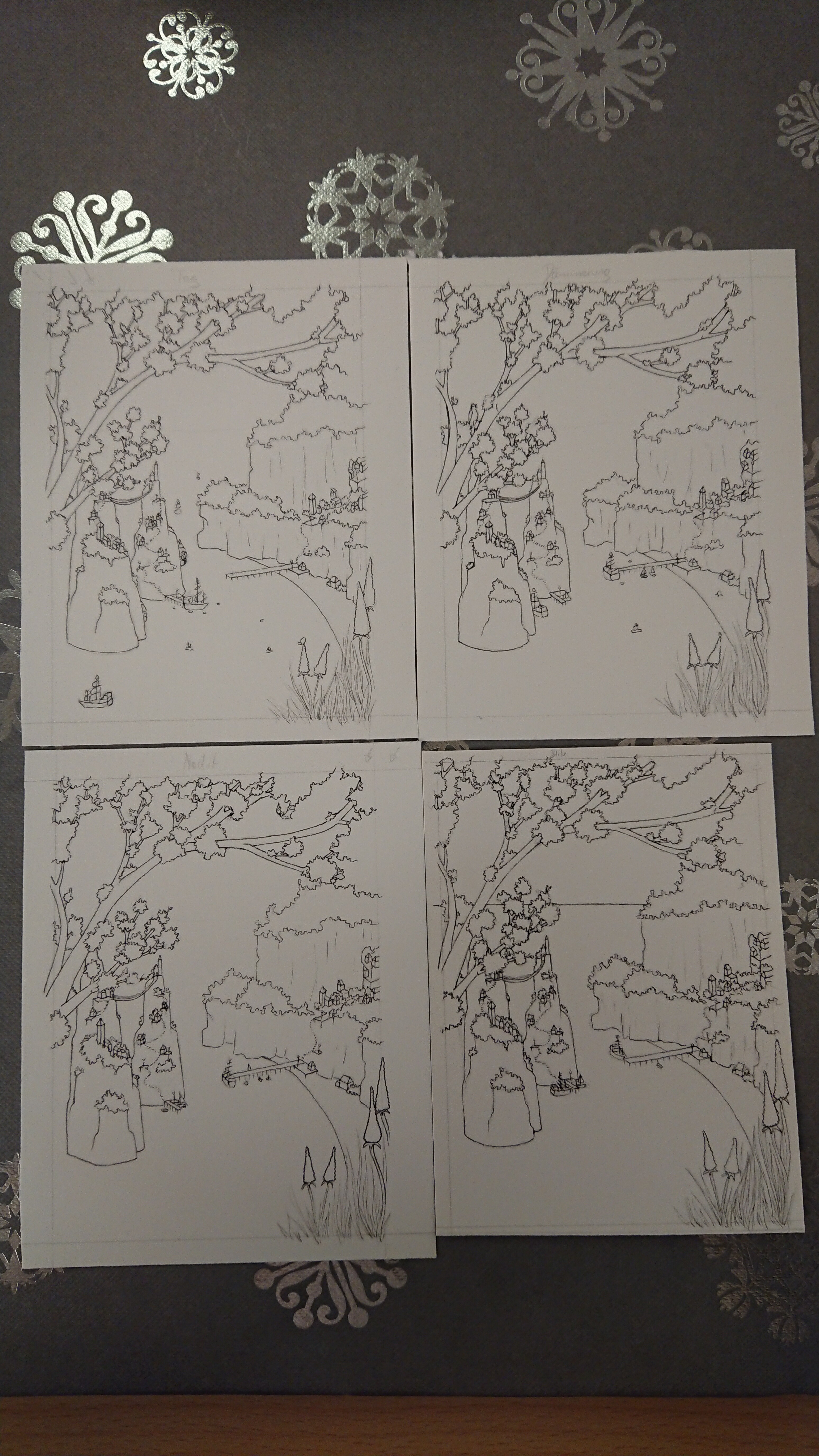 Mir kam endlich mal die Idee meine Skizzen nochmal auszudrucken, um unterschiedliche Hintergründe und Ideen durchzuspielen. Das sind die Ergebnisse. Danke an den Discord-Chat für die Ideen (: