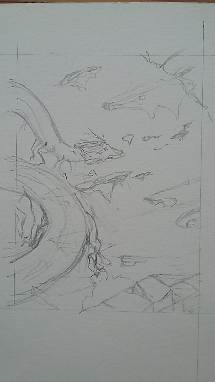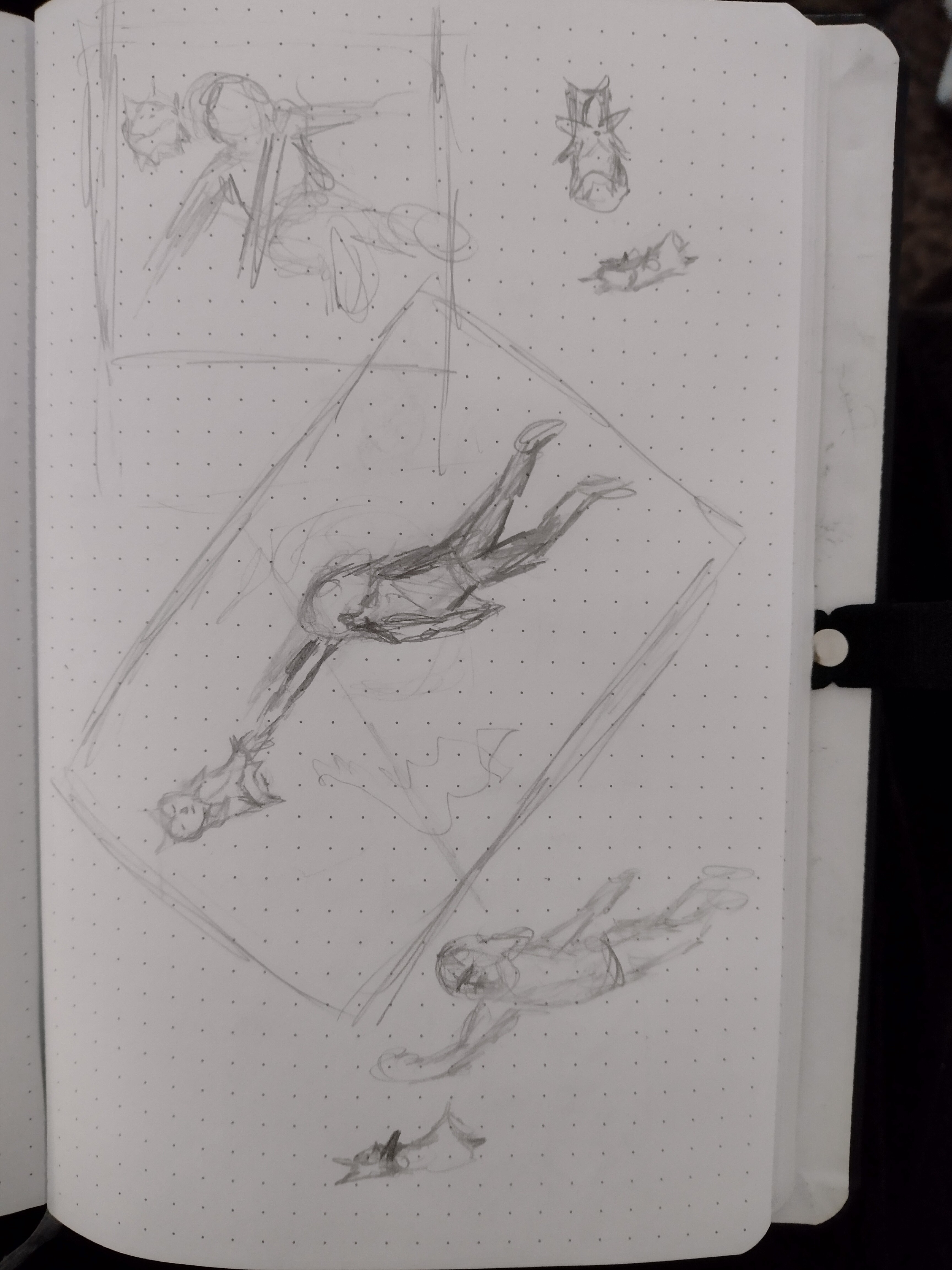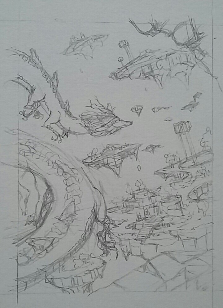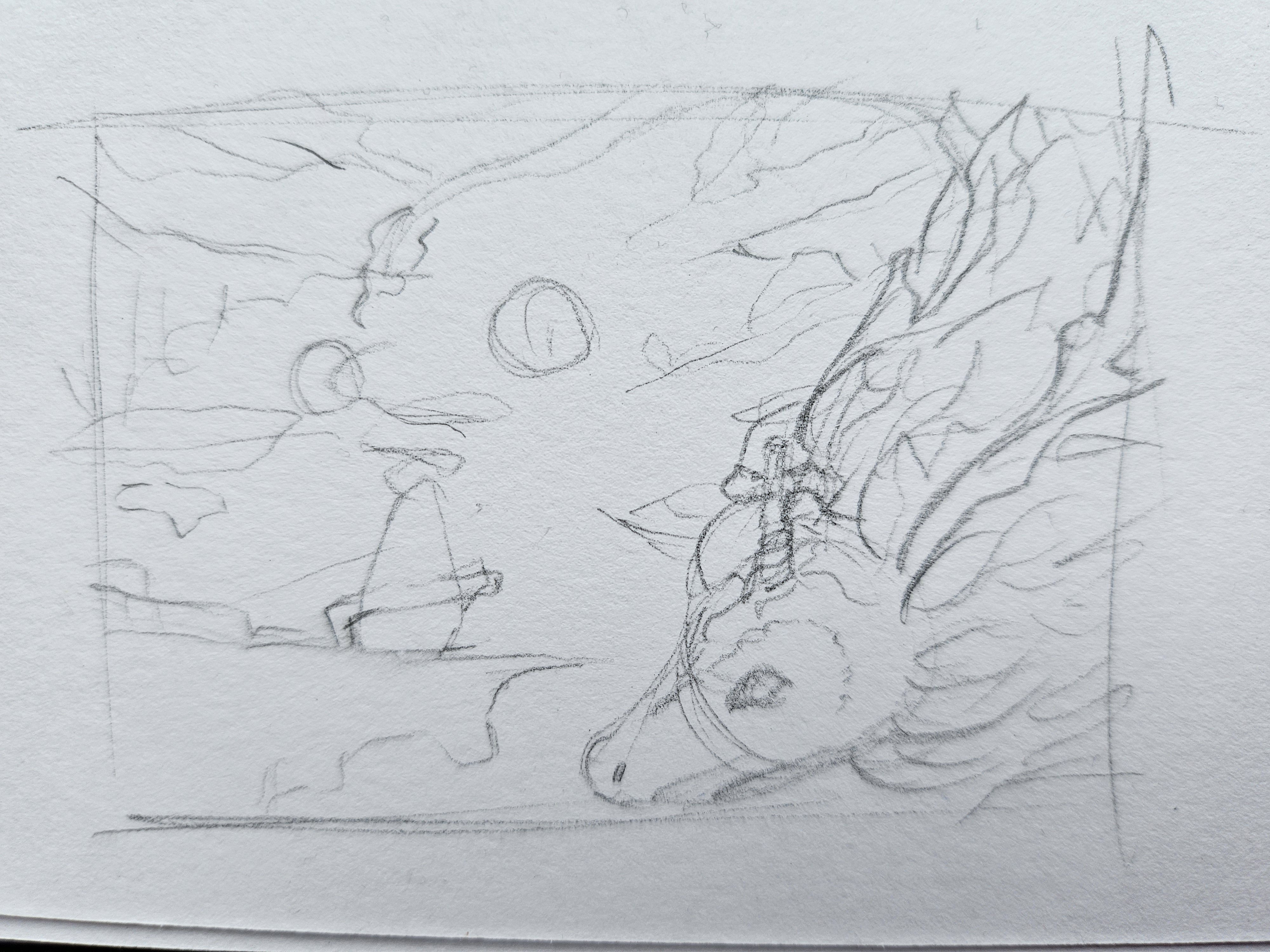 Die zweite Skizze ist ja mal mega, ich mag die Pose und die ganzen Details total gerne. Der Lichtdrache kommt ja hinter der Insel vor - vielleicht kannst du ja im Hintergrund seinen weiteren Körper auch andeuten bei der nächsten Insel? Ich hoffe, ich interpretiere die Skizze richtig :)