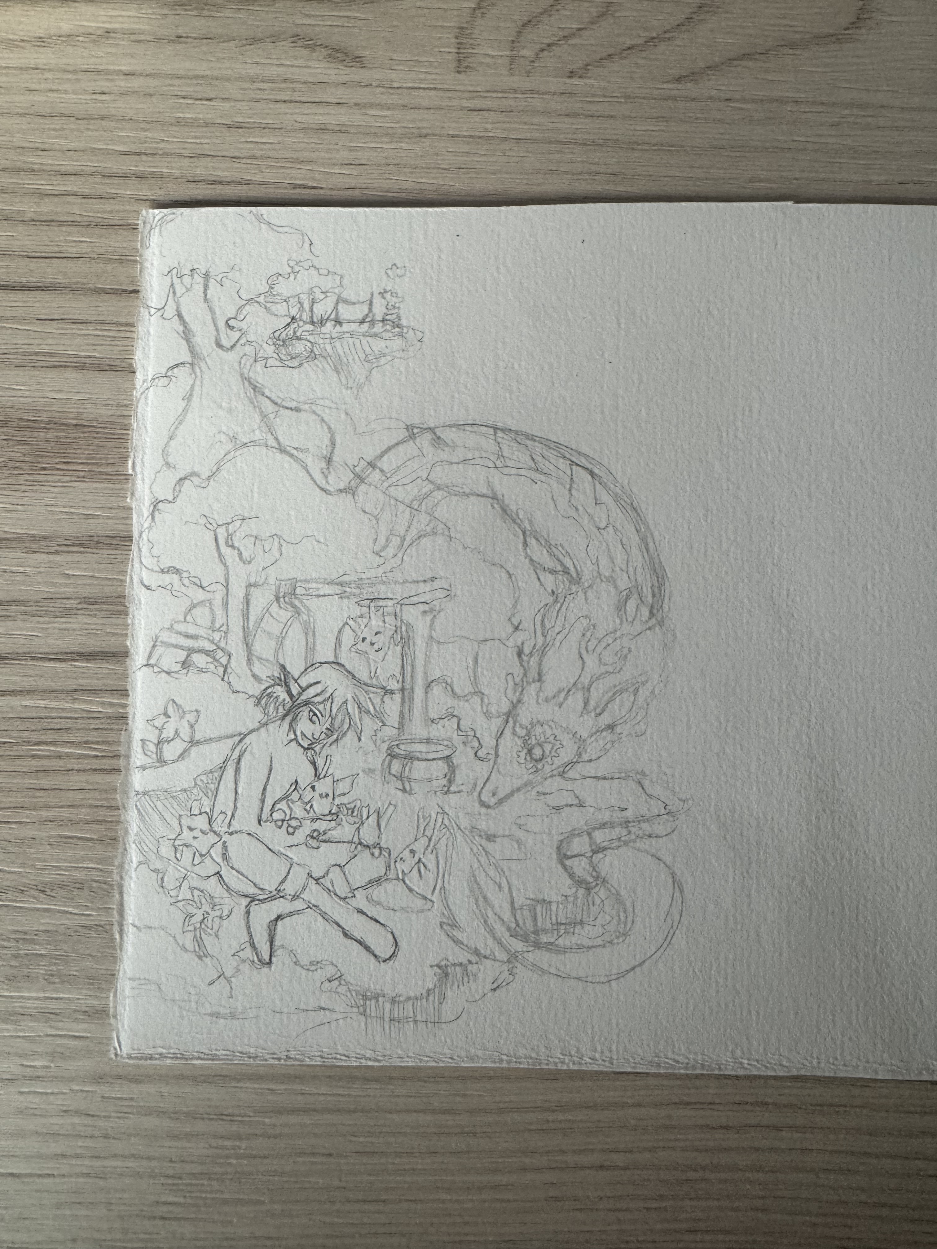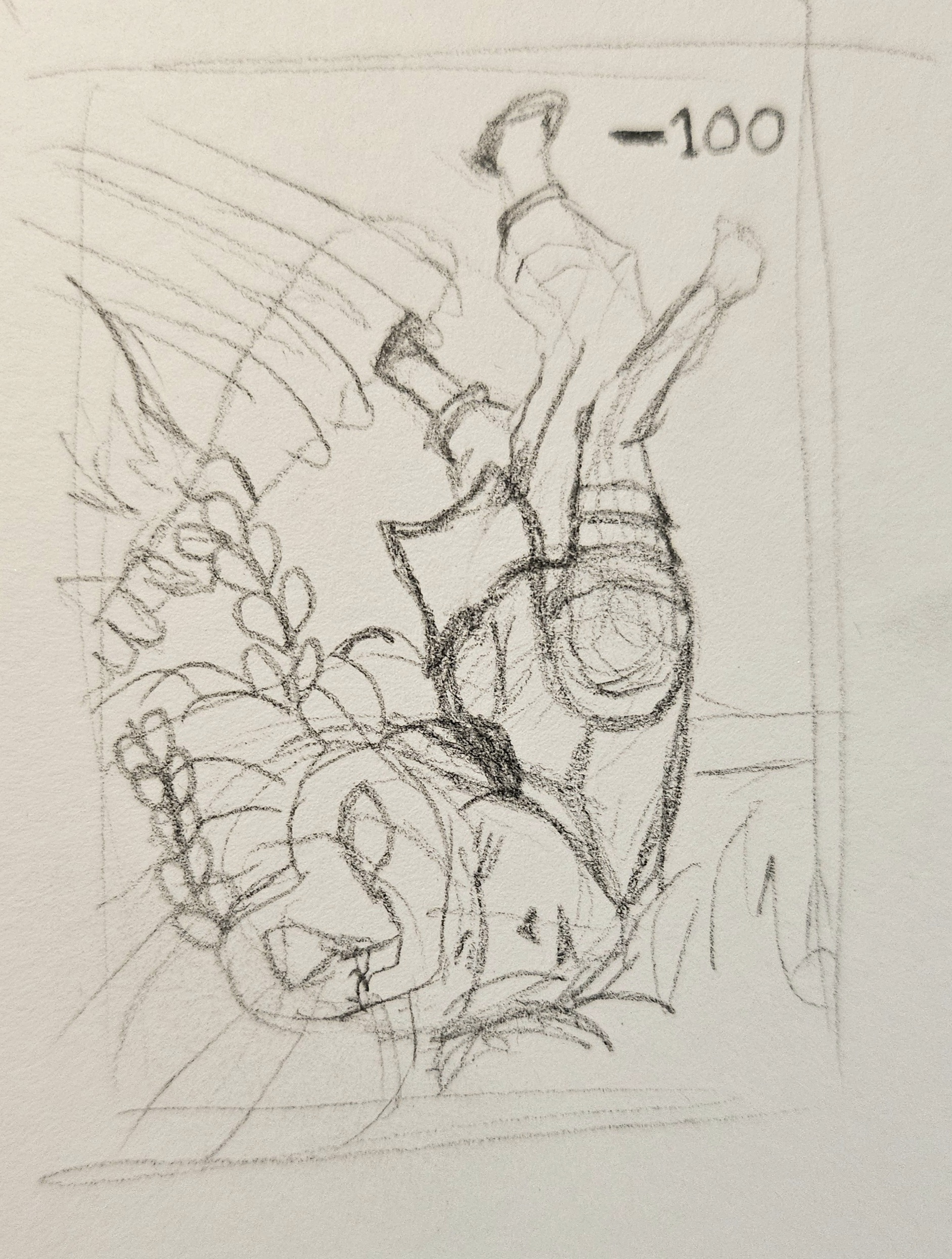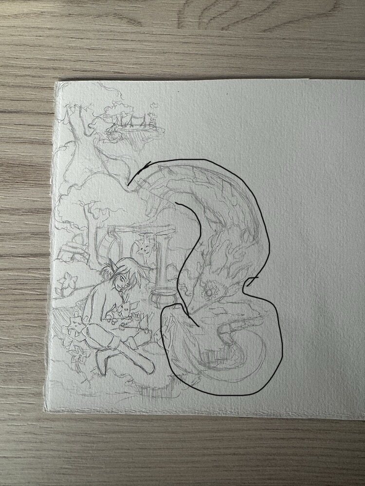 Die zweite Skizze ist ja mal mega, ich mag die Pose und die ganzen Details total gerne. Der Lichtdrache kommt ja hinter der Insel vor - vielleicht kannst du ja im Hintergrund seinen weiteren Körper auch andeuten bei der nächsten Insel? Ich hoffe, ich interpretiere die Skizze richtig :)