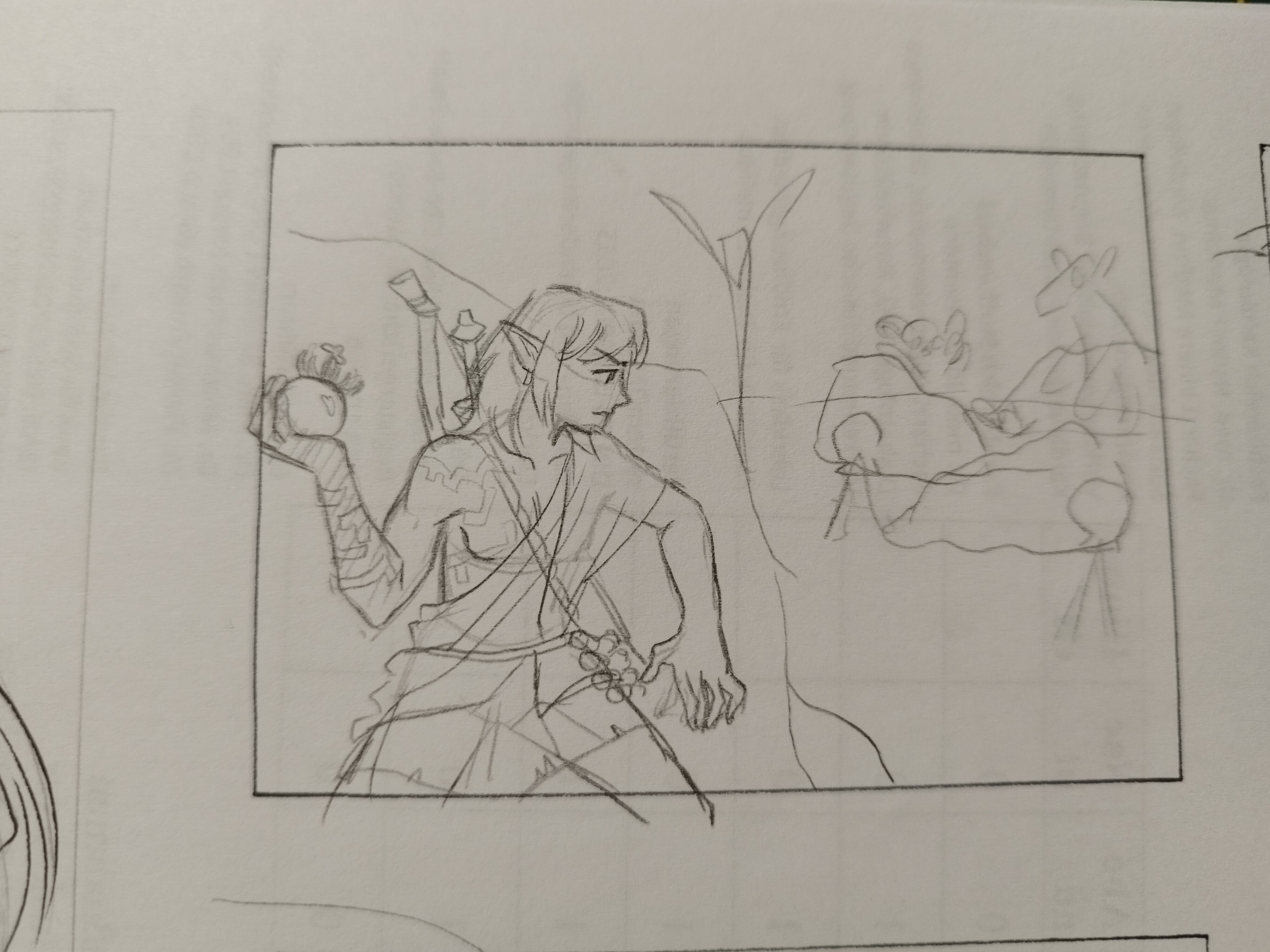 Direkt bei der ersten Idee bin ich gespannt, ob @Nil die zulässt. Daher hier schon sehr grobe Skizzen, damit ich ggf. nicht unnötig Zeit reinversenke. Idee: Ich hatte überlegt, ob man etwas aus der Szene am Ende, wo Link Zelda in der Luft fängt, machen kann. Aber da ist man ja sehr schnell bei Motiven, die sehr nah an Screenshots sind. Daher kam die Idee, dass er ja auch etwas anderes auffangen könnte. Also was ist daraus geworden: Statt Zelda könnte Link ja einen Krog fangen, der Zeldas Kleid trägt. Ergibt wenn man ehrlich ist wenig Sinn, aber ich finde die Szene trotzdem lustig