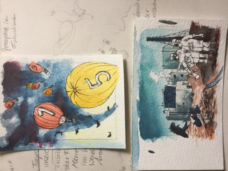 Aber zu dieser Skizze: Ich mag die Positionierung schon einmal sehr und auch, dass man etwas vom Hintergrundgeschehen erkennt. Da scheinen sich zwei Fraktionen im Weltall zu bekämpfen. Vielleicht streiten sie sich um den Fund des Raumschiffes oder um Territorium? Die “Raumanzug”-Details mag ich :D