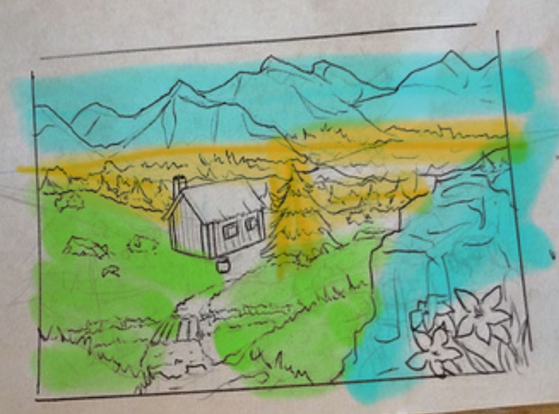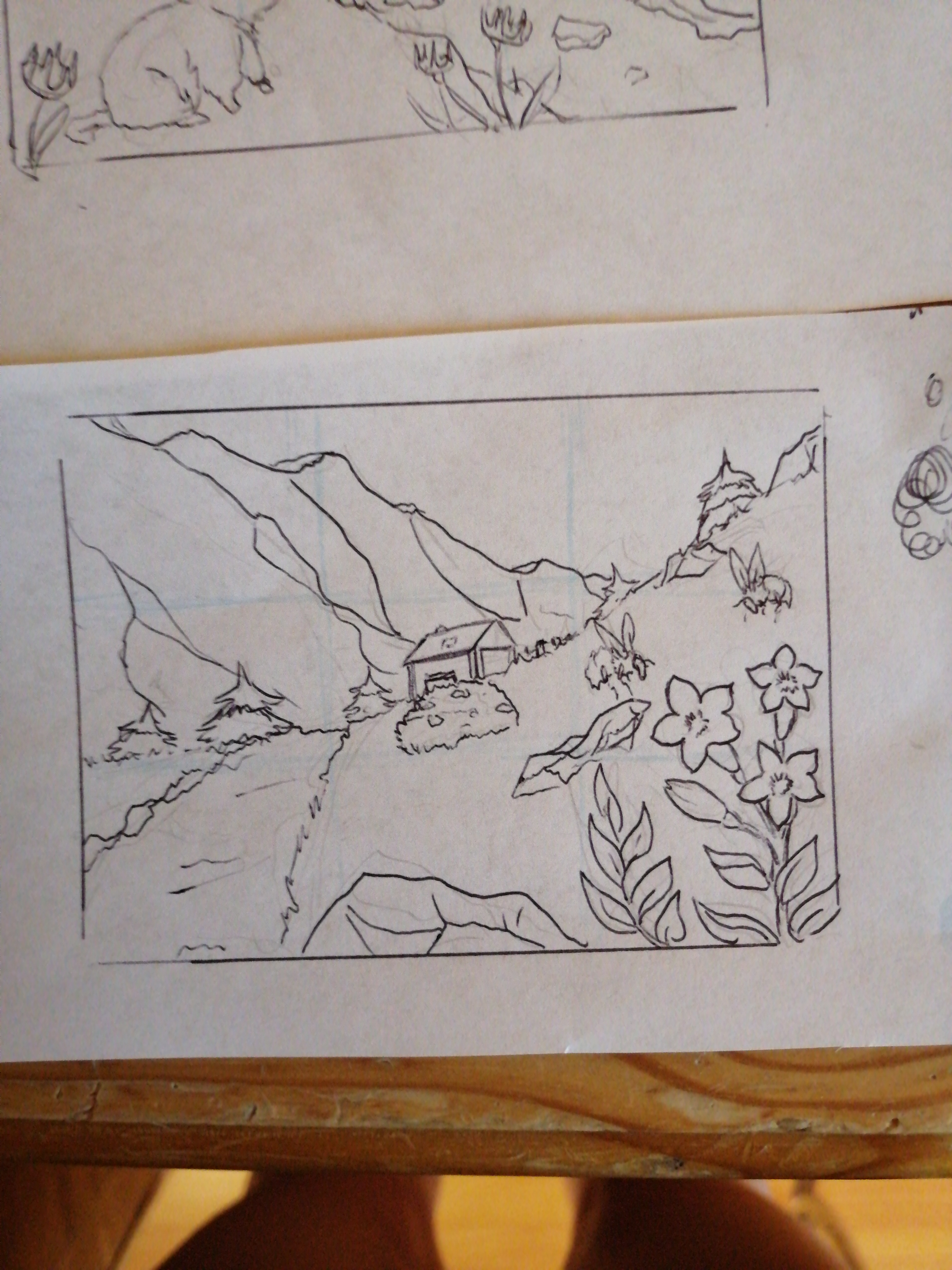 In der rechten Ecke unten habe ich die Wiese unterbrochen und deute hier einen Felsigen Abhang an, wo der ruhige Bach in einen Wasserfall übergeht. Der Wasserfall und die Felsen links und rechts stehen dann im Vordergrund und sind hier wieder schräg angeordnet.