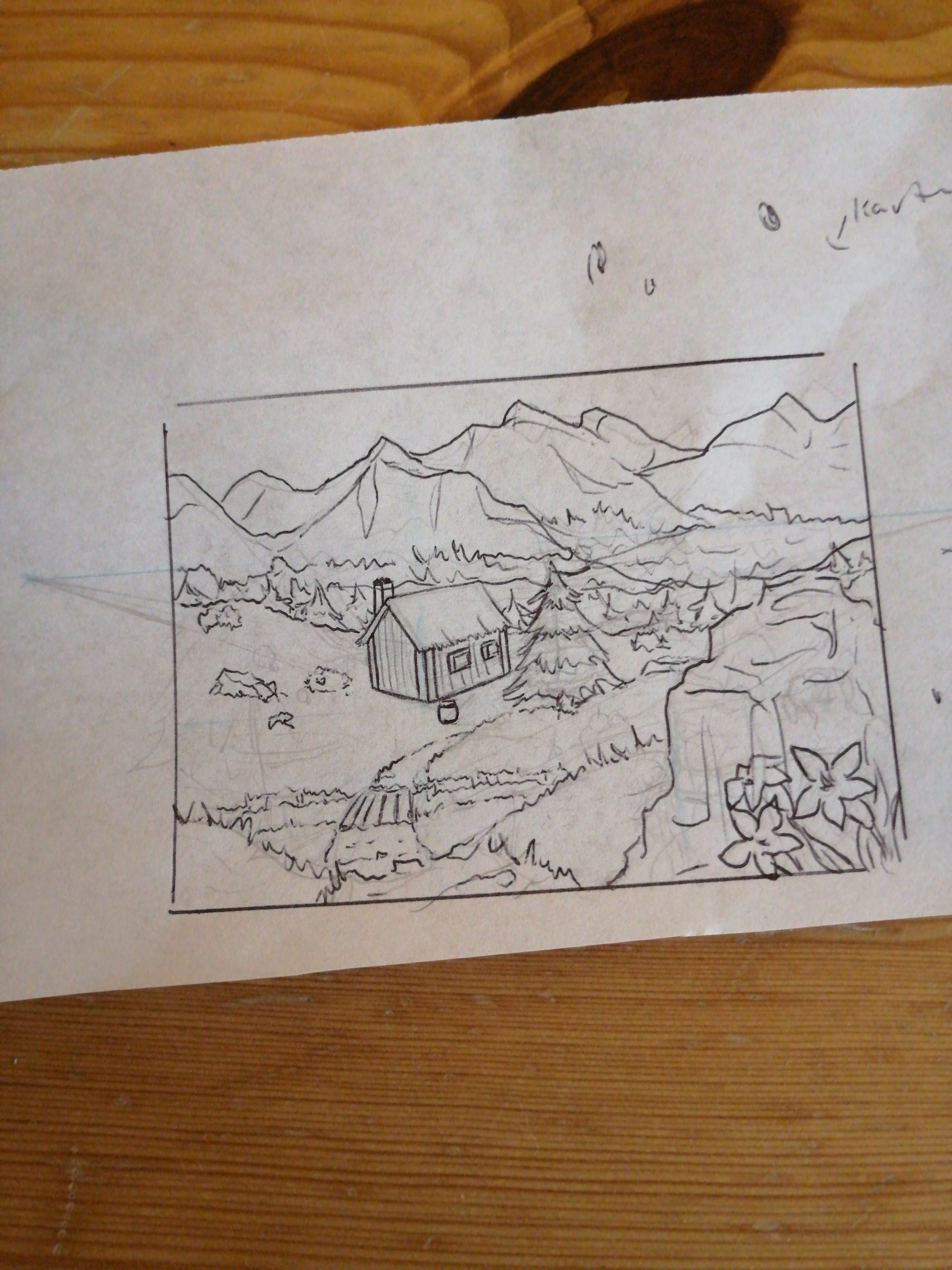 Stattdessen habe ich oben eine Hochalm, also eine Wiese weit im Hintergrund hinzugefügt und einen zusätzlichen Berg, oder erweiterten Bergfuß vom Berg in der Mitte des Bildes nach vorne links gezogen.