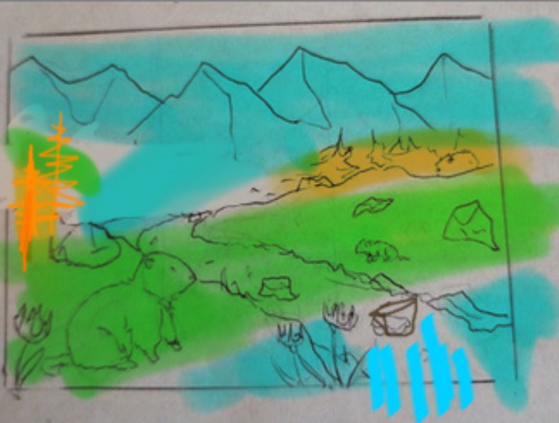 Das orange Gekrakel links sind Bäume, die auf Ebene des Bildmittelgrundes liegen. Damit soll die Verbindung zum Wald rechts hinten wieder geschaffen werden und macht aus der kurzen geraden Linie eine unterbrochene Linie mit leichte Knick nach vorn.