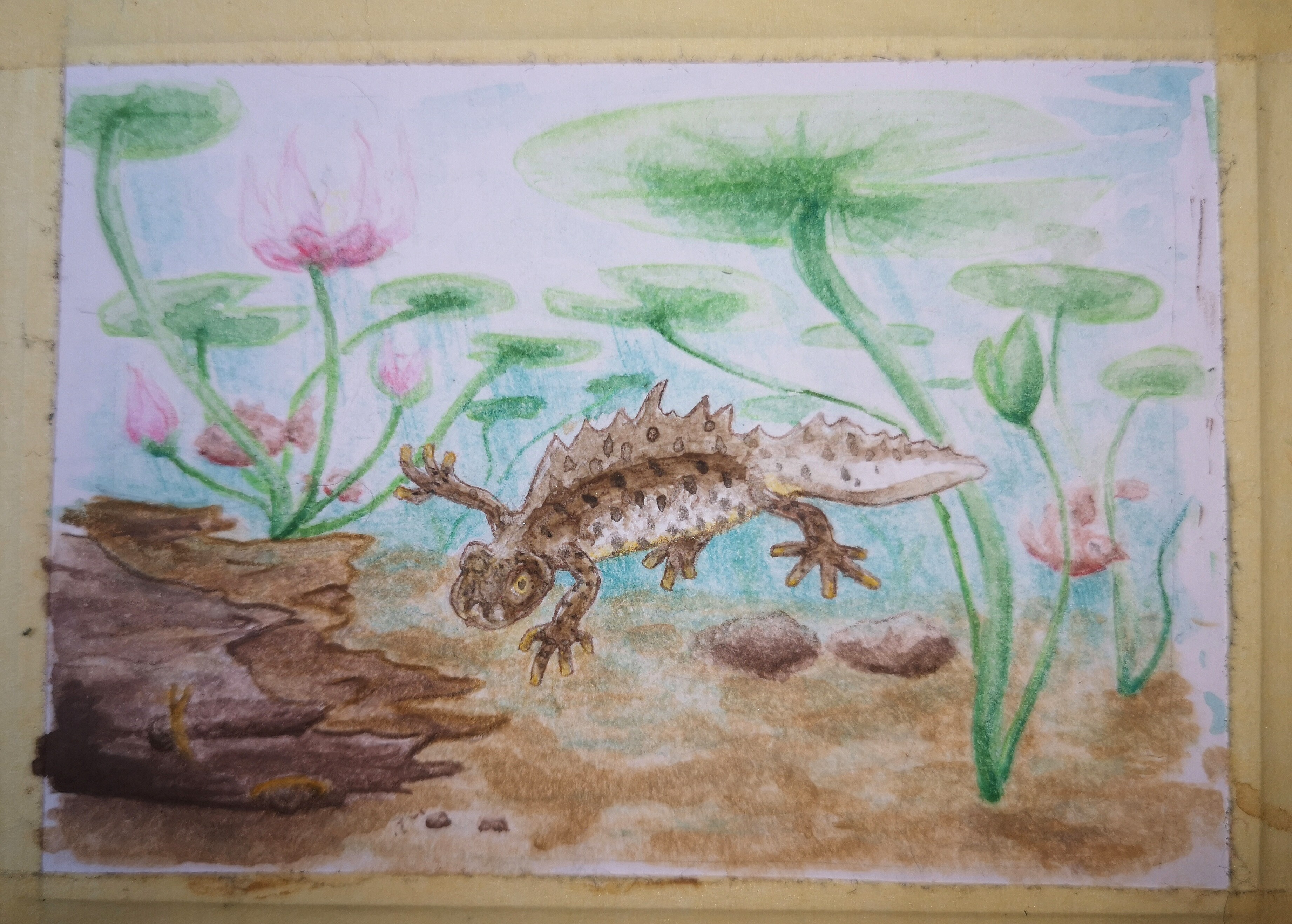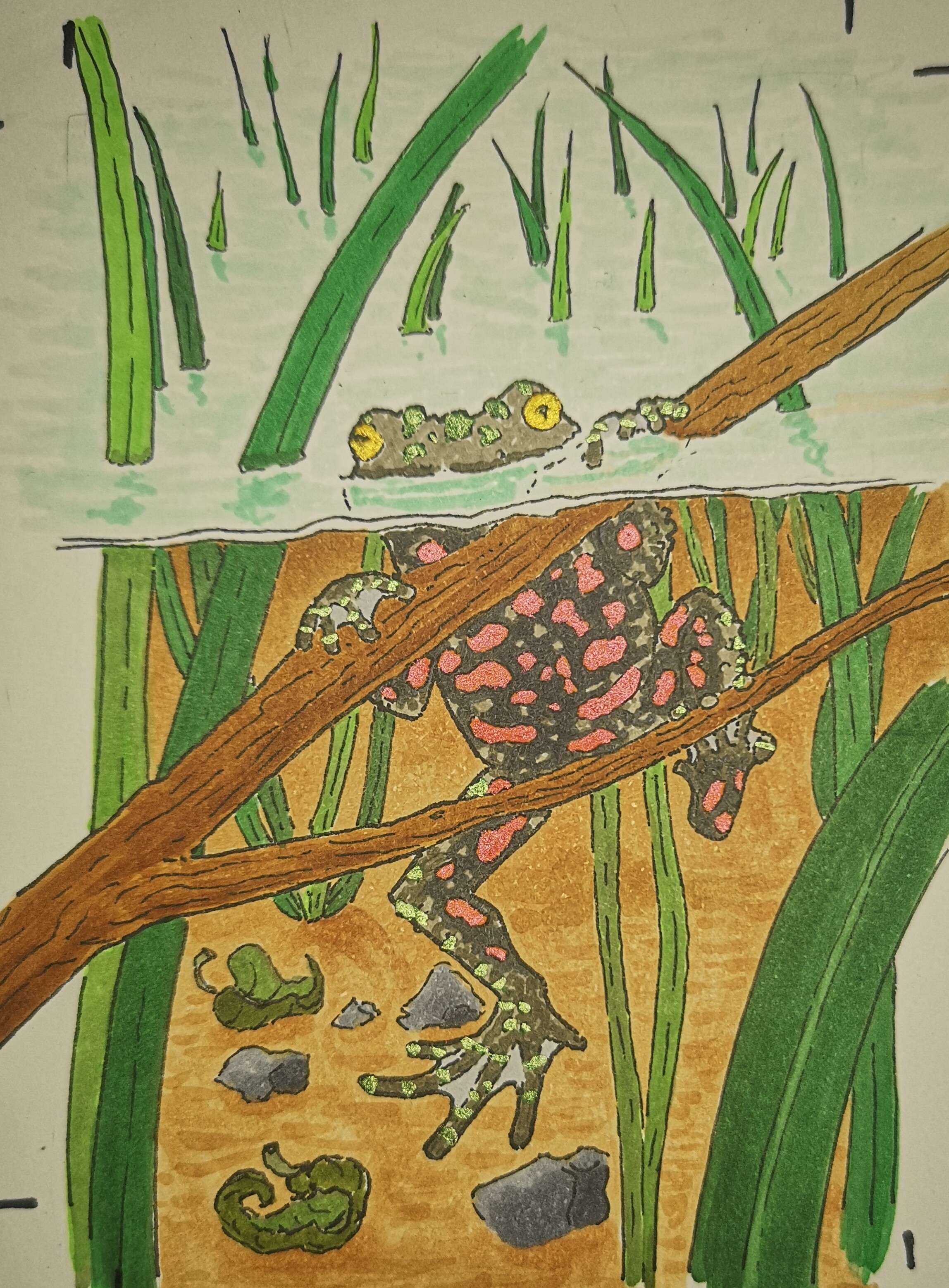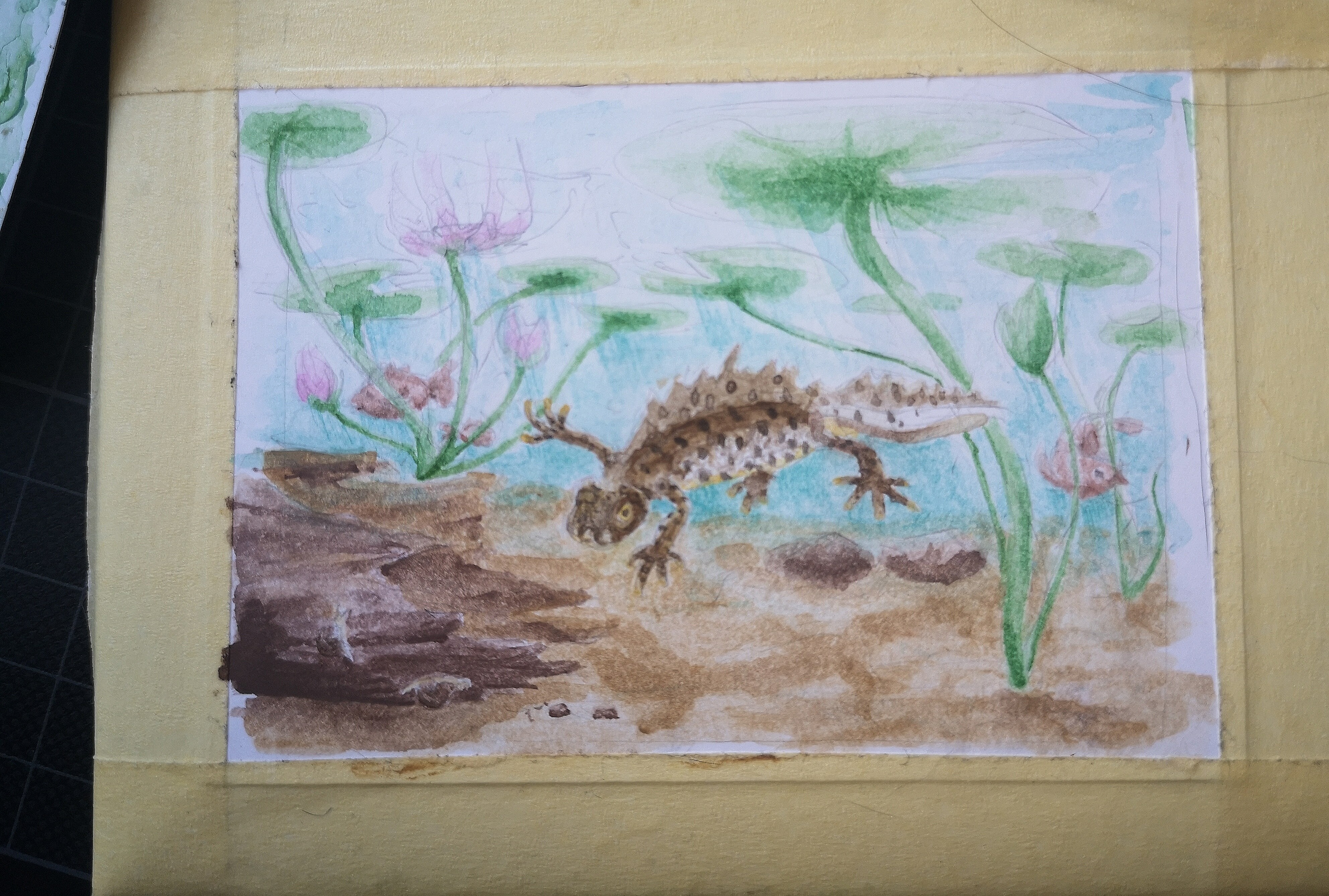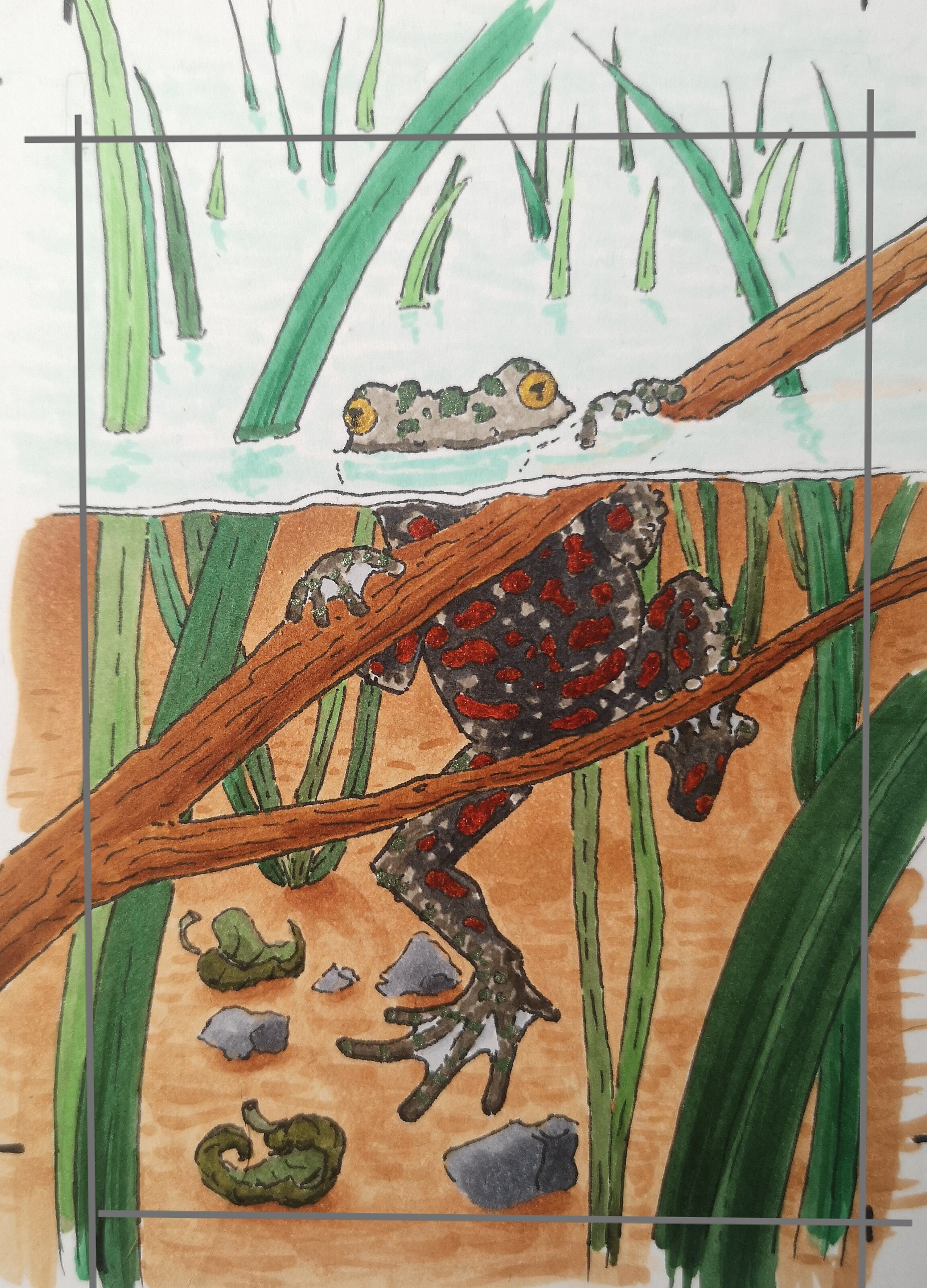 Eine Möglichkeit wäre z.B. noch, ein paar Highlights oder Luftbläschen mit Weiß einzufügen oder im Vordergrund (den Baumstamm und bei dem vordersten Seerosenstängel) auch nochmal die Konturen etwas nachzuarbeiten, wie beim Molch. Dann ist die Abgrenzung zum HG und VG noch etwas deutlicher. Aber wie gesagt, du kannst die Karte auch erstmal etwas sacken lassen. Zeit ist ja noch genug :)