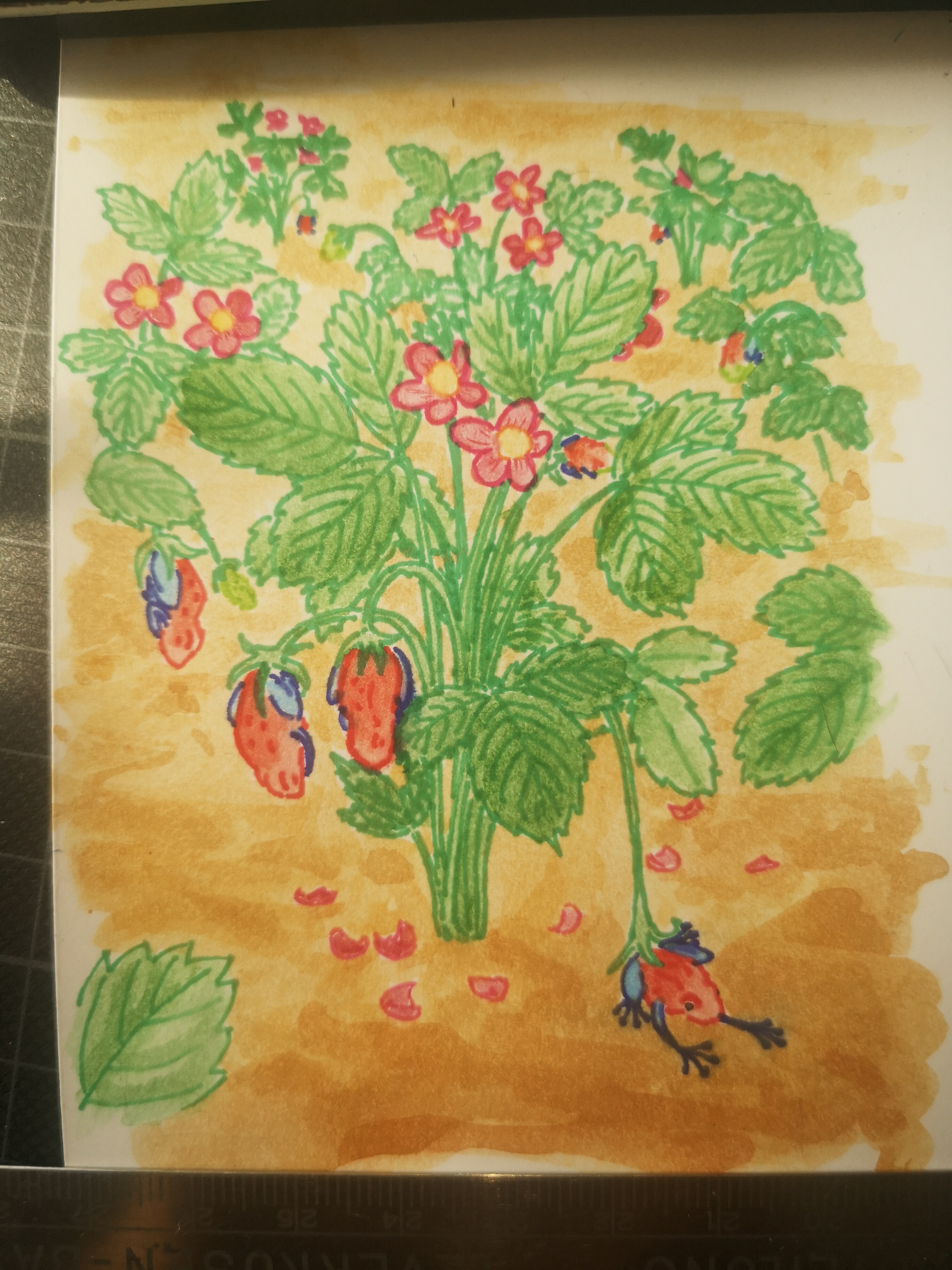 Hab gestern und heute mal die Erdbeerfröschchen-Karte von der ersten Skizze coloriert, um meine neuen Stifte zu testen. Leider waren sie nicht wasserfest und es ist daher etwas sloppy geraten.