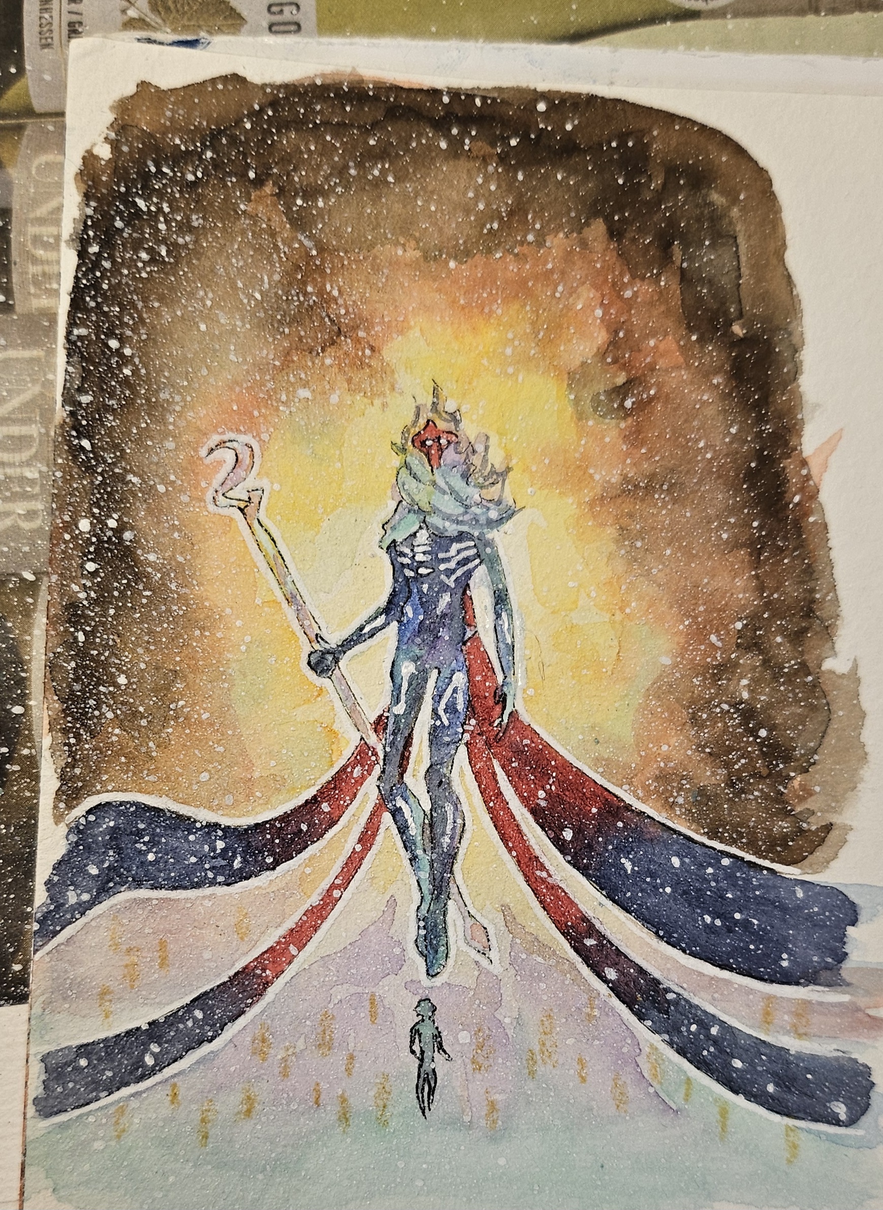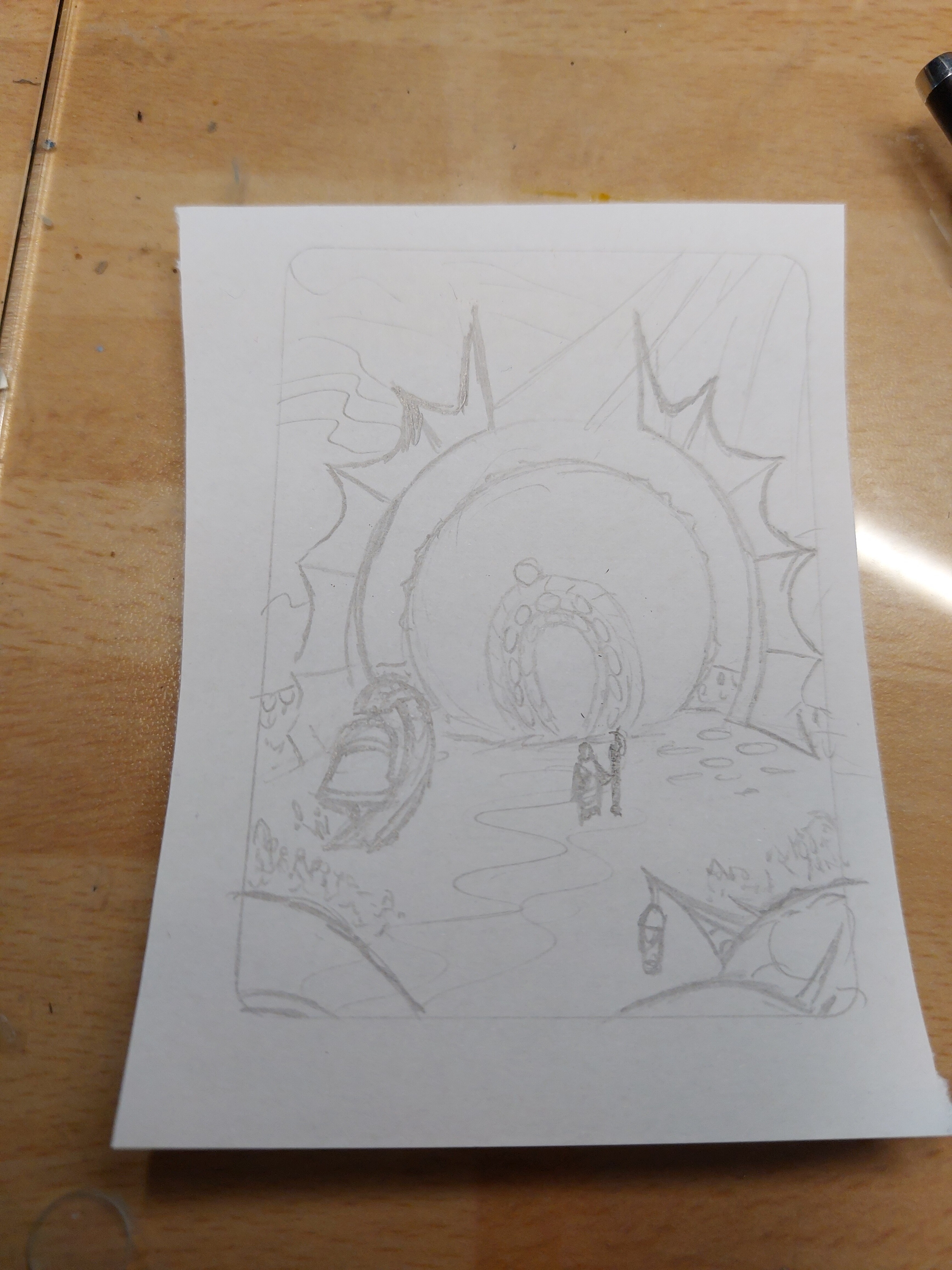 Einmal habe ich eine Skizze zu Viktors Kommune. Die Kuppel bekommt natürlich noch ihr Muster mit den fertigen Lines. Ich hoffe , dass man durch den Stab und die Robe am Ende auch erkennt dass das die mini Person Viktor ist.