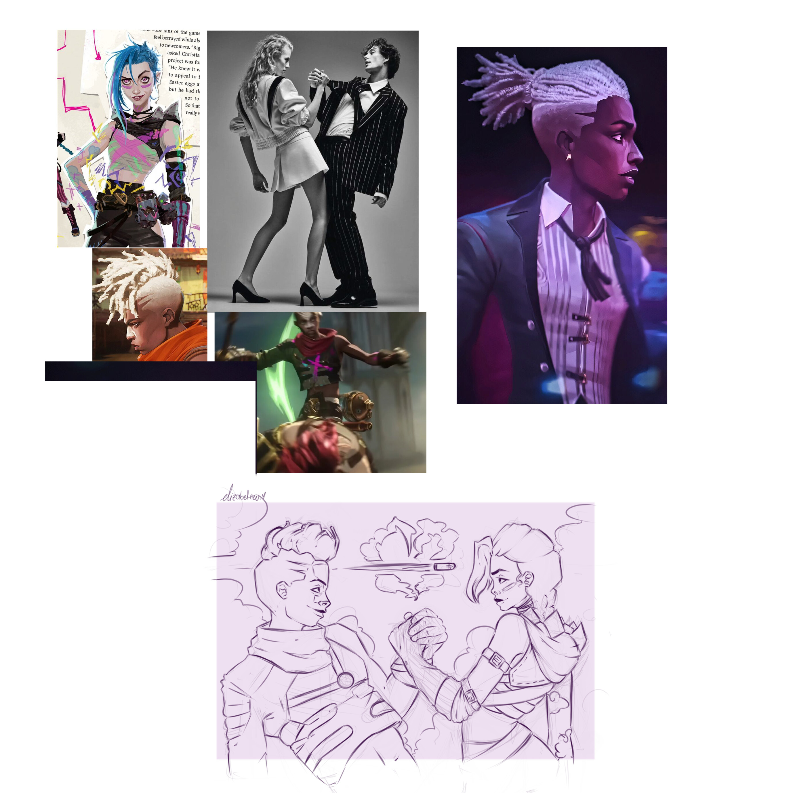 ich bleibe bei der Skizze etwas an ihren Frisuren hängen. Ekkos Haar ist nach vorne hin eher länger und herunterfallend, während es bei Jinx gerade so aussieht, als würde sie immer noch zum Teil ihre langen Haare tragen würde. Auch wenn sie diese ja eigentlich geradezu kurzrasiert hat. Vielleicht lese ich deine Skizze auch nur falsch. Aber gerade Jinx’ Haar wäre denke ich etwas wichtiger, weil es charakterentwicklungsmäßig schon einen Unterschied macht.