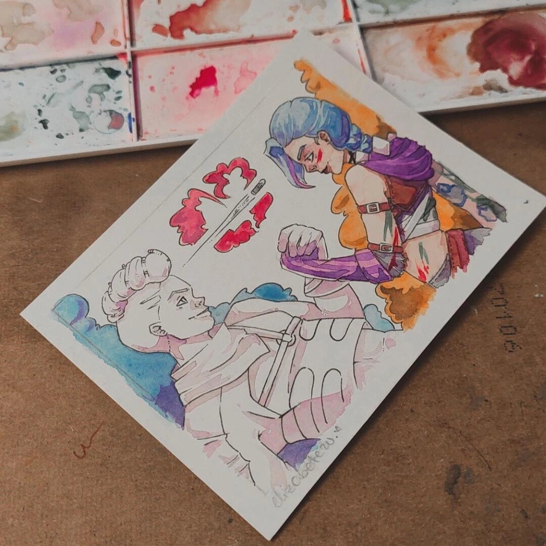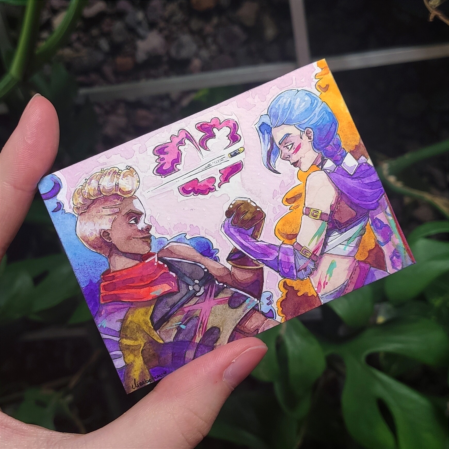 Halli hallo, isch habe endlich die Skizze für meine letzte Karte gemacht, wenn sie so OK ist. Könnte mich richtig lange nicht entscheiden was ich zeichnen soll und hatte drei Ideen: Jinx und Ekko/Isha und Jinx als Erinnerung und eine Karte mit Orianna, da ich ihr neues Design und Lore toll fand. Aaaber ich wüsste bei der Ischa und Orianna Idee nicht so jut wir ich es günstig umsetzen könnte, so dass die Karte Story und gute Posen hat. Aaalso hab ich jetzt zu meiner ersten Idee gegriffen und Jinx und Ekko vor dem letzten Kampf gezeichnet oder vielleicht während dem Kampf. Und hab dafür die Perfekte Pose gefunden, die gut darstellt, wie sie sich auf einender verlassen und so. Wollte für den Hintergrund diese Farben Wolken/Gas verwenden, welcher im Kampf geschmissen wird. Und ja, ich hoffe das wäre so ok:)