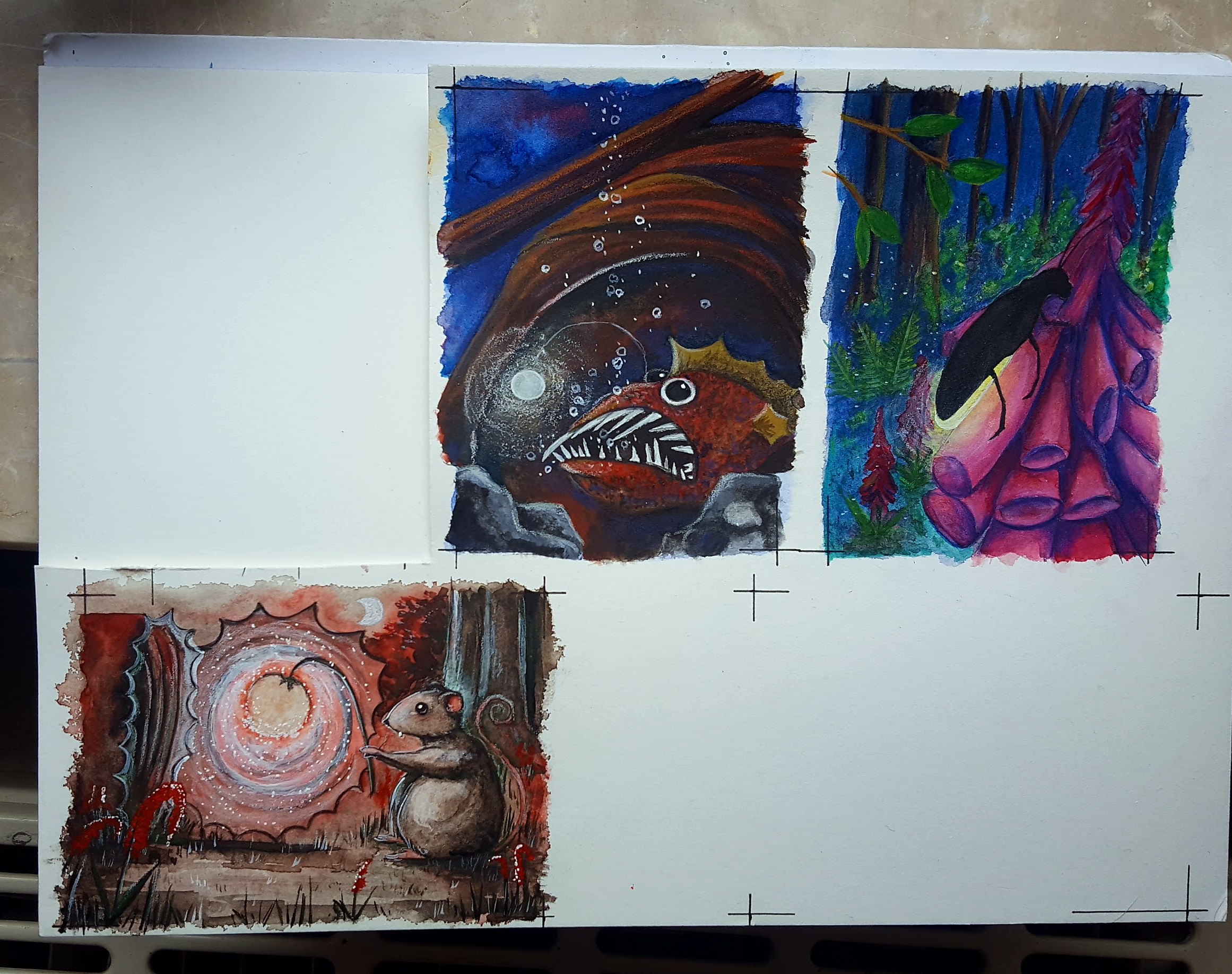 Die Karte mit den Pilzen sieht auch schon toll aus. Sind das Helmlinge? Und sogar noch mit LeuchtKäfer.