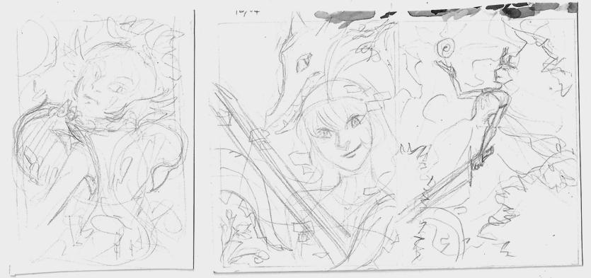 Skizzen, leider hat der scanner viel gefressen ich hoffe man erkennt genug. Für die Norah hab ich noch ne alternative Skizze sollte der Bildaufbau der Genovefa zu ähnlich sein.