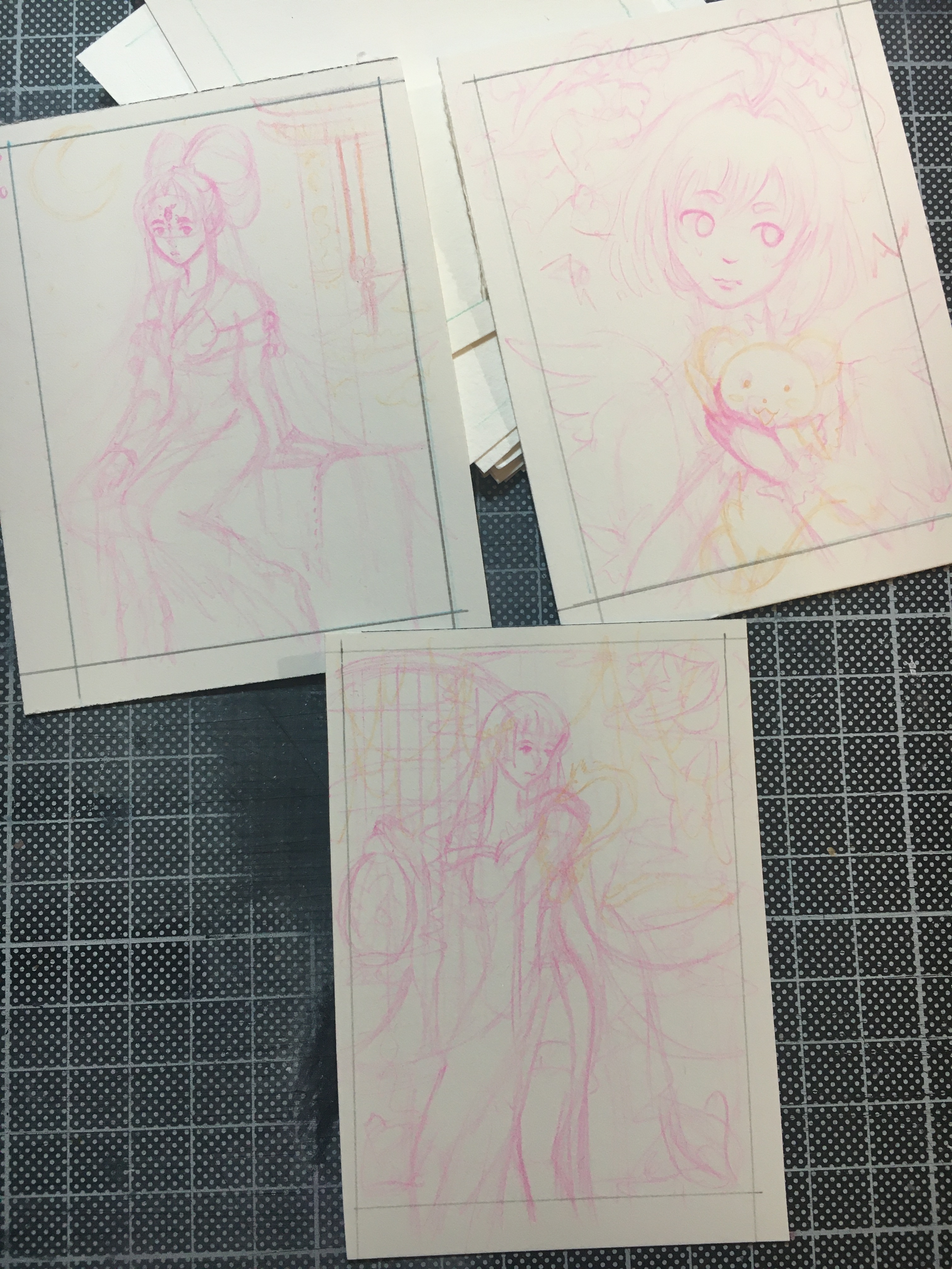 Ich würde tippen auf Sakura, Yuuko und Hinoto (wobei ich bei letzterer nicht ganz sicher bin)? Die Skizzen sehen schon vielversprechend aus. :3