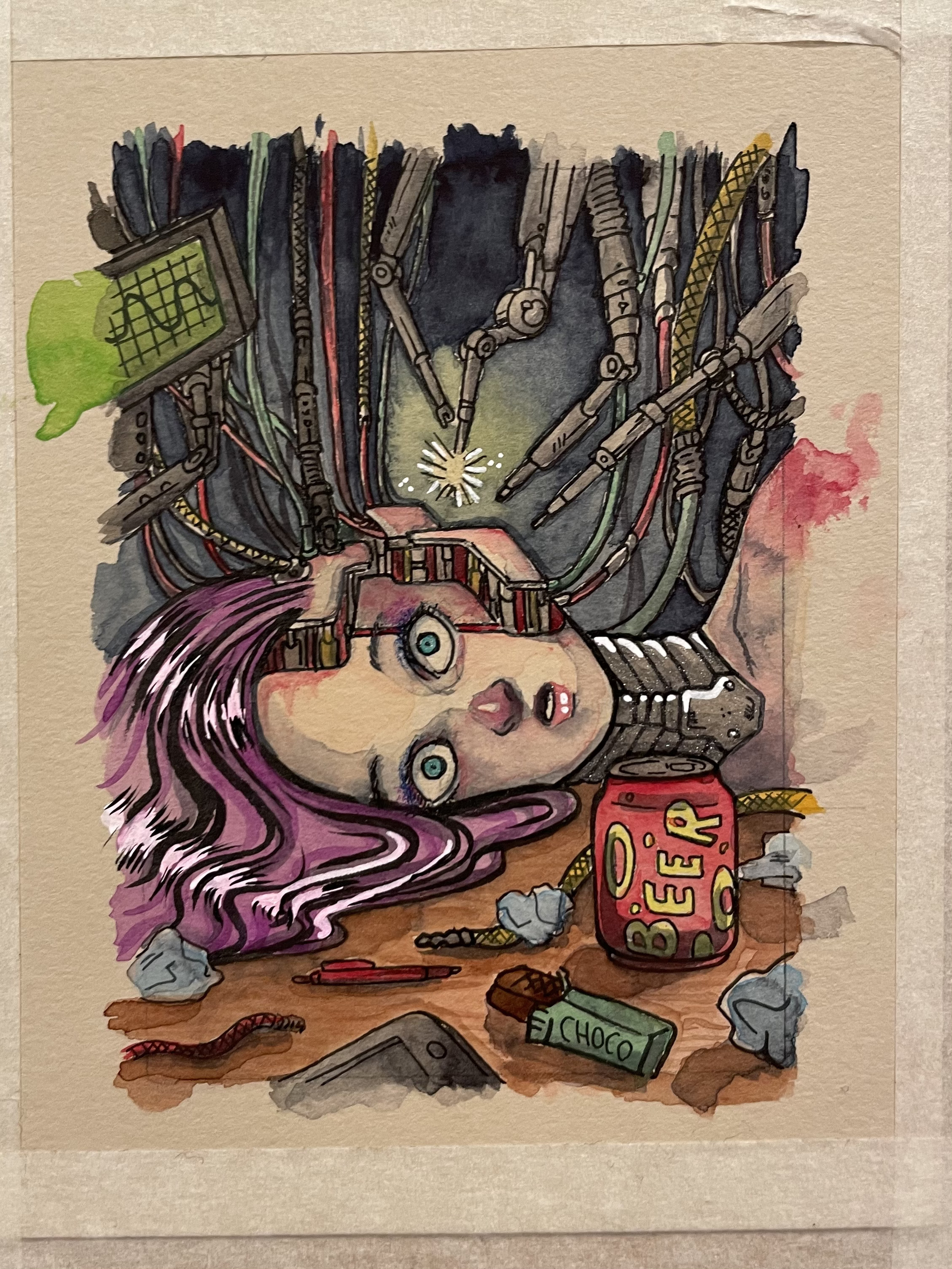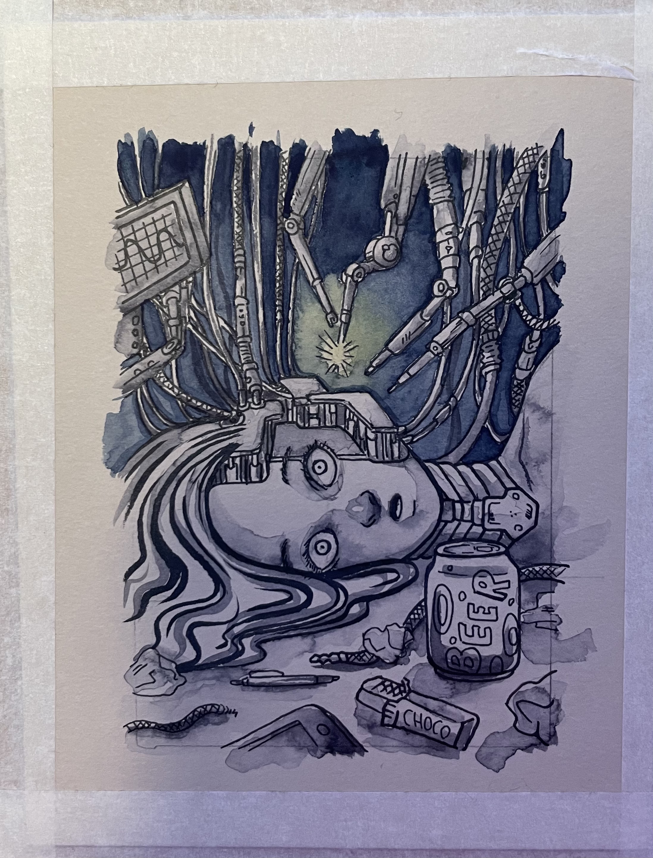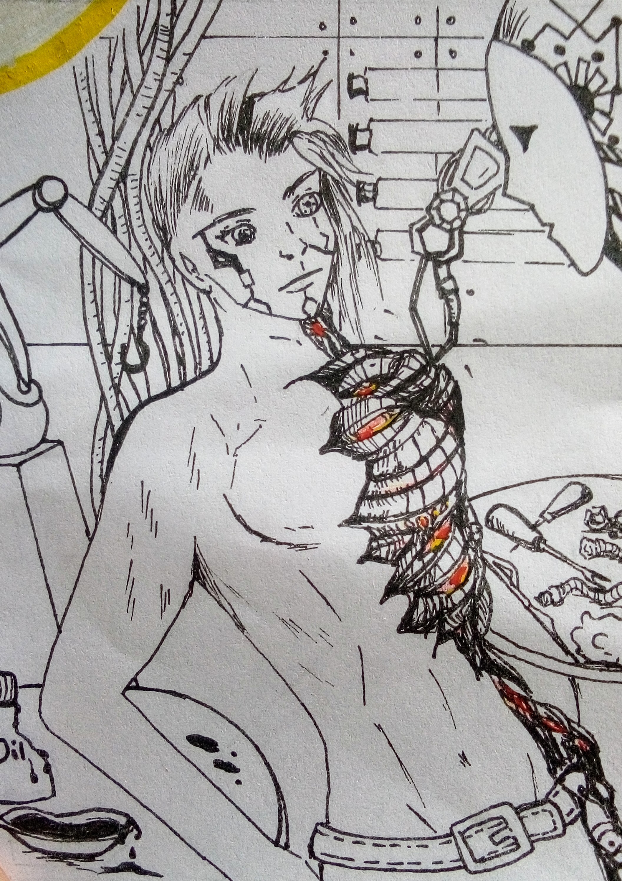 Danke euch für die vielen Ideen für den Hintergrund. Ich hab mich mit einer Werkstatt und einem Roboter Doktor versucht. In der Colo würd erst einiges besser sichtbar. Z.B. Die Neonröhren im Hintergrund rechts, der rote Kabelbaum links, oder elektrische Lichter im Cyborg Körper. Dann wirkt er sicher noch was besser, obwohl ich ihn als älteres Modell angedacht hab.