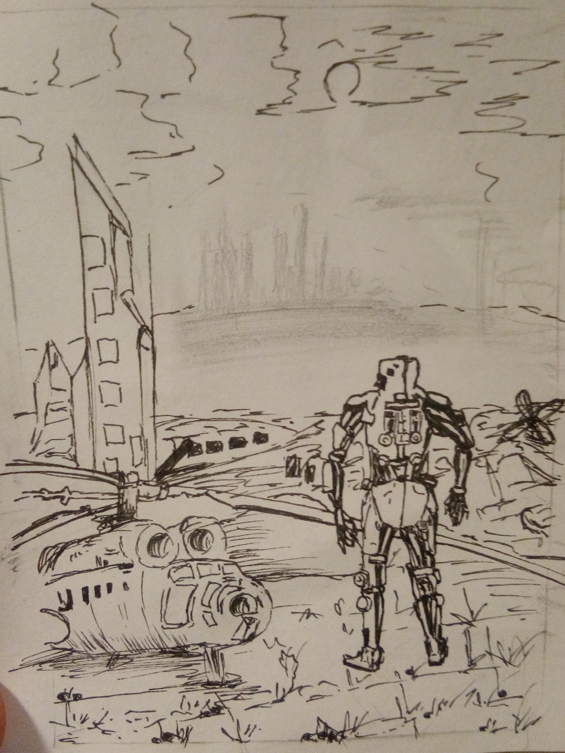 Ein einsamer Roboter auf einem Flieger Friedhof. Links forne wird ein kaputter Helikopter sein. Im Hintergrund kommen noch Wracks und Schrott, aber recht Klein. Der Himmel wird grau und wolkig, ein wenig Licht scheint durch… Eine Stadt (die Idee ist Klasse) im Hintergrund erleuchtet die Landschaft.