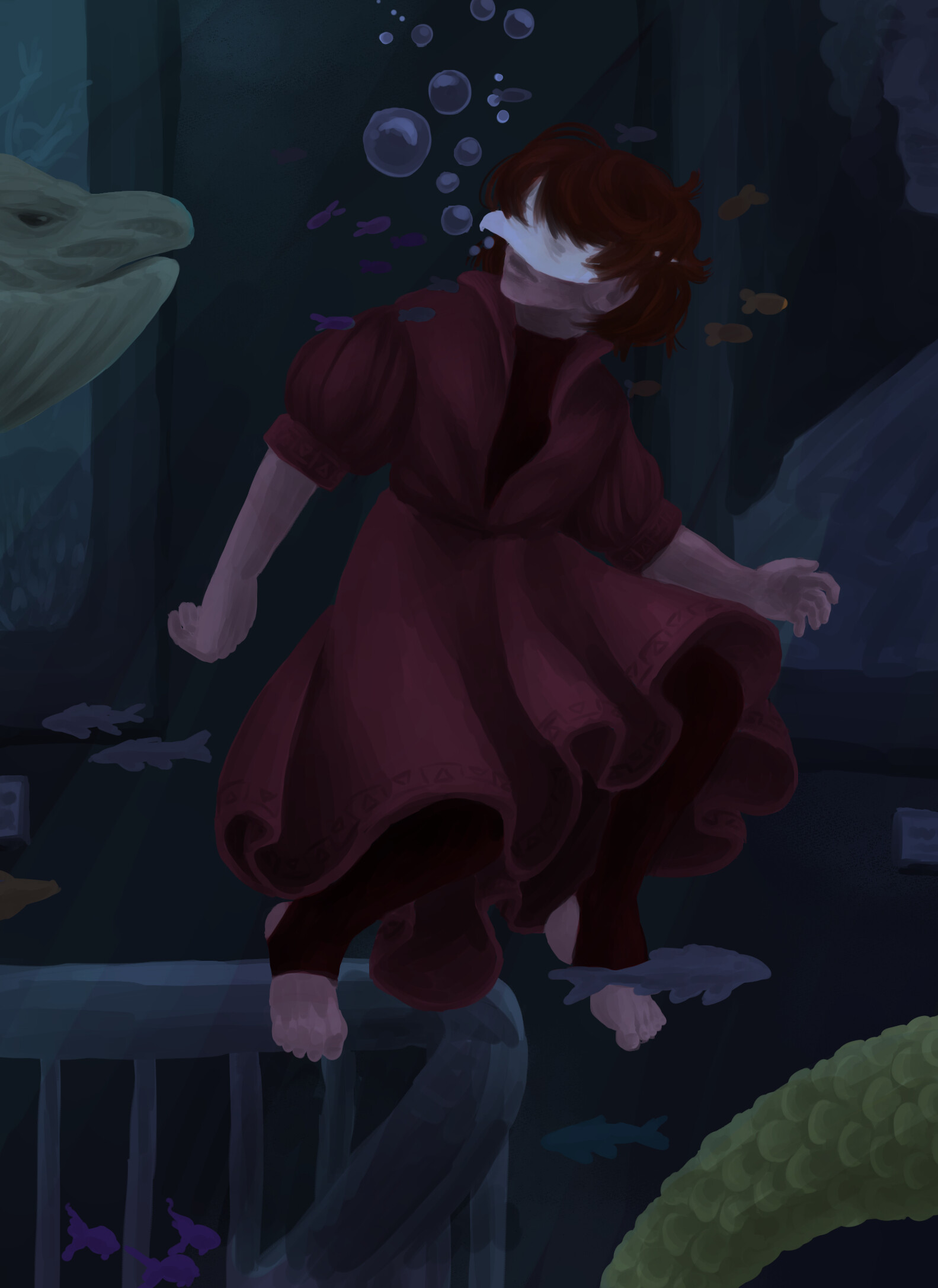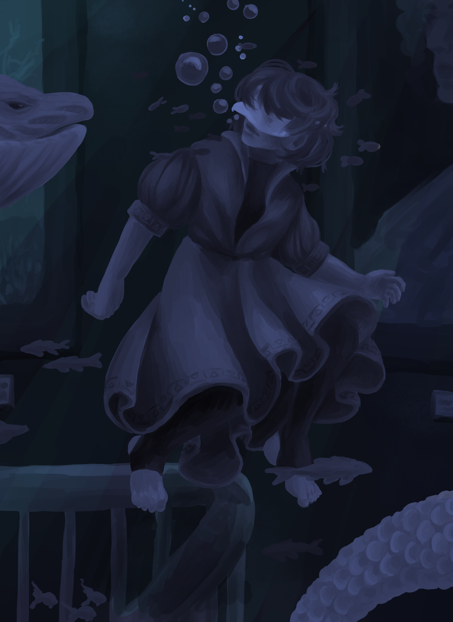 Ich hab dieses Bild nach Grisaille Technik gemalt (also alles in Graustufen und dann mit Farbe drüber), mag es mit Farben aber deutlich weniger als die Version, wo ich nur Blau und Grün verwendet hab ^^" Soll ih lieber noch ein bisshen bei der Farbgebung herumexperimentieren oder gefällt euch auch die (fast) monochrome Version? Ich spiel da aber noch ein bisschen mit Helligkeit / Kontrast herum, weil sie momentan doch recht düster ist :>