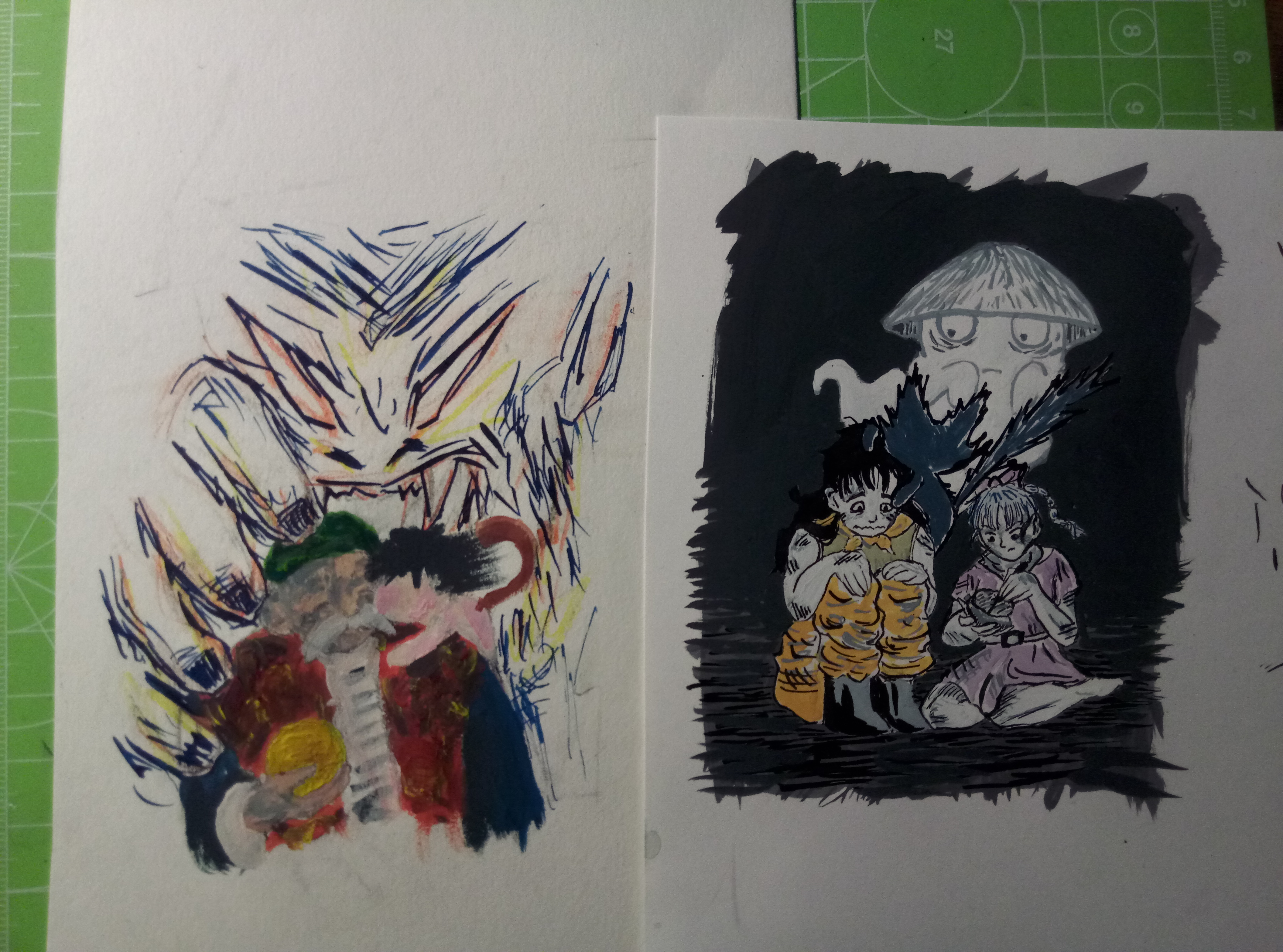 Grandpa Gohan und Baby Goku. Ich würde die Karte gerne so ähnlich gestalten wie eine ältere Karte “Der Cellist” von mir. Also Gohan und Goku mit Gouache einfärben und die Gorillaverwandlung mit Tusche skizzenhaft zeichnen.