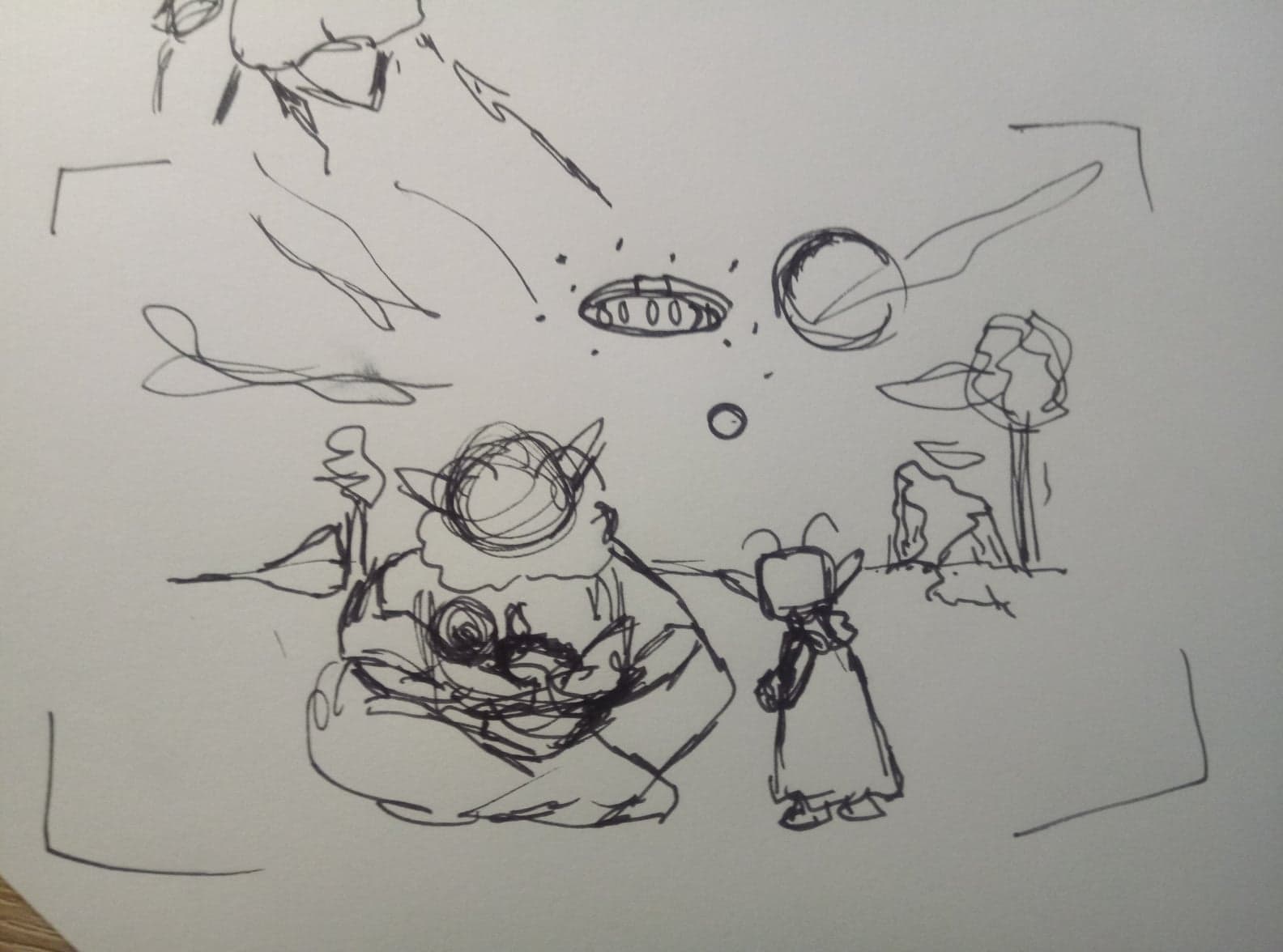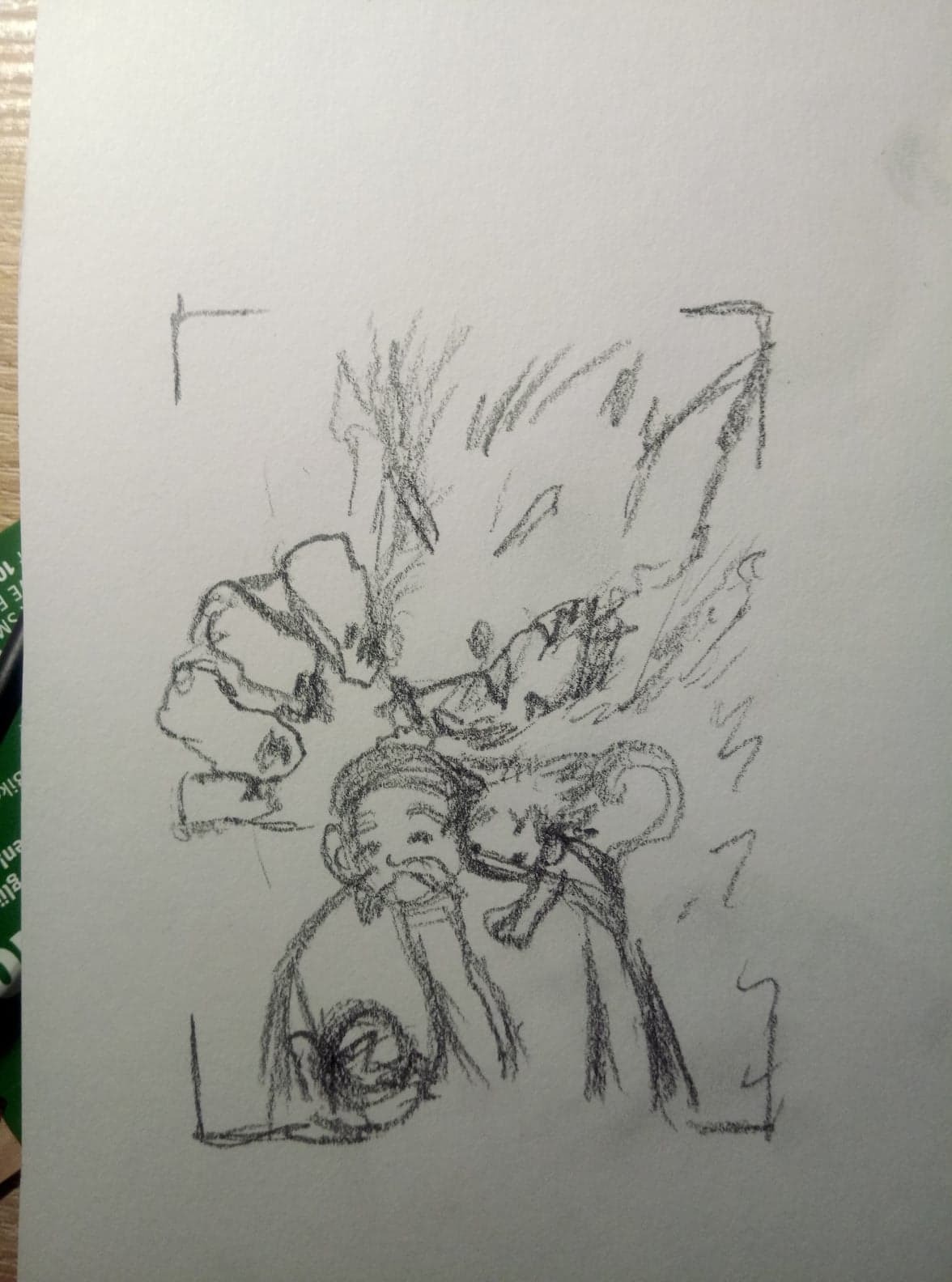 Frieza taucht auf Namek auf! Ich bin mir hier noch nicht sicher mit welchen Materialien ich hier arbeiten möchte… deswegen liegt die Skizze noch nicht auf dem richtigen Papier. Ich dachte zuerst daran hier wieder auf Kork zu malen, aber ich glaube dafür sind doch zu viele Kleinteile drauf und erfahrungsgemäß kann ich nur super grob auf Kork malen. Vielleicht bleibt es dann doch bei mir bei Gouache und Tusche auf Mixed Media Papier.