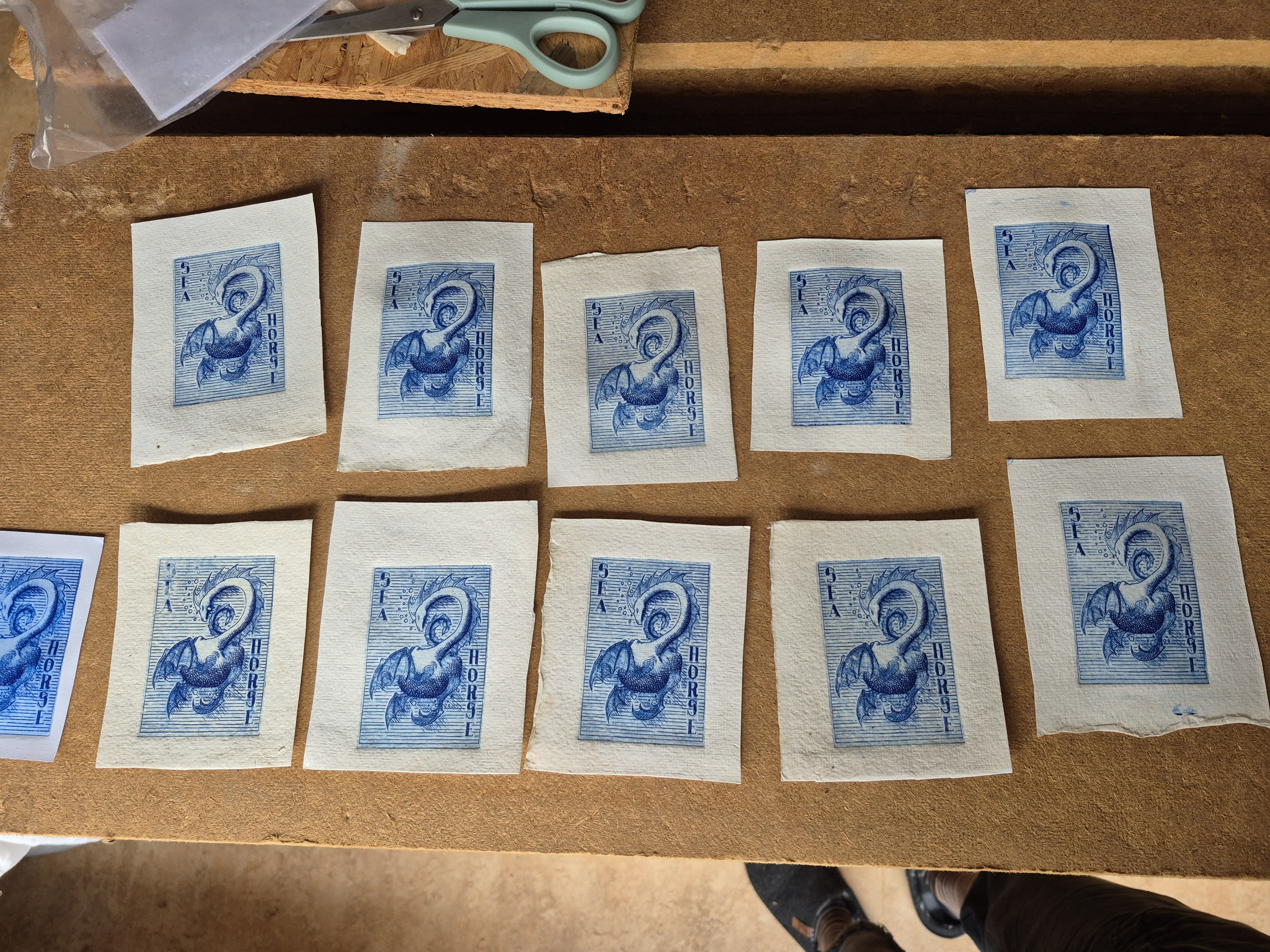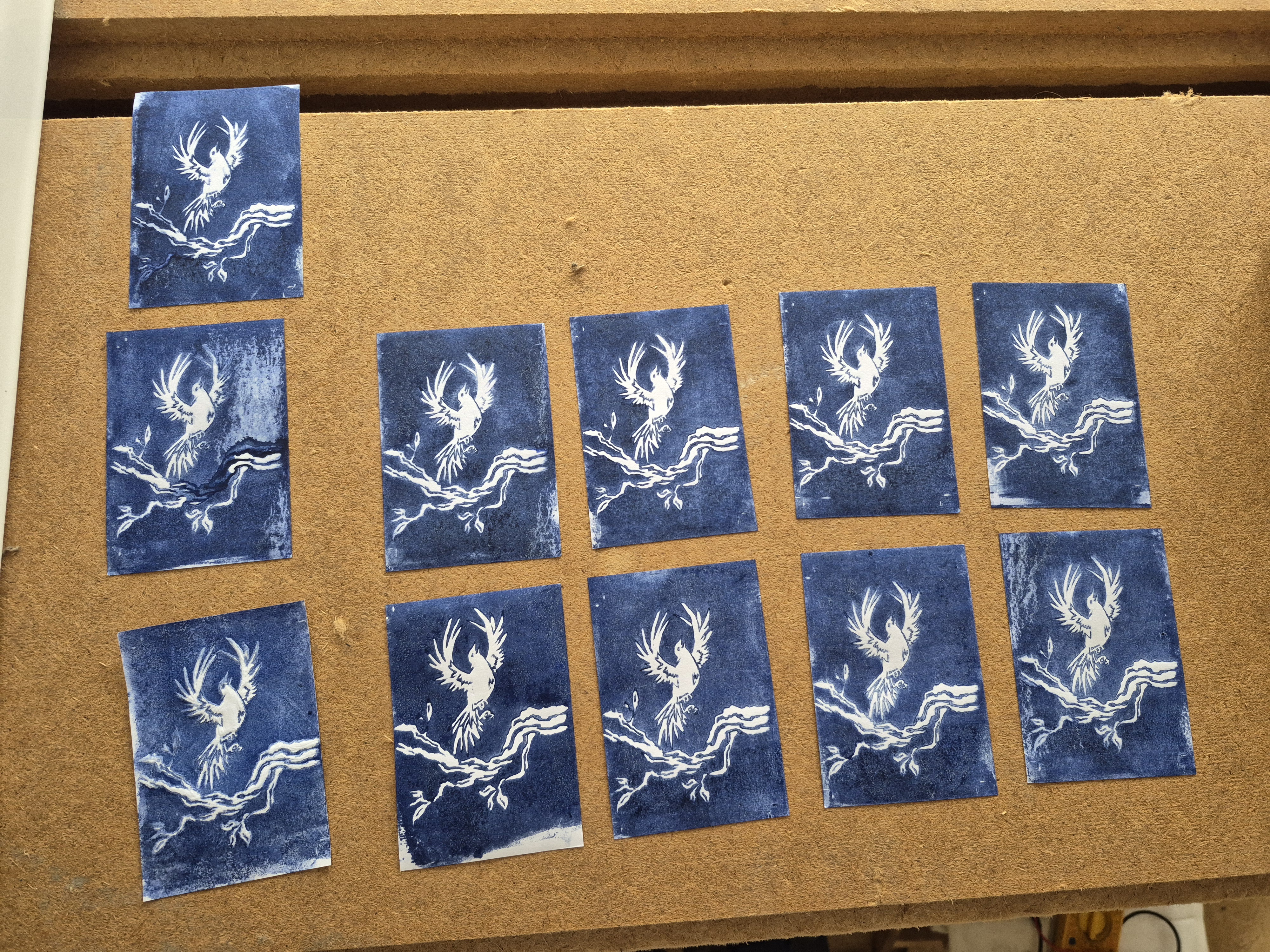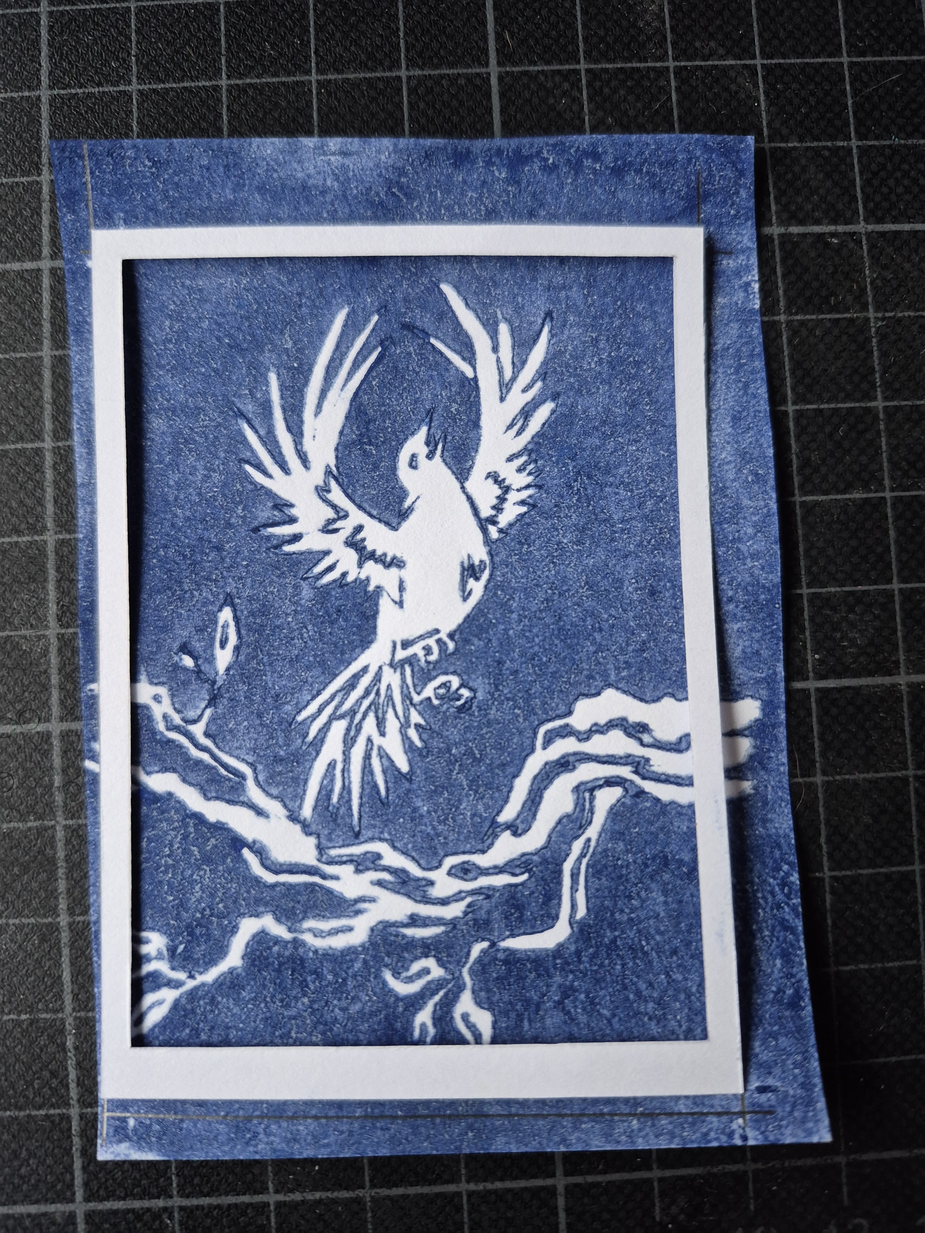 Arg. Ich wollte gerade anfangen mit Zuschneiden und Rückseite drankleben und dabei habe ich festgestellt, dass ich mich bei dem Vogelmotiv in beide Richtungen vermessen hatte. Also beim Schneiden der Markierungen im Linoleum schon. In beide Richtungen stehen die Markierungen ins Motiv.