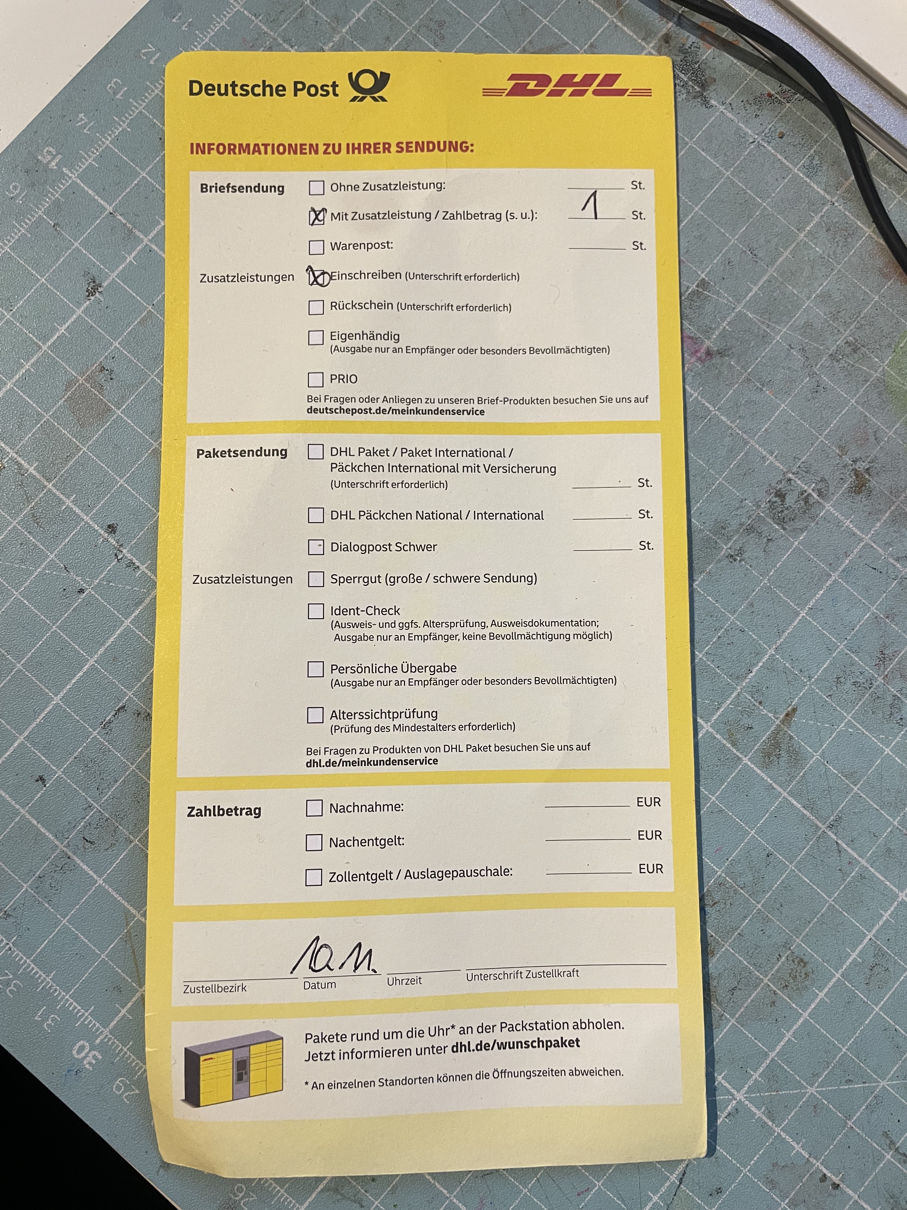 Ich habe die eine PN geschickt, sollte der Ort wo die Sendung liegt nicht auf einem Babberl auf der Rückseite von dem Zettel stehen?