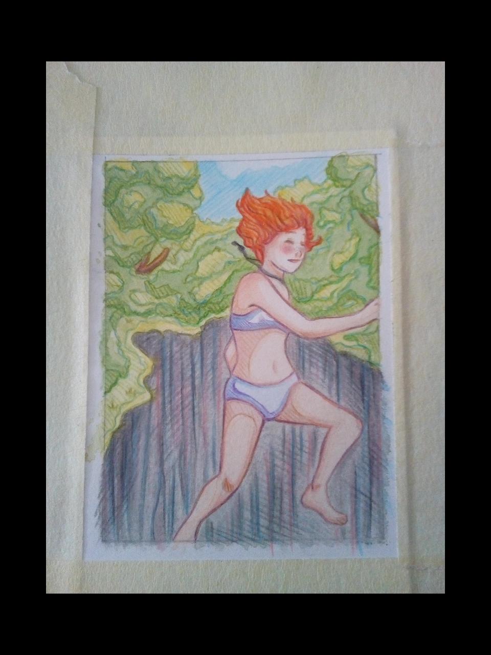 Öhm, ich habe mich gerade voller Tatendrang an meine Koloration gesetzt und will auch gar nicht mehr viel mit Aquarell machen, sondern den Rest mit Buntstiften gestalten. Jetzt passiert vor meinen Augen gerade etwas ziemlich Ätzendes D: Grau habe ich mir aus einem Ockerton und Ultramarin gemischt. Und ich kann gerade beobachten, wie sich einzelne, gut sichtbare blaue Pigmente manifestieren. Das Bild lag ja jetzt ziemlich lange und ich habe vorsichtshalber mal im Vorfeld mit einem trockenen Taschentuch darübergewischt, um eventuelle Staubkörnchen zu entfernen…kann so etwas bei einer nicht 100% sauberen Papieroberfläche passieren? o___o’ schluck Ich werde so gut es geht kaschieren, aber ich befürchte, das wird meine schwächste Karte in dieser Aktion, einfach weil sie mir von Anfang an farblich nicht so leicht von der Hand ging. Naja, mal gucken, was die Buntstifte reißen :’)
