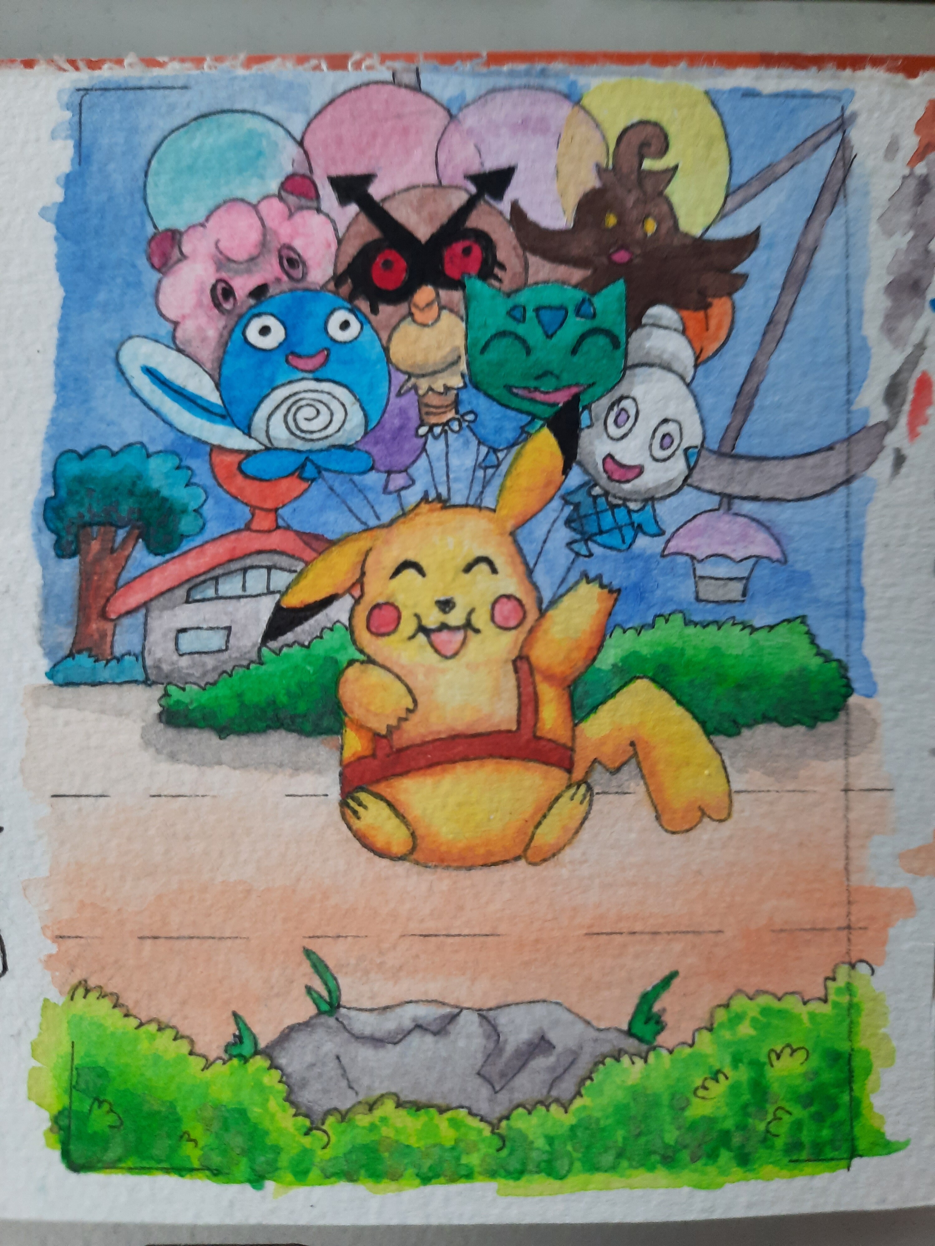 Fliegendes Pikachu: Ich würde mir auf den Luftballons noch ein paar Highlights wünschen - aktuell sehen sie noch ein bisschen flach aus. Im Himmel könntest du vielleicht auch noch ein paar Wolken andeuten, um das Ganze aufzulockern, aber grundsätzlich ist die Karte natürlich zugelassen c: Finde die Szene klasse!