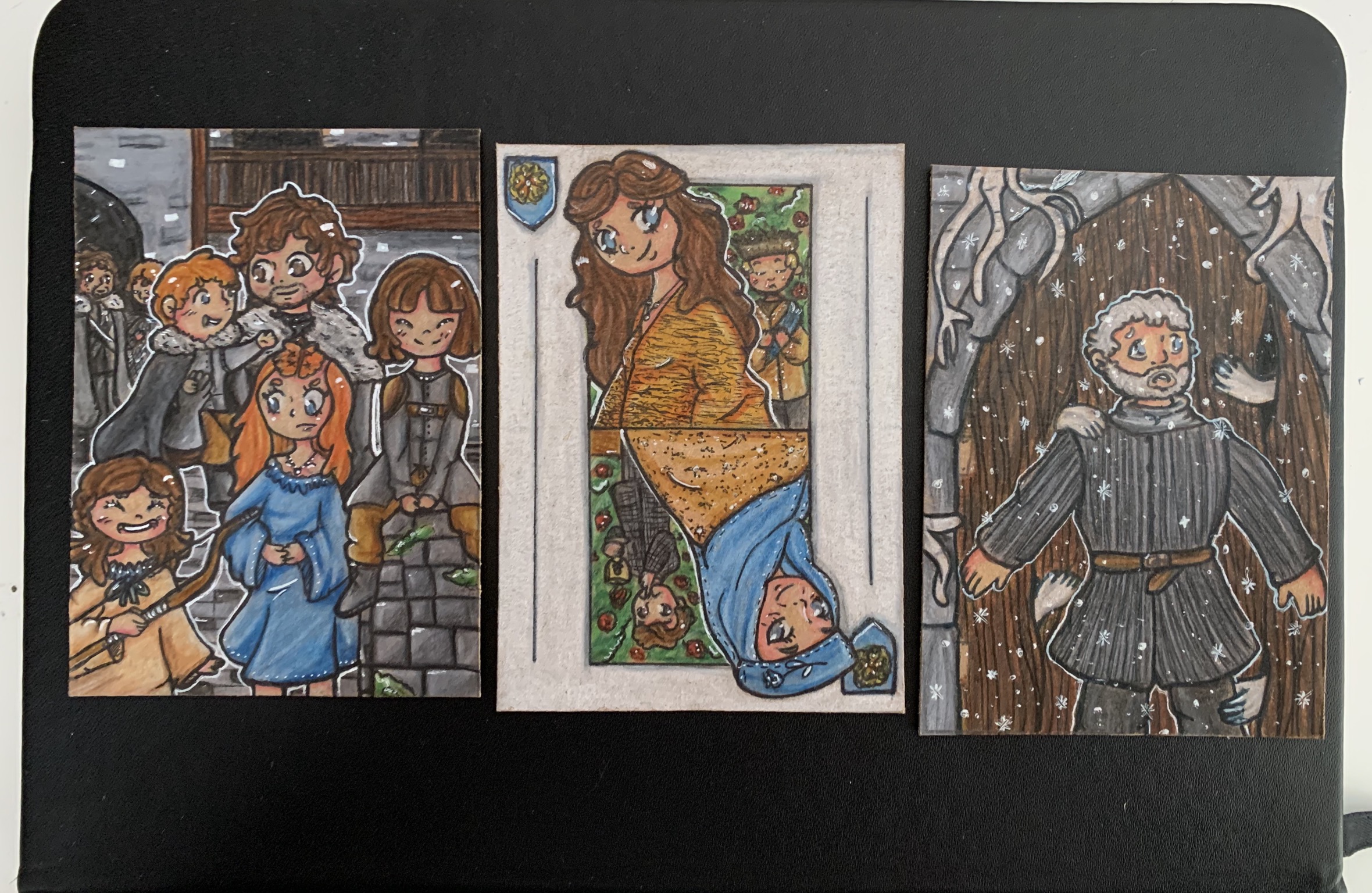 Der Grund weshalb ich noch nicht weiter gekommen bin ist die 3. Karte; denn ich wollte ursprünglich Drogon zeichnen, aber die Posen sind mega schwer und ich habe mich immer wieder erwischt wie ich Referenzen zu sehr abgezeichnet habe. Daher musste ich mich geschlagen geben und will erst diese beiden fertig bekommen, bevor ich mir dann etwas Neues für das letzte Motiv ausdenke. ^^’ Aber ich denke, das müsste ich in 12 Tagen schaffen (: