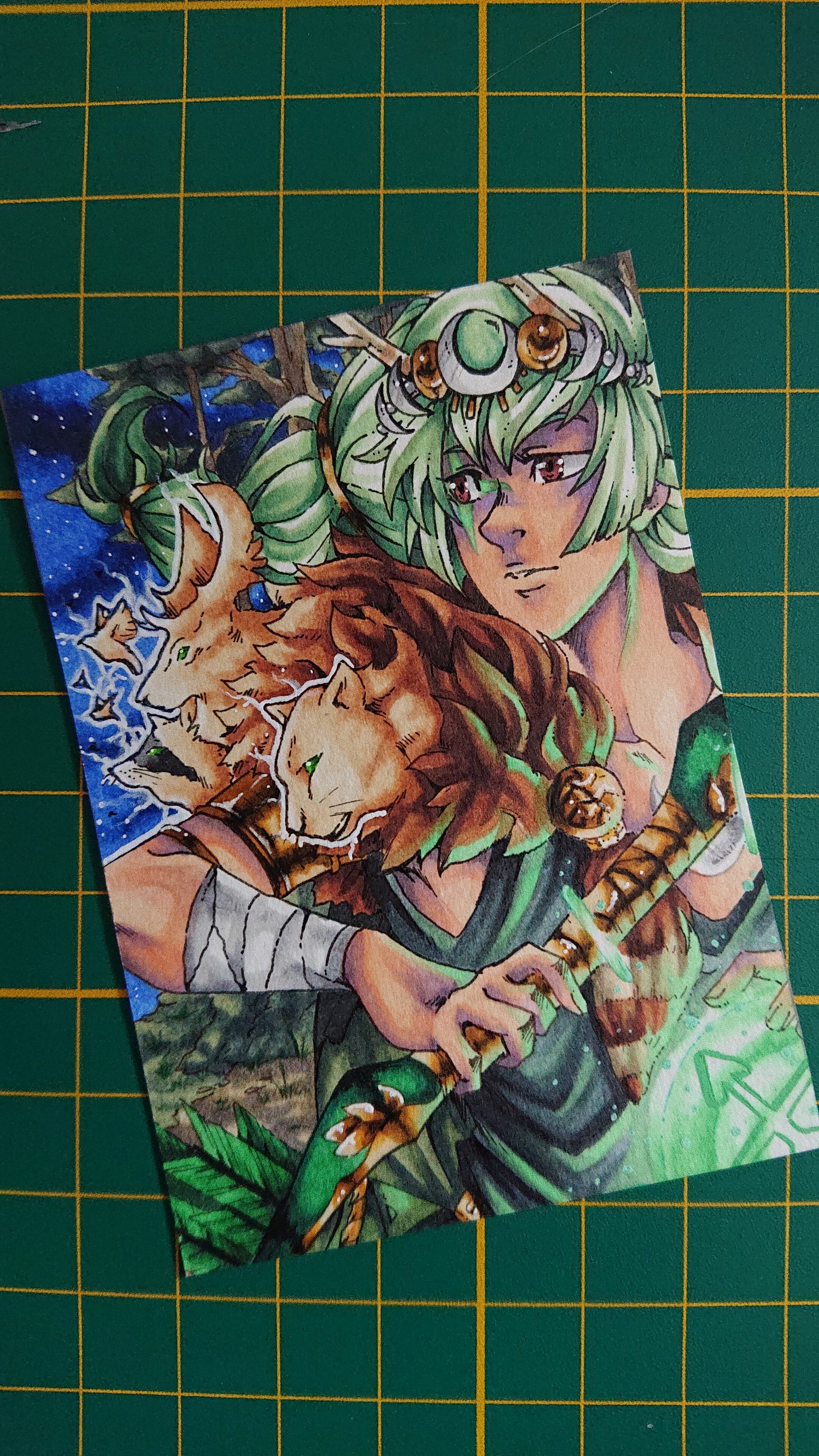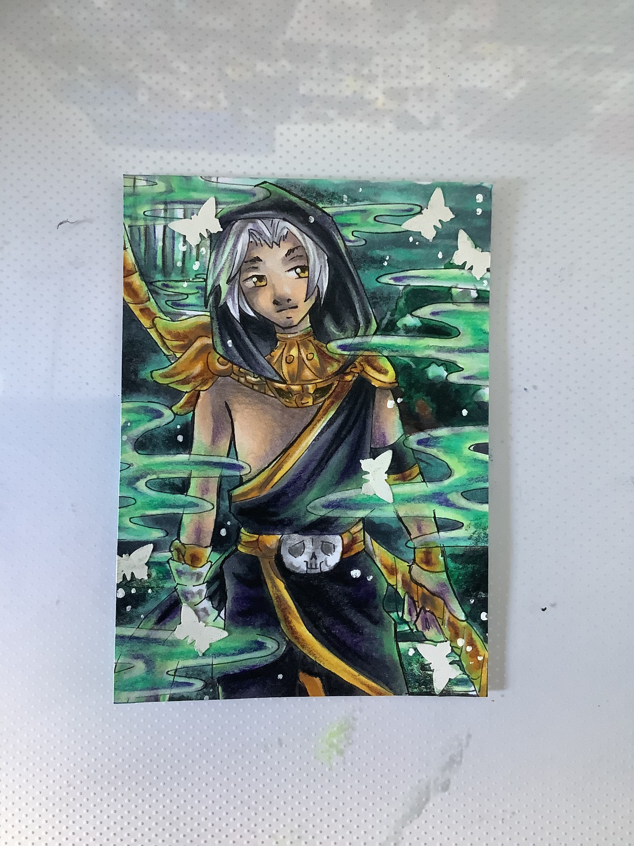 Ist die Karte schon zugeschnitten? Wenn ja, würdest du die weißen Stellen am oberen Rand und neben seiner rechten Hand nochmal überarbeiten? Sie wirken auf mich etwas unabsichtlich.