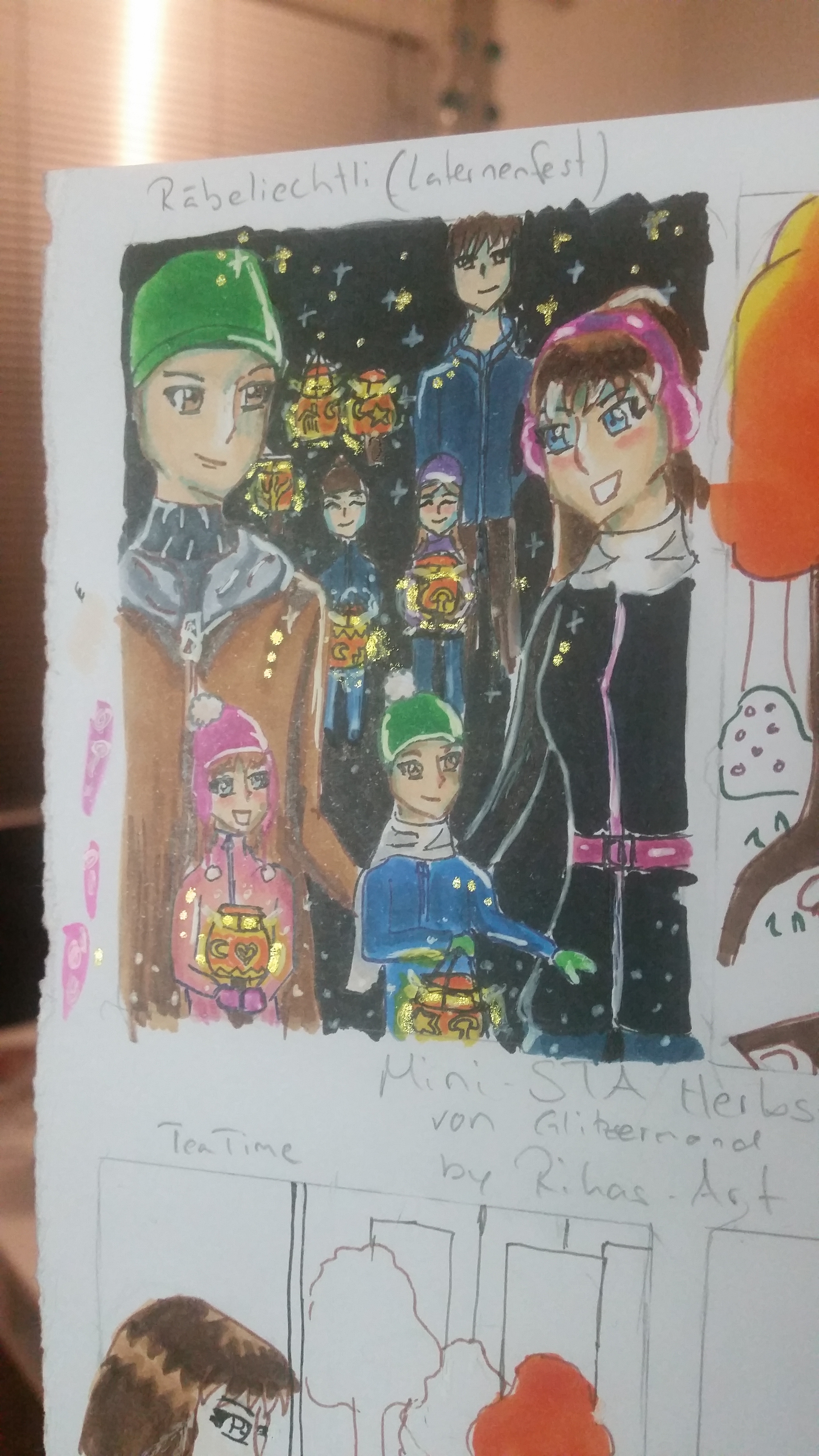 Der schlichte Hintergrund ist auch in Ordnung. Immerhin hast du 7 Charaktere auf so kleiner Fläche untergebracht, da ist es nur verständlich, wenn nicht mehr viel Hintergrund darauf passt;) Außerdem passt eine Sternennacht ja auch klasse zu einem Laternenfest^^